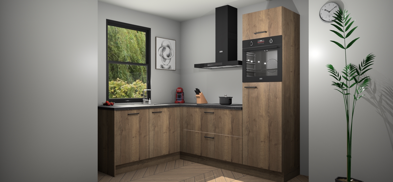 Deze prachtige hoekkeuken heeft alle benodigdheden om uw droomkook- en eetruimte compleet te maken. De Chocolade Eiken kasten bieden een echo van raffinement, terwijl de 5 inbouwapparaten genoeg opties bieden voor het bereiden van heerlijke maaltijden. De oven, inductiekookplaat, afzuigkap, vaatwasser en koelkast zorgen ervoor dat u tijd in de keuken zo efficiënt mogelijk verloopt, terwijl ze ook dat extra vleugje luxe bieden.