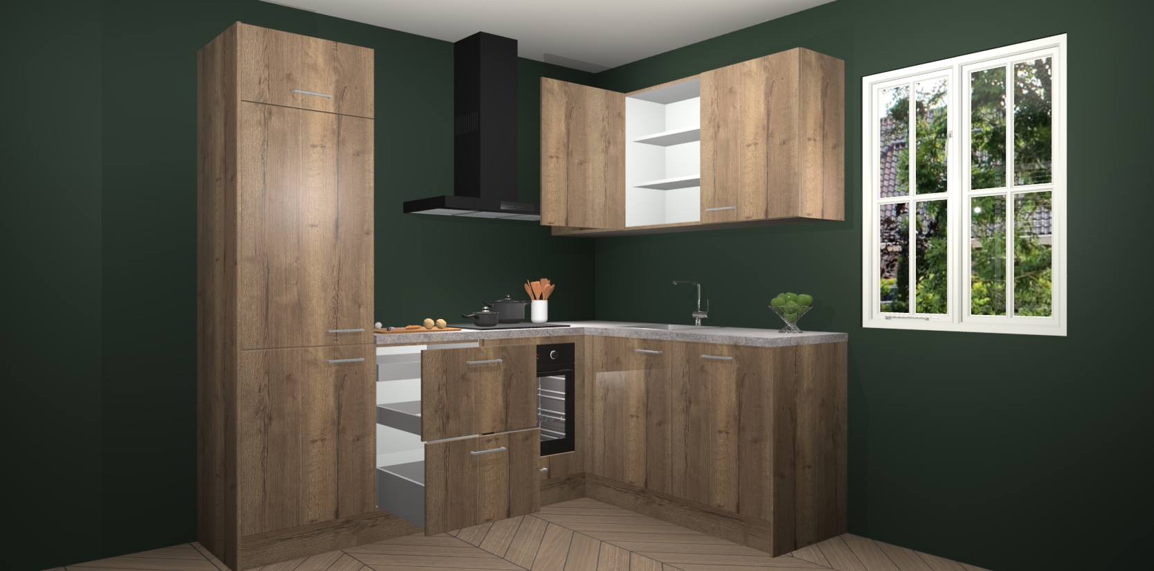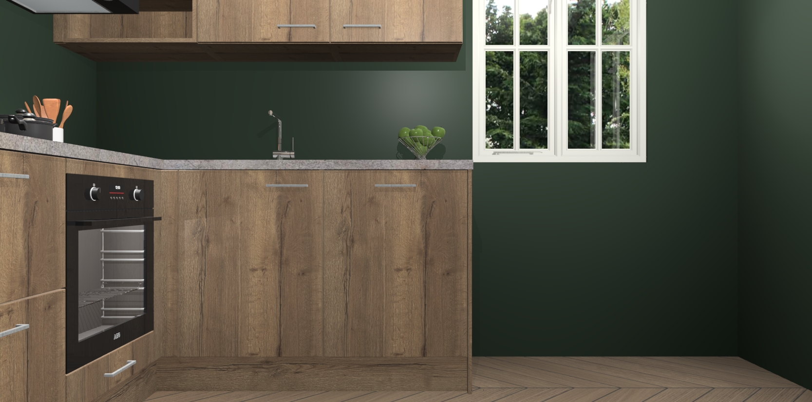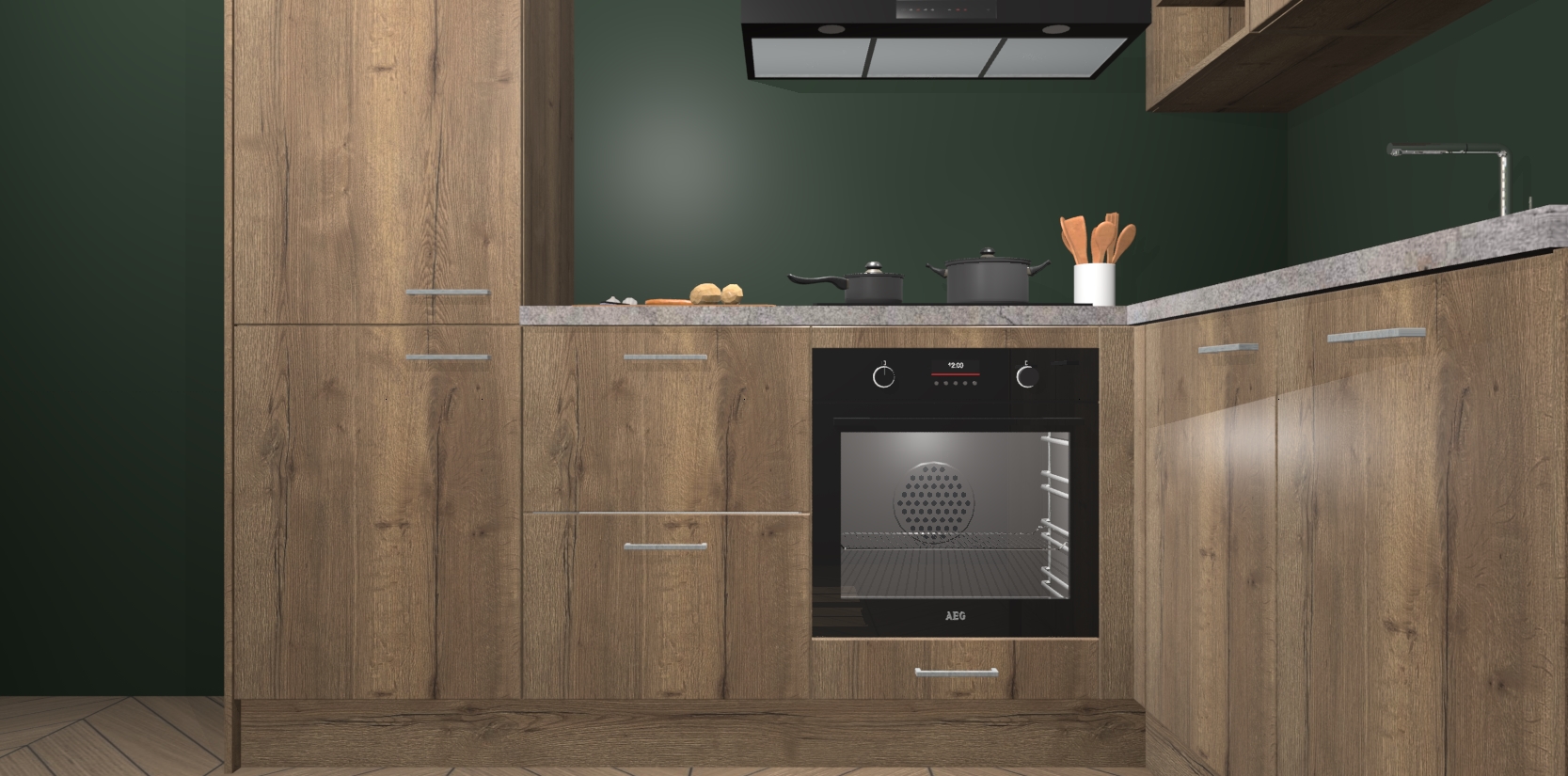 Dit model biedt u voldoende opbergruimte en vijf ingebouwde apparaten: een oven, inductiekookplaat, afzuigkap, vaatwasser en koelkast. Deze apparaten kunnen gemakkelijk worden geüpgrade naar AEG nadat u besteld heeft. De verschillende laden en kastjes bevatten softclose-deuren waardoor ze gezellig dichtvallen met een geruststellend helemaal geruisloos geluid. En dat is nog niet alles! We garanderen ook dat de prijs altijd laag blijft - dus haal nu uw Chocolade Eiken keuken Krakau terwijl het kan.