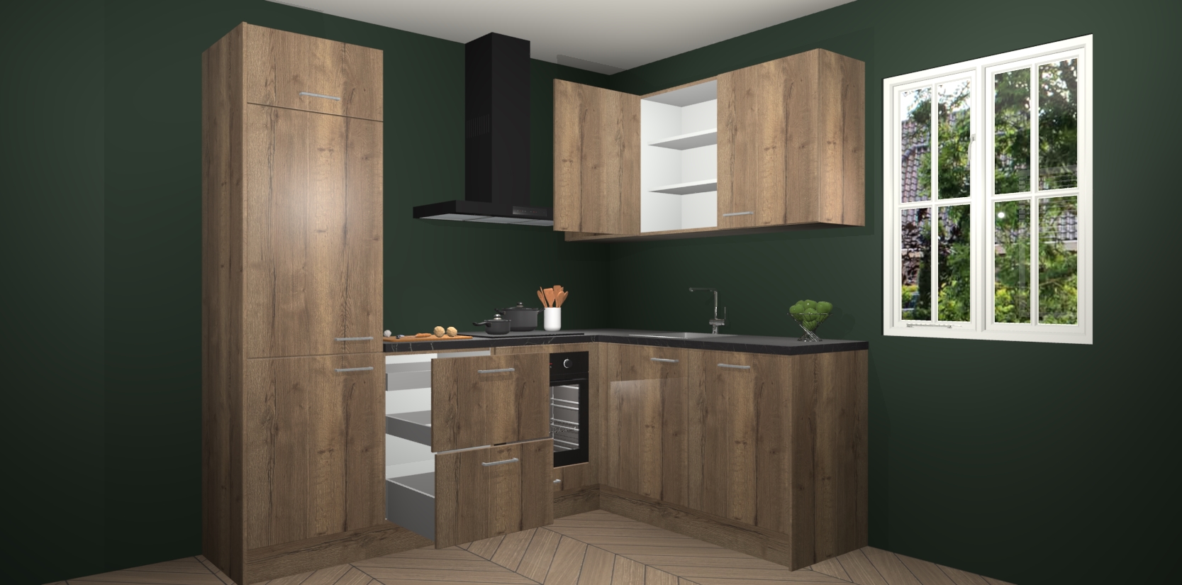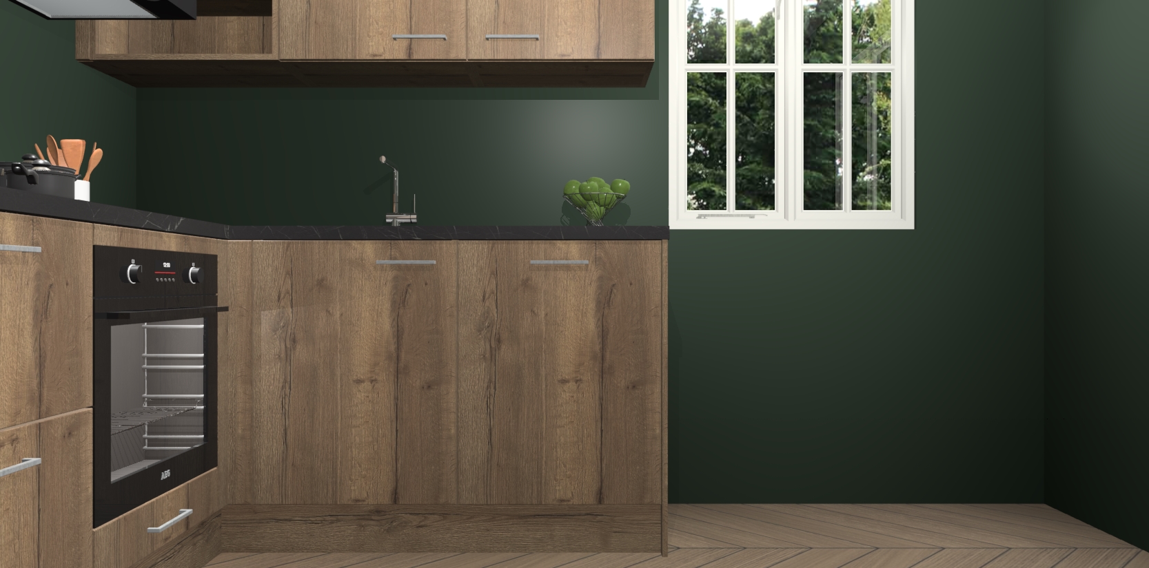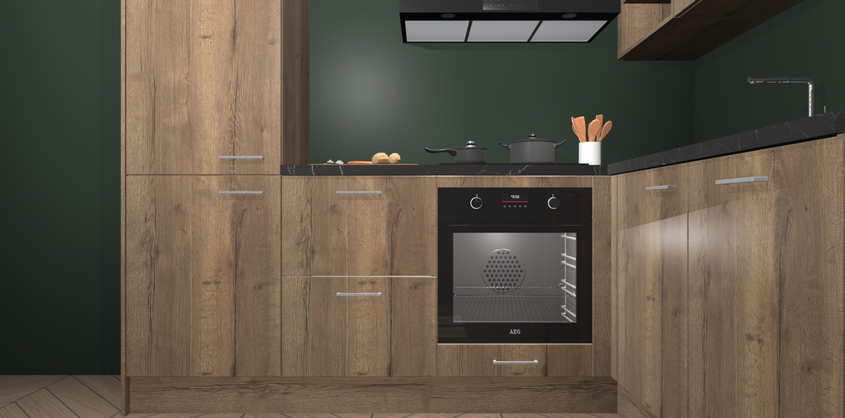 Dit model biedt u voldoende opbergruimte en vijf ingebouwde apparaten: een oven, inductiekookplaat, afzuigkap, vaatwasser en koelkast. Deze apparaten kunnen gemakkelijk worden geüpgrade naar AEG nadat u besteld heeft. De verschillende laden en kastjes bevatten softclose-deuren waardoor ze gezellig dichtvallen met een geruststellend helemaal geruisloos geluid. En dat is nog niet alles! We garanderen ook dat de prijs altijd laag blijft - dus haal nu uw Chocolade Eiken keuken Krakau terwijl het kan.