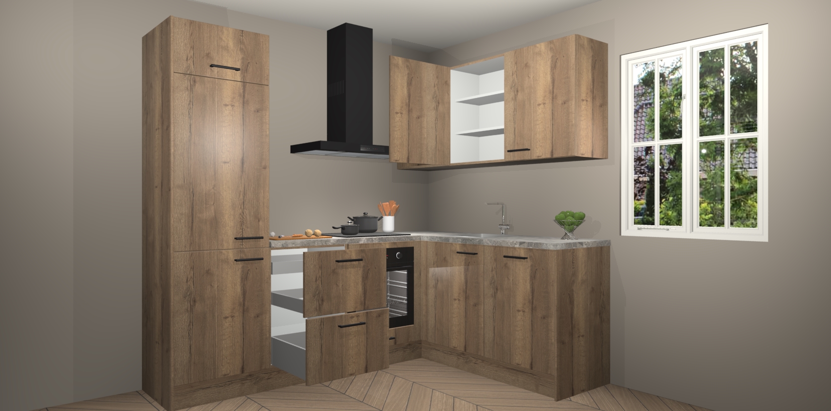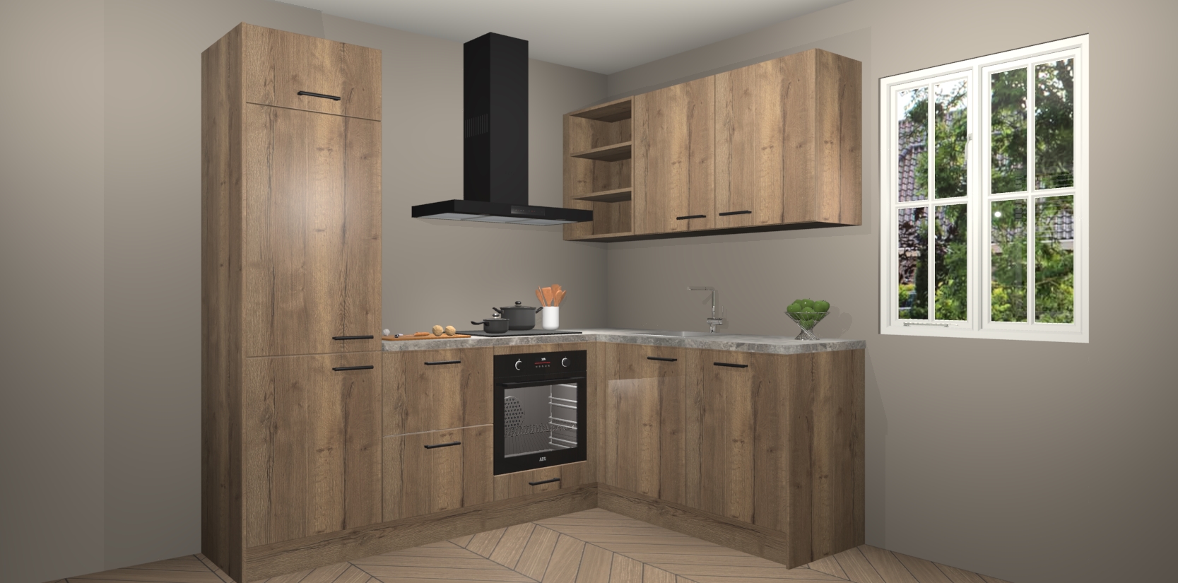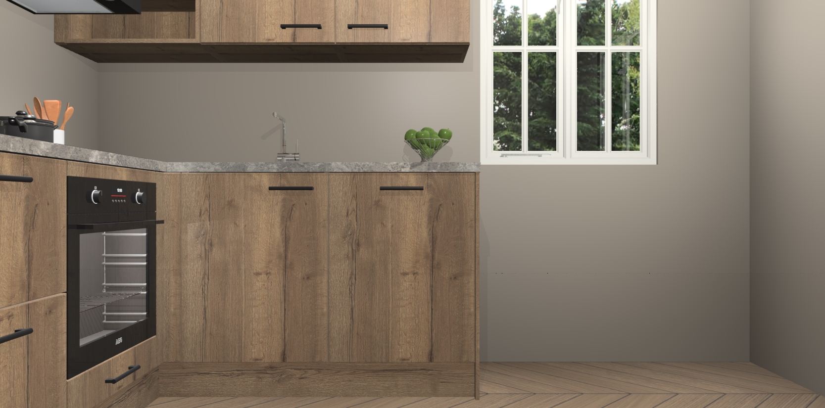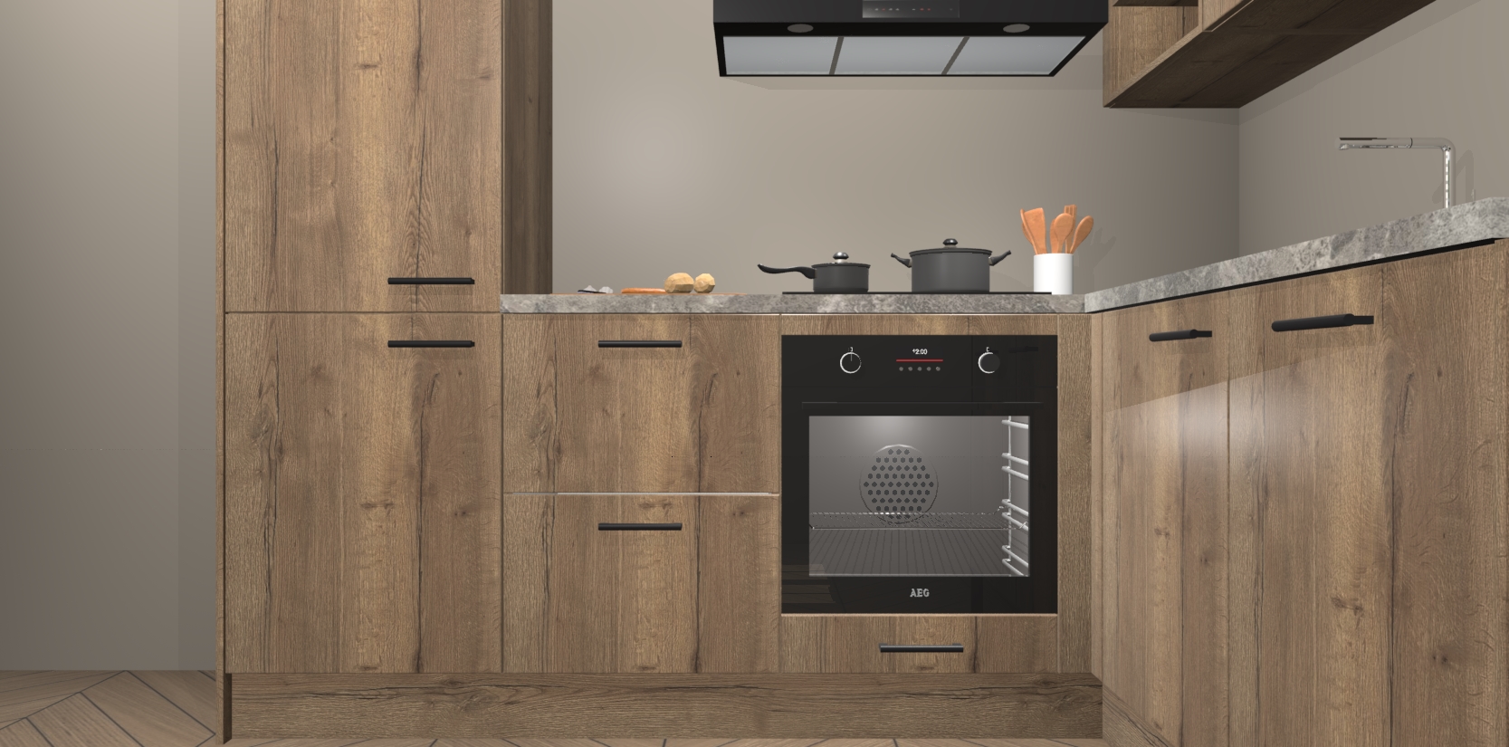 Dit model biedt u voldoende opbergruimte en vijf ingebouwde apparaten: een oven, inductiekookplaat, afzuigkap, vaatwasser en koelkast. Deze apparaten kunnen gemakkelijk worden geüpgrade naar AEG nadat u besteld heeft. De verschillende laden en kastjes bevatten softclose-deuren waardoor ze gezellig dichtvallen met een geruststellend helemaal geruisloos geluid. En dat is nog niet alles! We garanderen ook dat de prijs altijd laag blijft - dus haal nu uw Chocolade Eiken keuken Krakau terwijl het kan.
