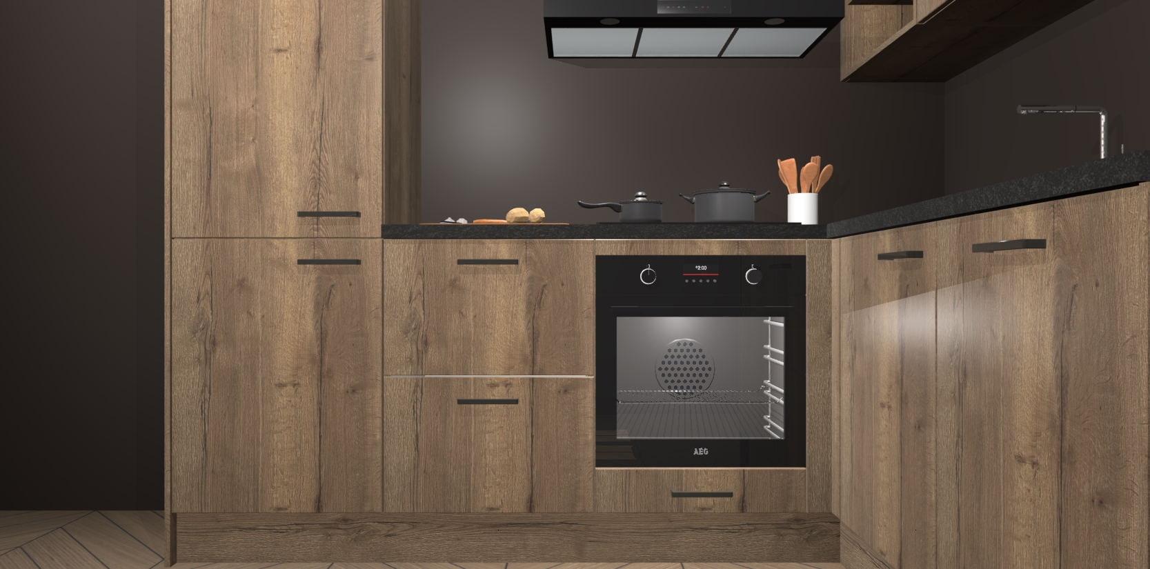 Dit model biedt u voldoende opbergruimte en vijf ingebouwde apparaten: een oven, inductiekookplaat, afzuigkap, vaatwasser en koelkast. Deze apparaten kunnen gemakkelijk worden geüpgrade naar AEG nadat u besteld heeft. De verschillende laden en kastjes bevatten softclose-deuren waardoor ze gezellig dichtvallen met een geruststellend helemaal geruisloos geluid. En dat is nog niet alles! We garanderen ook dat de prijs altijd laag blijft - dus haal nu uw Chocolade Eiken keuken Krakau terwijl het kan.
