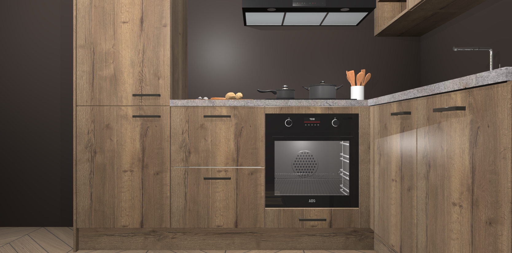 Dit model biedt u voldoende opbergruimte en vijf ingebouwde apparaten: een oven, inductiekookplaat, afzuigkap, vaatwasser en koelkast. Deze apparaten kunnen gemakkelijk worden geüpgrade naar AEG nadat u besteld heeft. De verschillende laden en kastjes bevatten softclose-deuren waardoor ze gezellig dichtvallen met een geruststellend helemaal geruisloos geluid. En dat is nog niet alles! We garanderen ook dat de prijs altijd laag blijft - dus haal nu uw Chocolade Eiken keuken Krakau terwijl het kan.