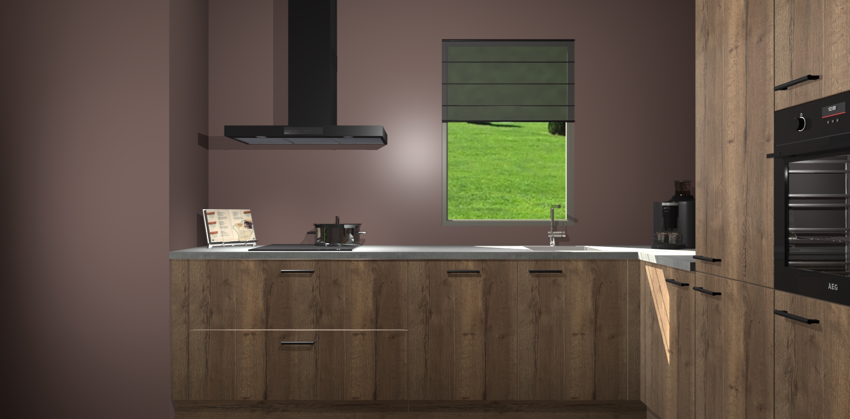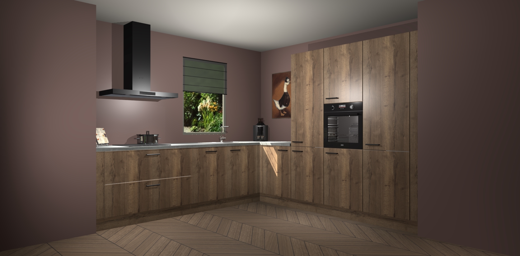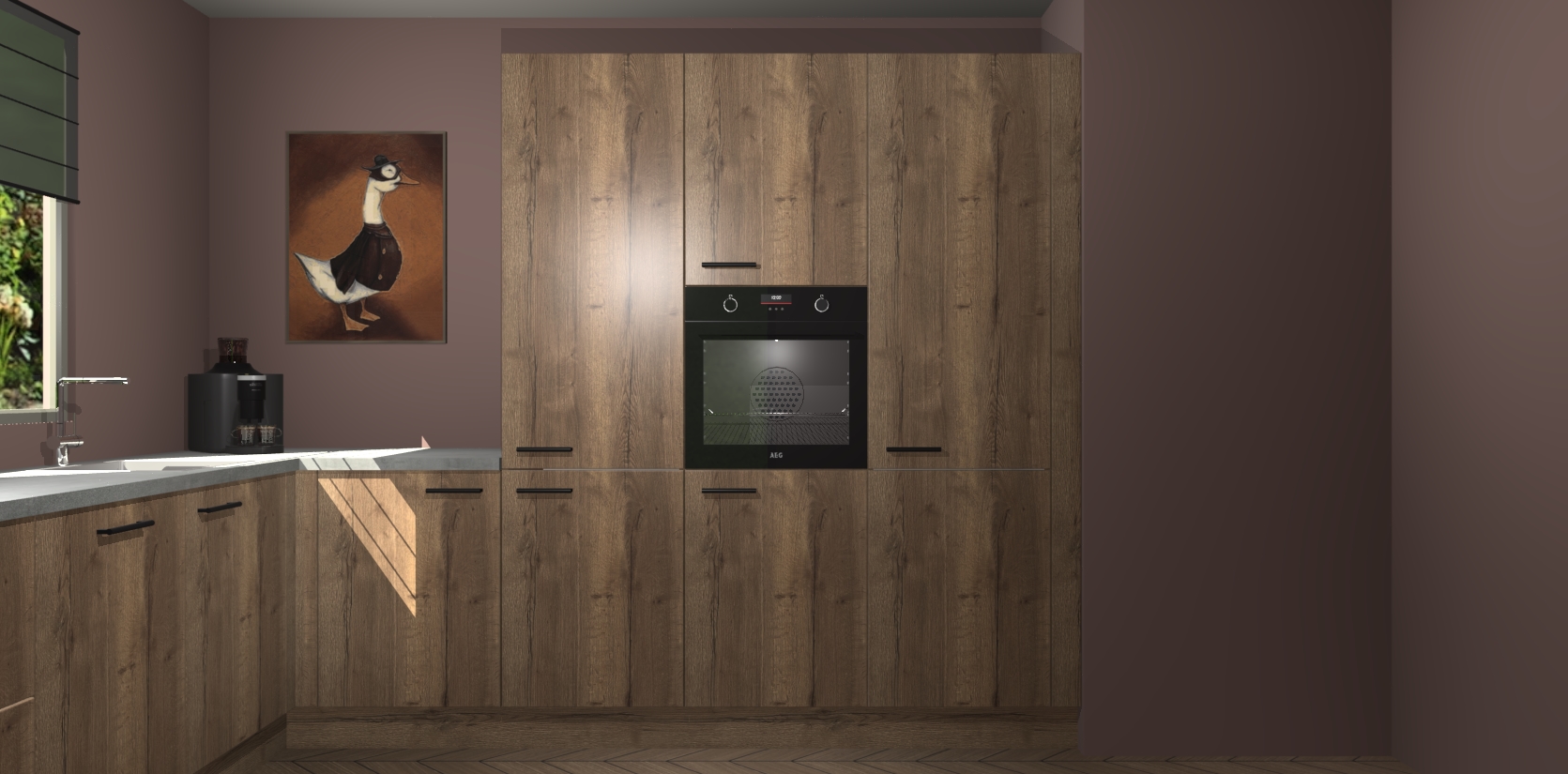 Welkom bij de Chocolade Eiken keuken Laos. Deze prachtige keuken zal de komende jaren het middelpunt van de belangstelling in uw huis zijn. Uitgerust met vijf inbouwapparaten komt u nooit kookgereedschap tekort. Bovendien geeft de warme houtlook elke ruimte een uitnodigende en tijdloze uitstraling.