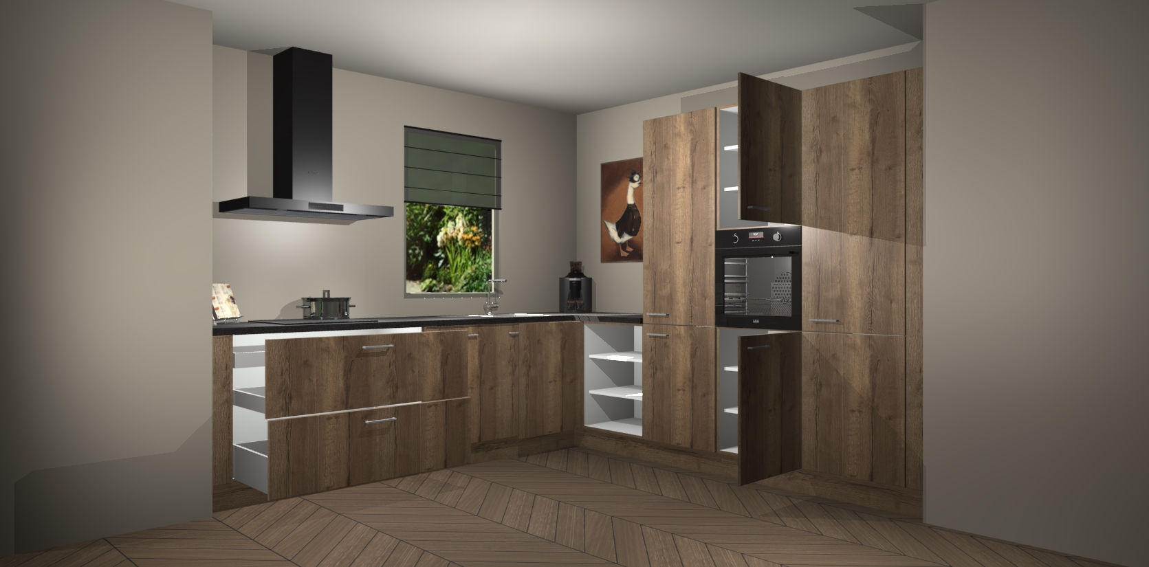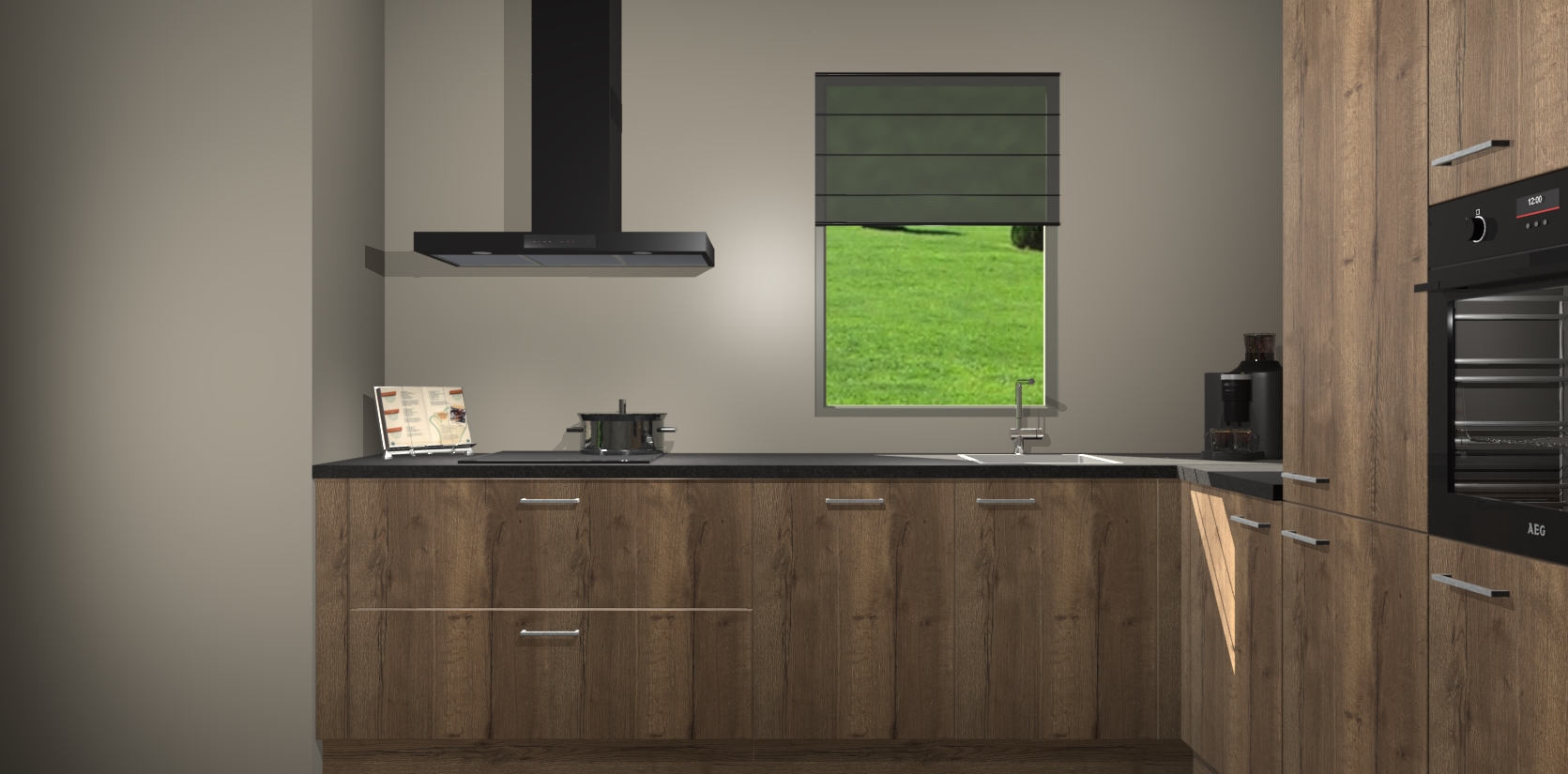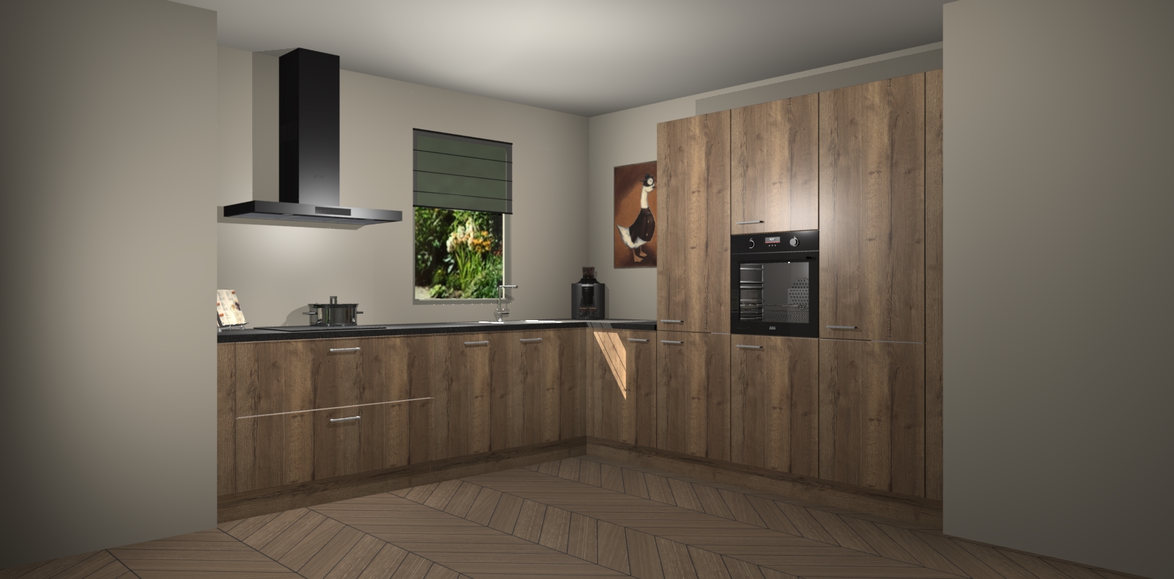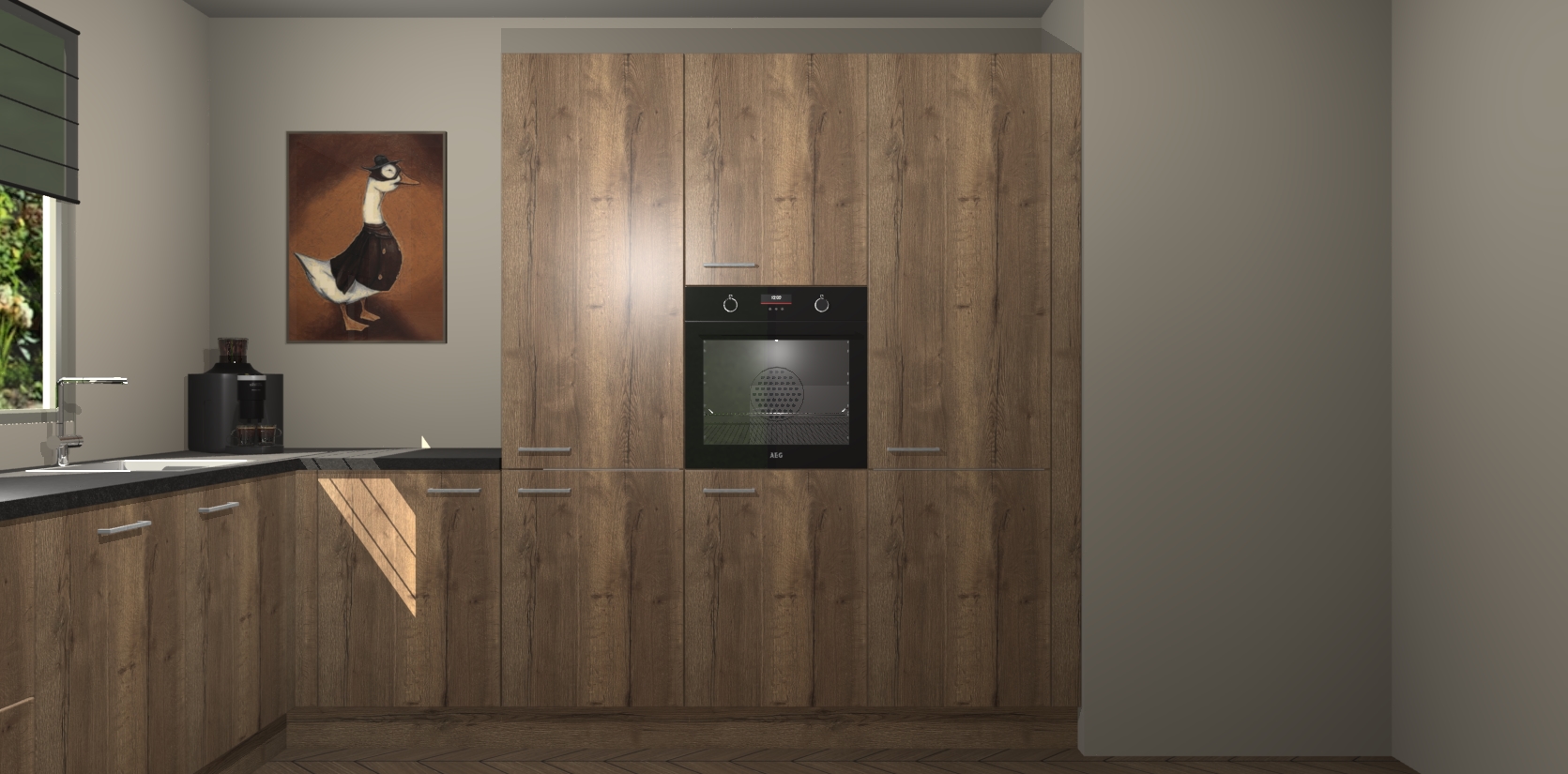 Welkom bij de Chocolade Eiken keuken Laos. Deze prachtige keuken zal de komende jaren het middelpunt van de belangstelling in uw huis zijn. Uitgerust met vijf inbouwapparaten komt u nooit kookgereedschap tekort. Bovendien geeft de warme houtlook elke ruimte een uitnodigende en tijdloze uitstraling.