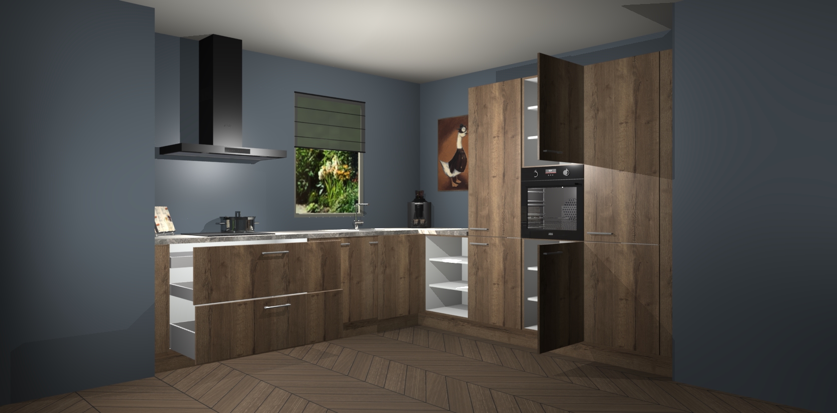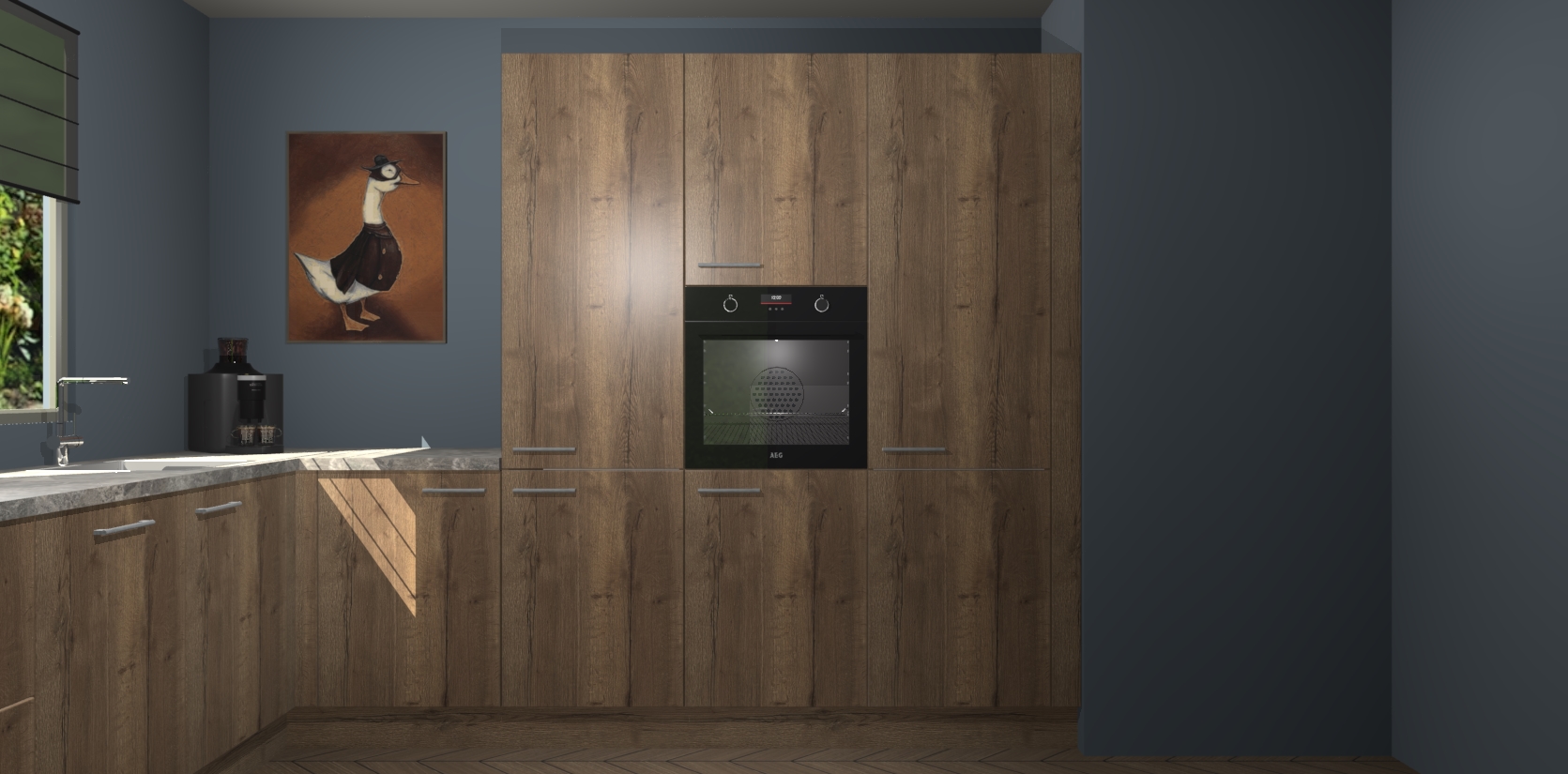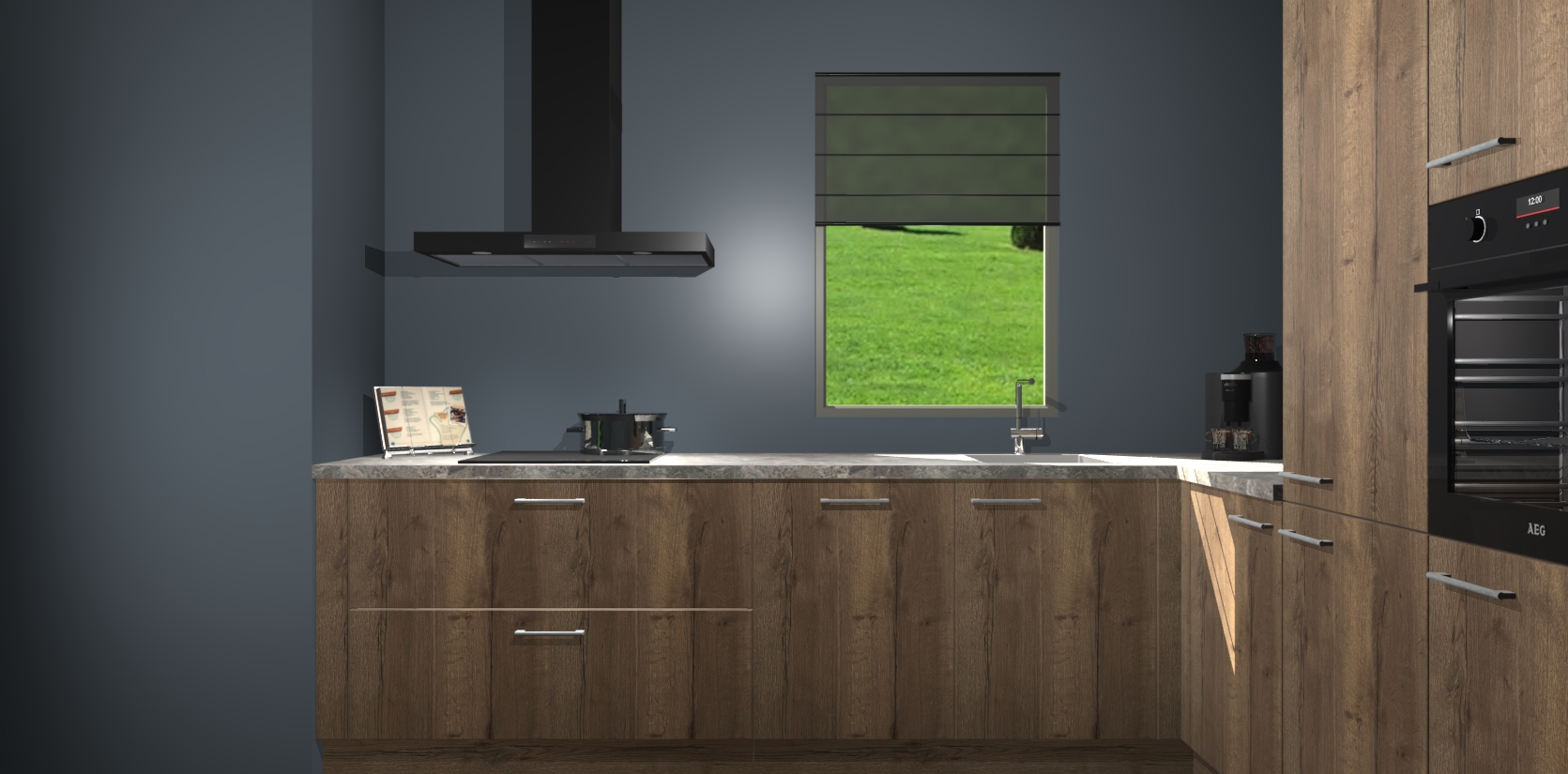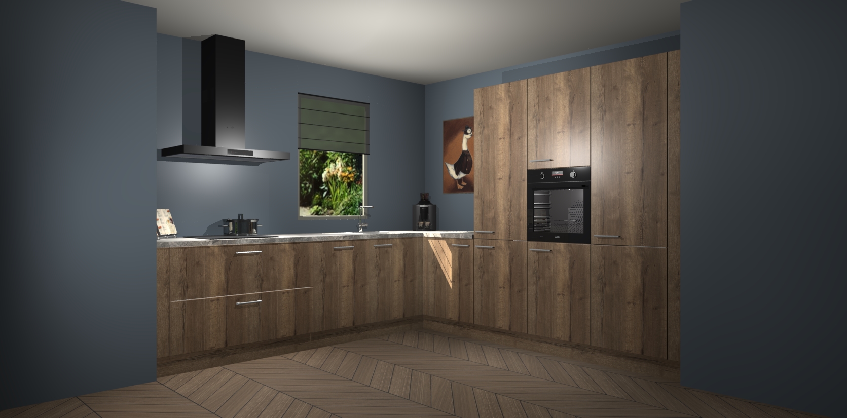 Welkom bij de Chocolade Eiken keuken Laos. Deze prachtige keuken zal de komende jaren het middelpunt van de belangstelling in uw huis zijn. Uitgerust met vijf inbouwapparaten komt u nooit kookgereedschap tekort. Bovendien geeft de warme houtlook elke ruimte een uitnodigende en tijdloze uitstraling.