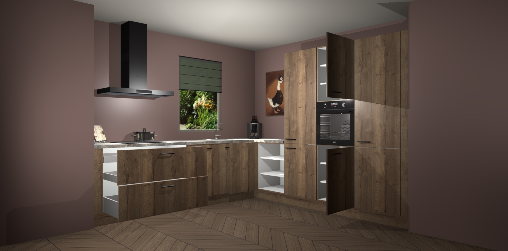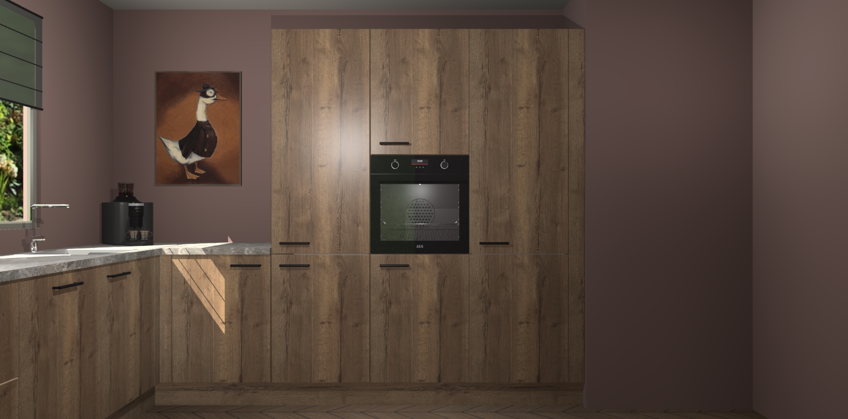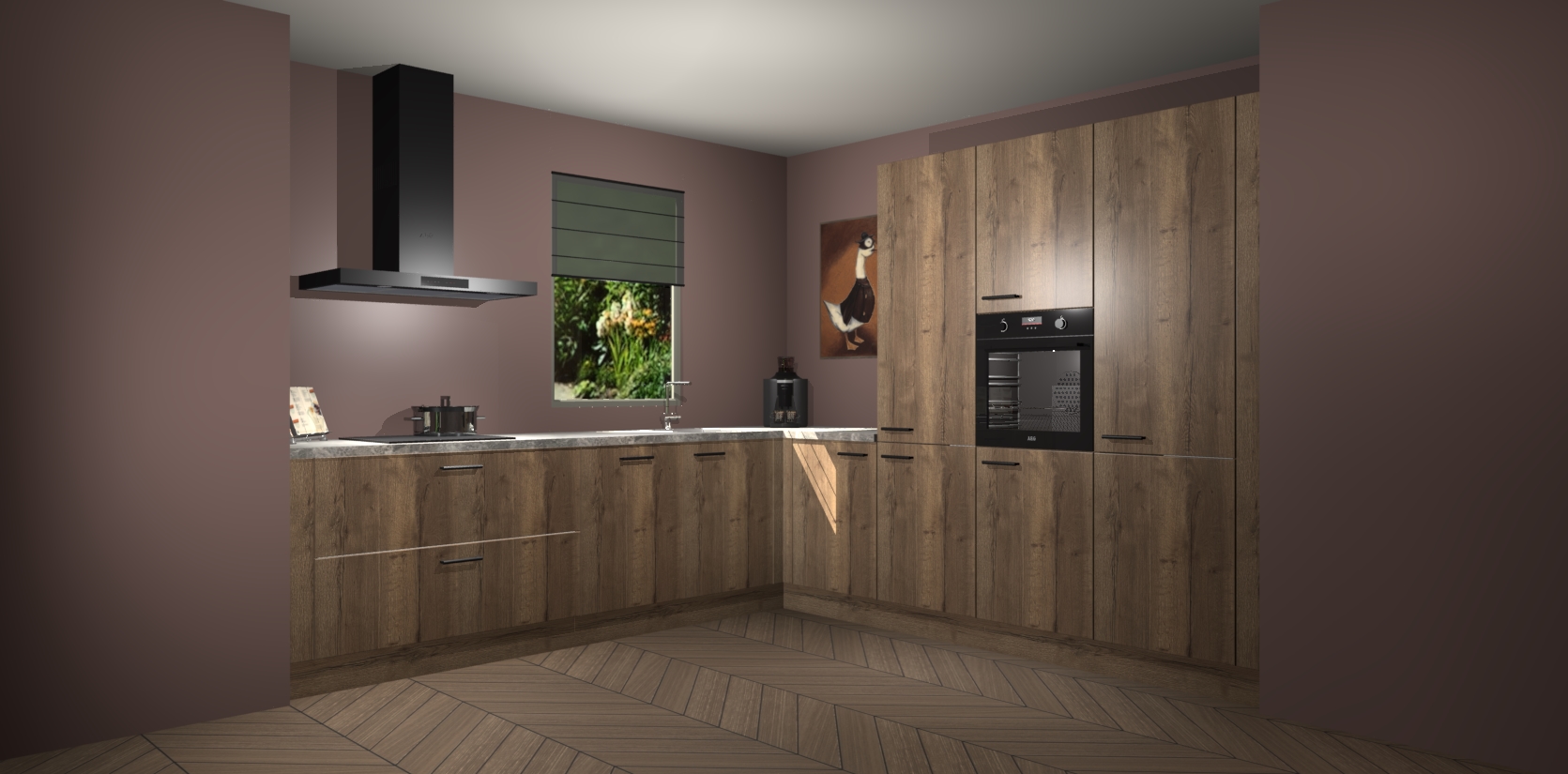 Welkom bij de Chocolade Eiken keuken Laos. Deze prachtige keuken zal de komende jaren het middelpunt van de belangstelling in uw huis zijn. Uitgerust met vijf inbouwapparaten komt u nooit kookgereedschap tekort. Bovendien geeft de warme houtlook elke ruimte een uitnodigende en tijdloze uitstraling.