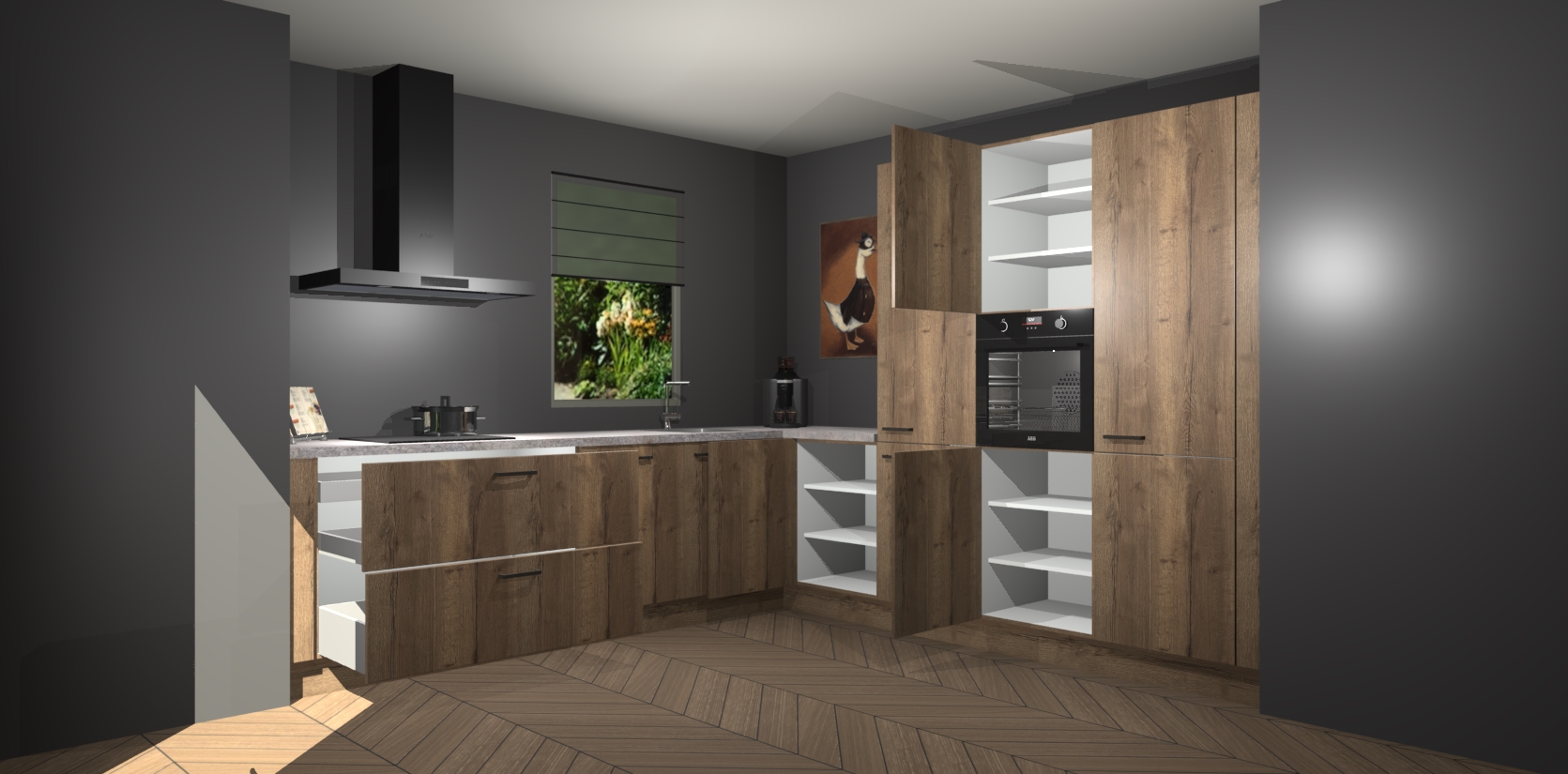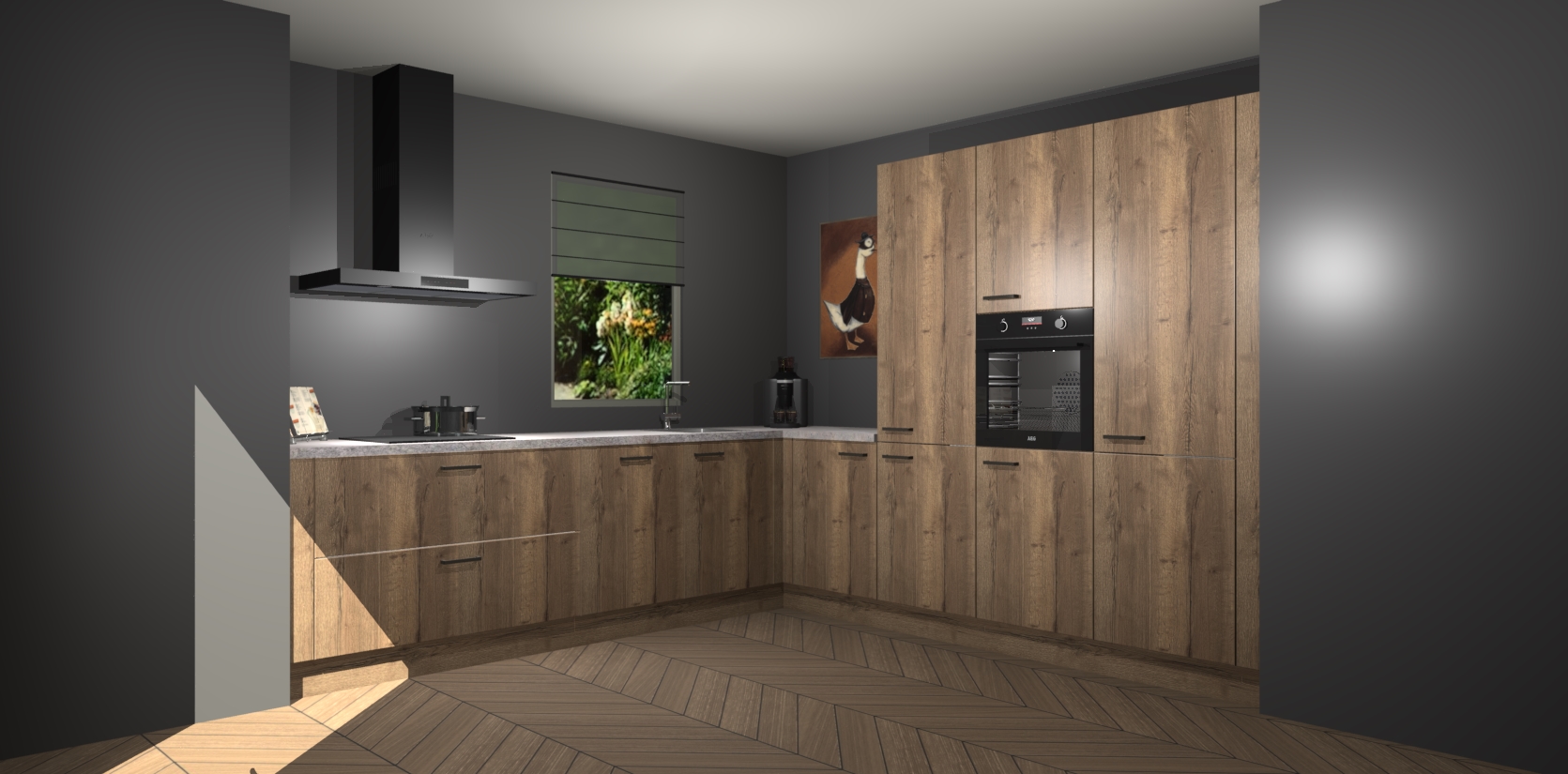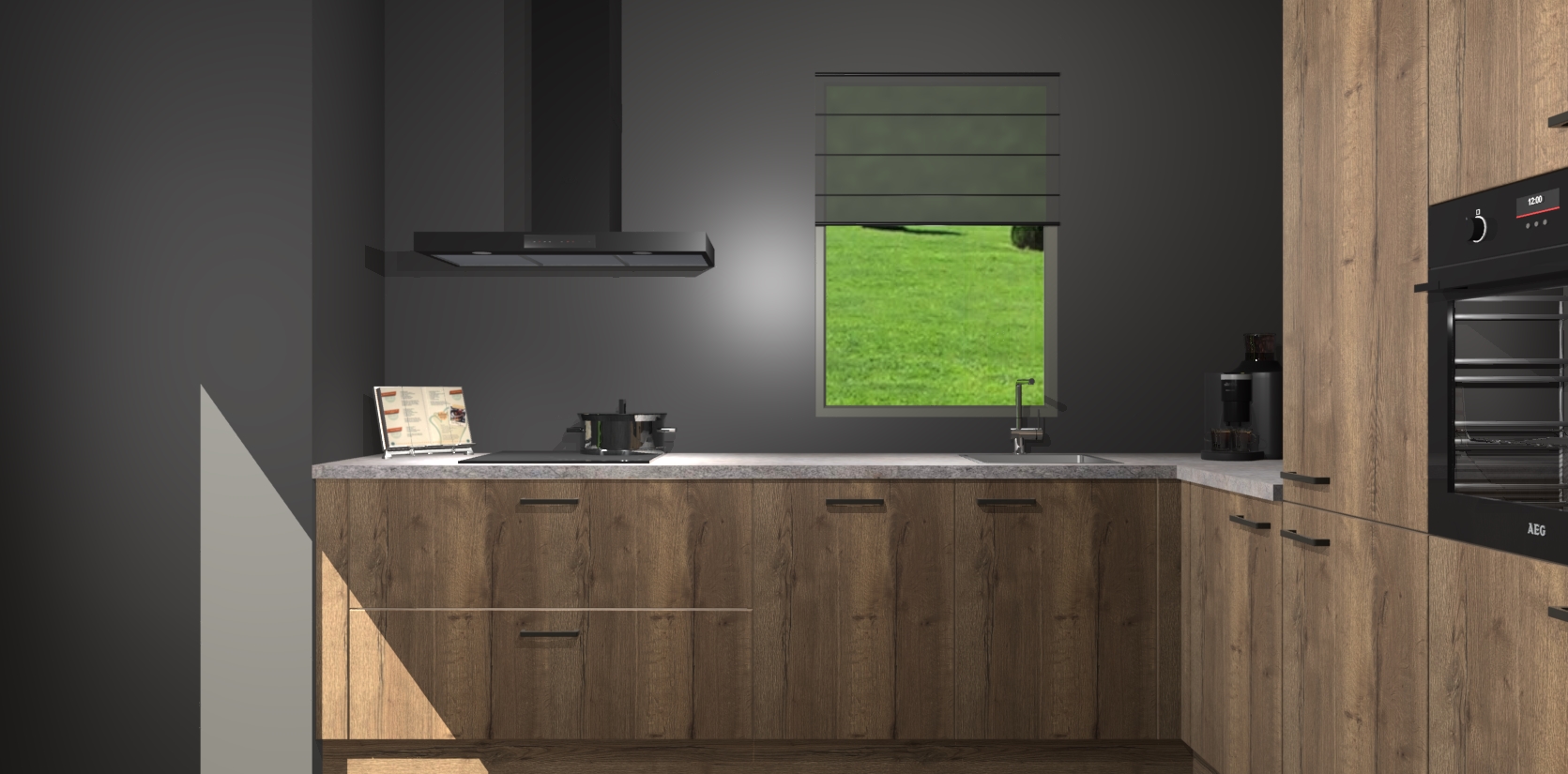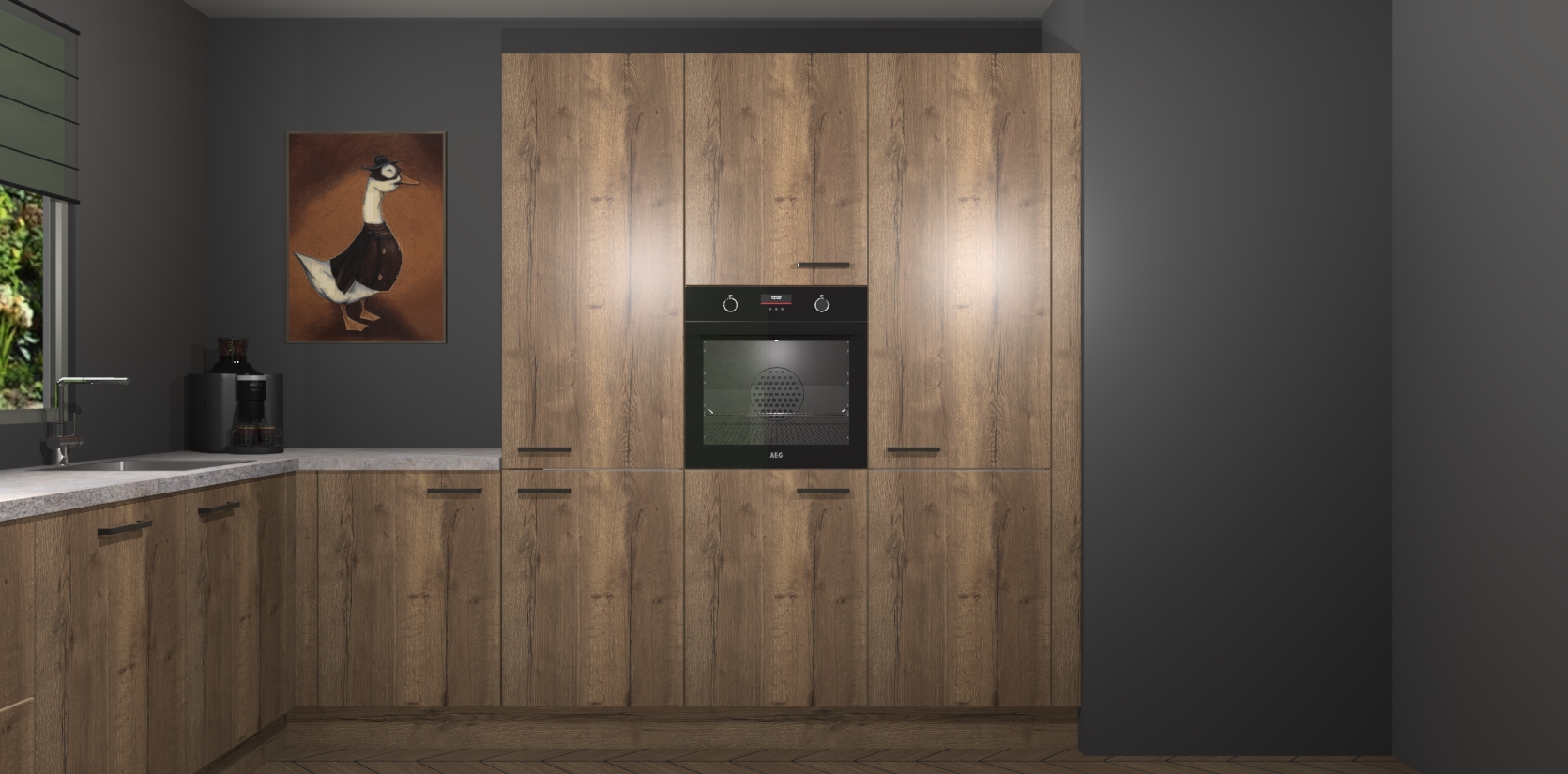 Welkom bij de Chocolade Eiken keuken Laos. Deze prachtige keuken zal de komende jaren het middelpunt van de belangstelling in uw huis zijn. Uitgerust met vijf inbouwapparaten komt u nooit kookgereedschap tekort. Bovendien geeft de warme houtlook elke ruimte een uitnodigende en tijdloze uitstraling.