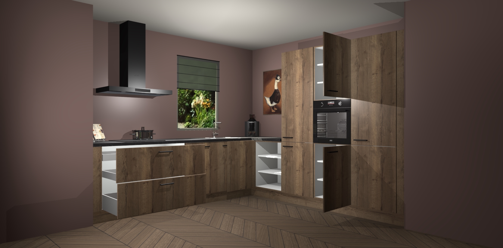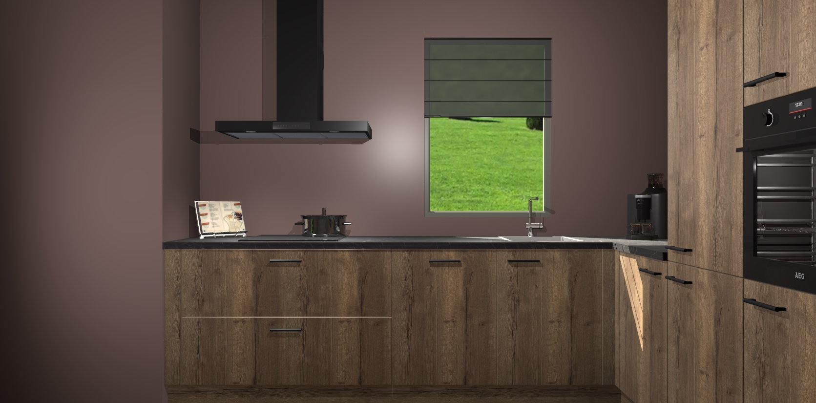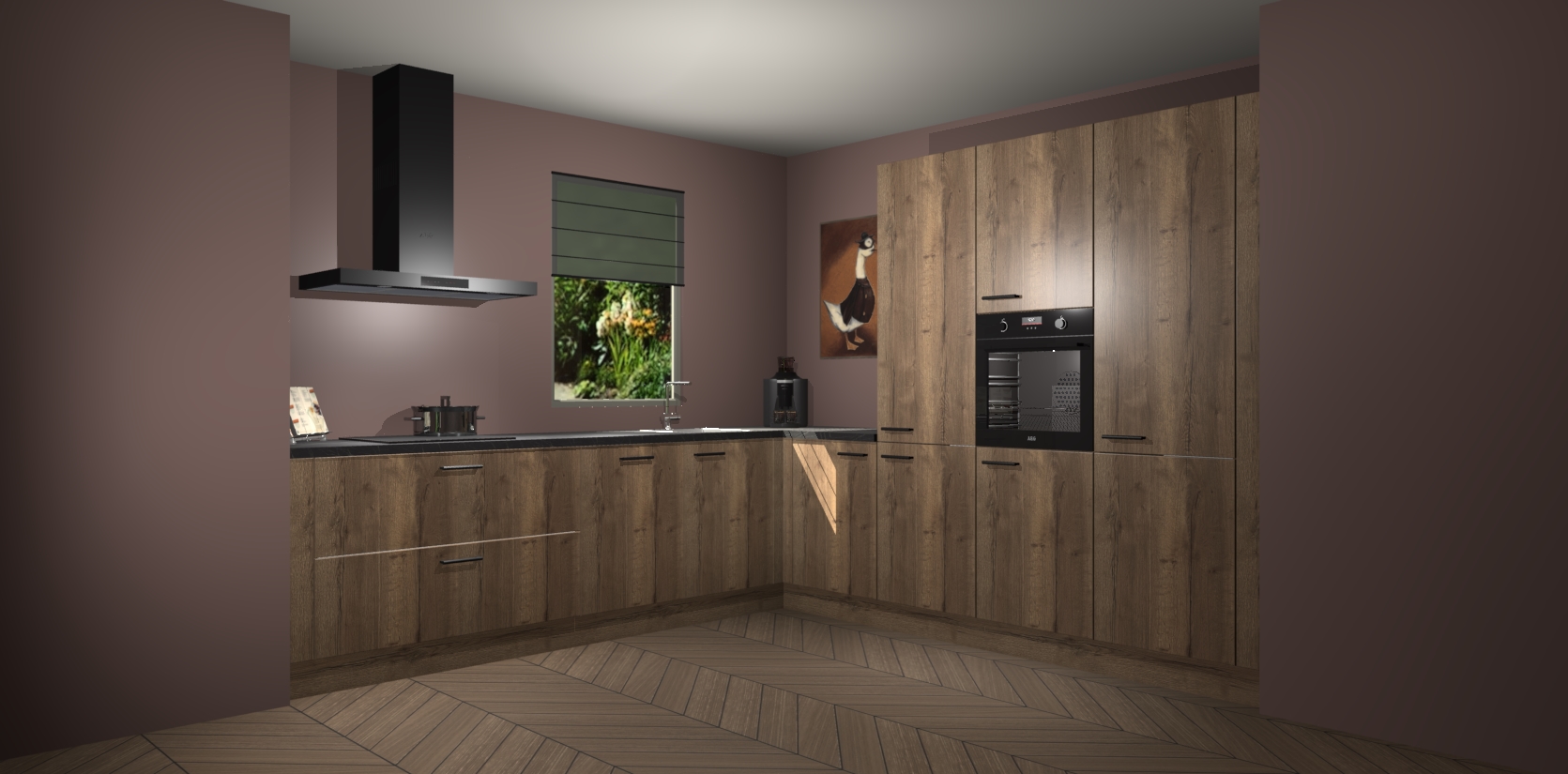 Welkom bij de Chocolade Eiken keuken Laos. Deze prachtige keuken zal de komende jaren het middelpunt van de belangstelling in uw huis zijn. Uitgerust met vijf inbouwapparaten komt u nooit kookgereedschap tekort. Bovendien geeft de warme houtlook elke ruimte een uitnodigende en tijdloze uitstraling.