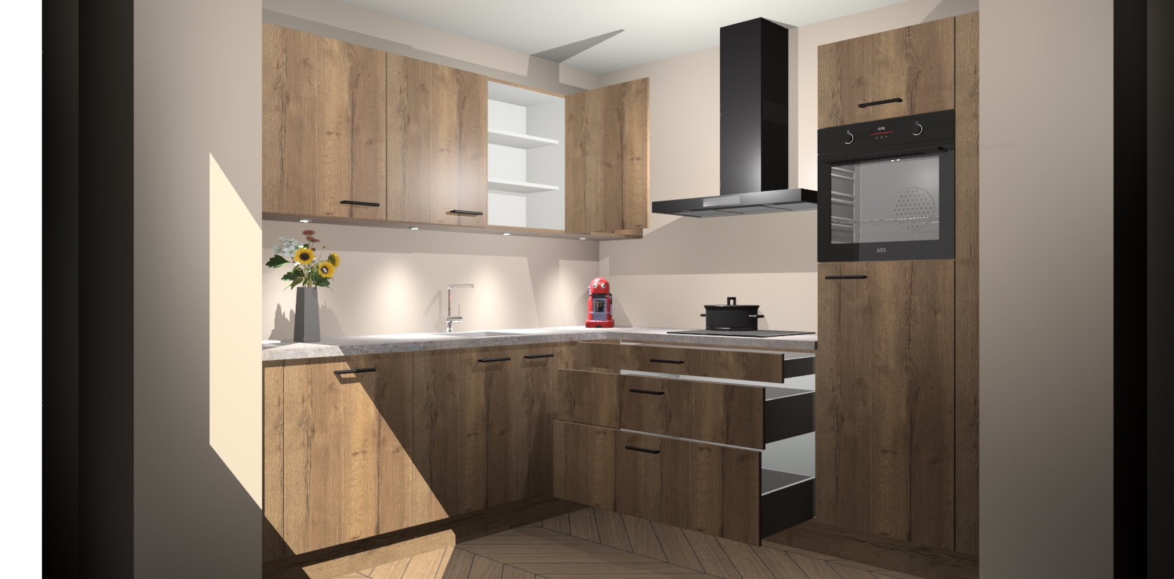 Met een modern, tijdloos design en ruime opslagruimte, zult u zich in no-time thuis voelen in uw nieuwe keuken. Uw leven wordt eenvoudiger met de soft-close deuren die voor het ultieme stille comfort zorgen - geen geluid dat u stoort terwijl u kookt. Ook is de keuken voorzien van 5 ingebouwde apparaten: een oven, inductie kookplaat, afzuigkap, vaatwasser en koelkast. Deze kunnen gemakkelijk na bestelling worden bijgewerkt naar AEG - waardoor uw luxe ervaring compleet is.