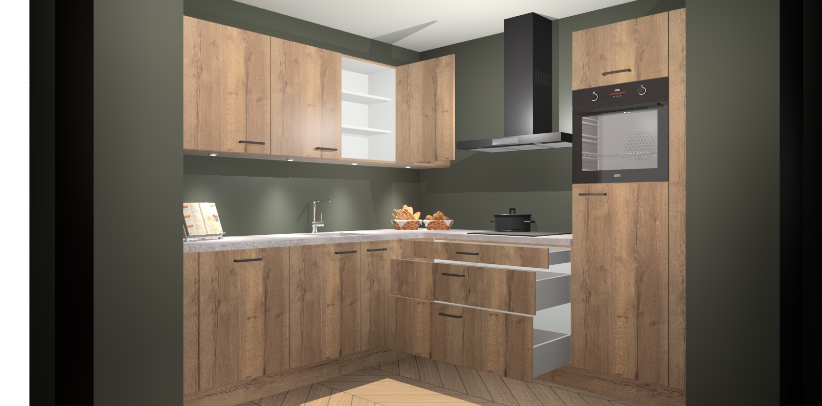 Met een modern, tijdloos design en ruime opslagruimte, zult u zich in no-time thuis voelen in uw nieuwe keuken. Uw leven wordt eenvoudiger met de soft-close deuren die voor het ultieme stille comfort zorgen - geen geluid dat u stoort terwijl u kookt. Ook is de keuken voorzien van 5 ingebouwde apparaten: een oven, inductie kookplaat, afzuigkap, vaatwasser en koelkast. Deze kunnen gemakkelijk na bestelling worden bijgewerkt naar AEG - waardoor uw luxe ervaring compleet is.