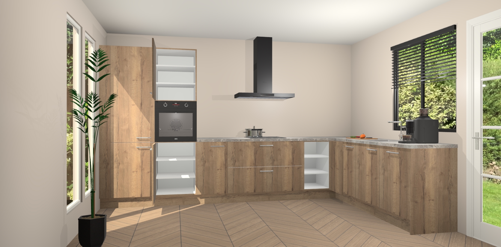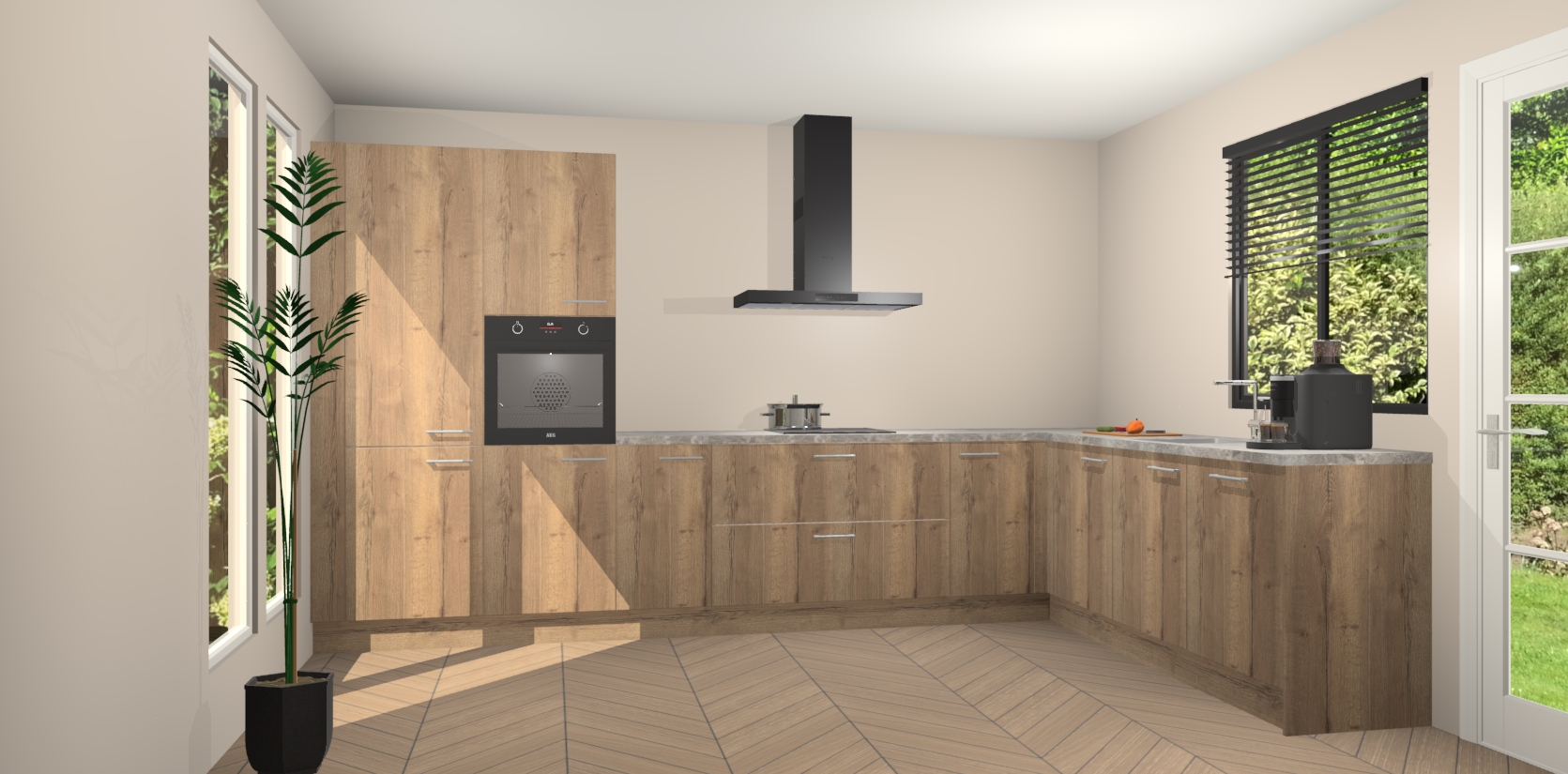 Met een modern, tijdloos design en ruime opslagruimte, zult u zich in no-time thuis voelen in uw nieuwe keuken. Uw leven wordt eenvoudiger met de soft-close deuren die voor het ultieme stille comfort zorgen - geen geluid dat u stoort terwijl u kookt. Ook is de keuken voorzien van 5 ingebouwde apparaten: een oven, inductie kookplaat, afzuigkap, vaatwasser en koelkast. Deze kunnen gemakkelijk na bestelling worden bijgewerkt naar AEG - waardoor uw luxe ervaring compleet is.