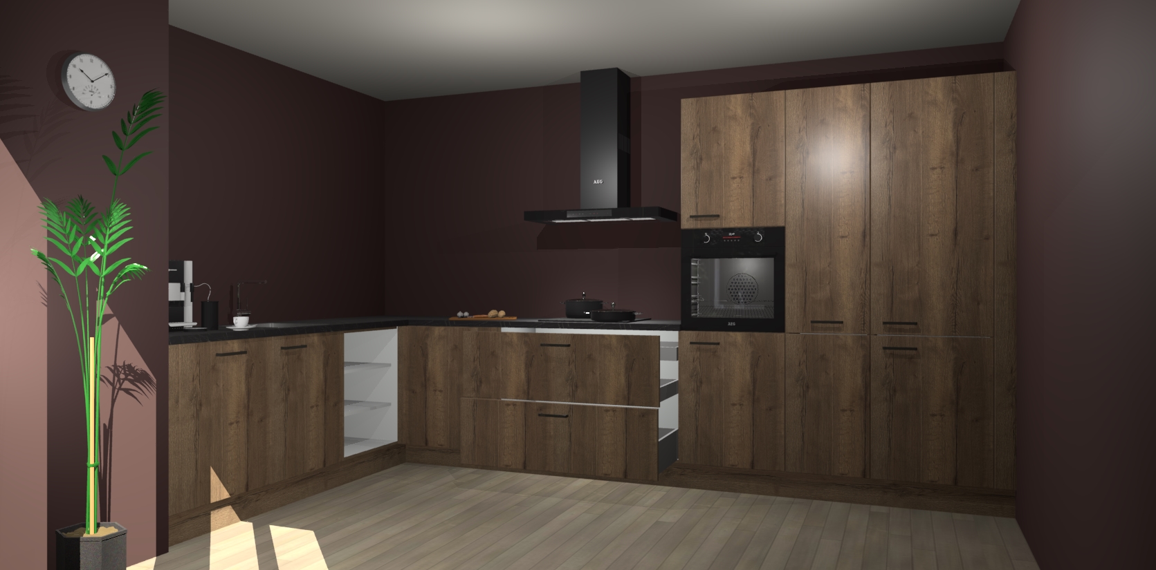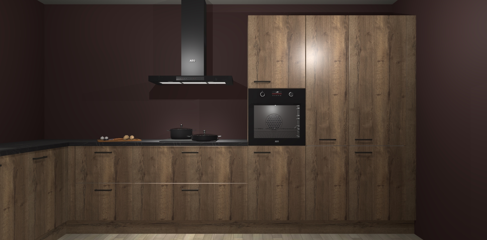 Welkom bij de chocolade eiken keuken Nuuk. Deze prachtige keuken zal de komende jaren het middelpunt van de belangstelling in uw huis zijn. Uitgerust met vijf inbouwapparaten komt u nooit kookgereedschap tekort.