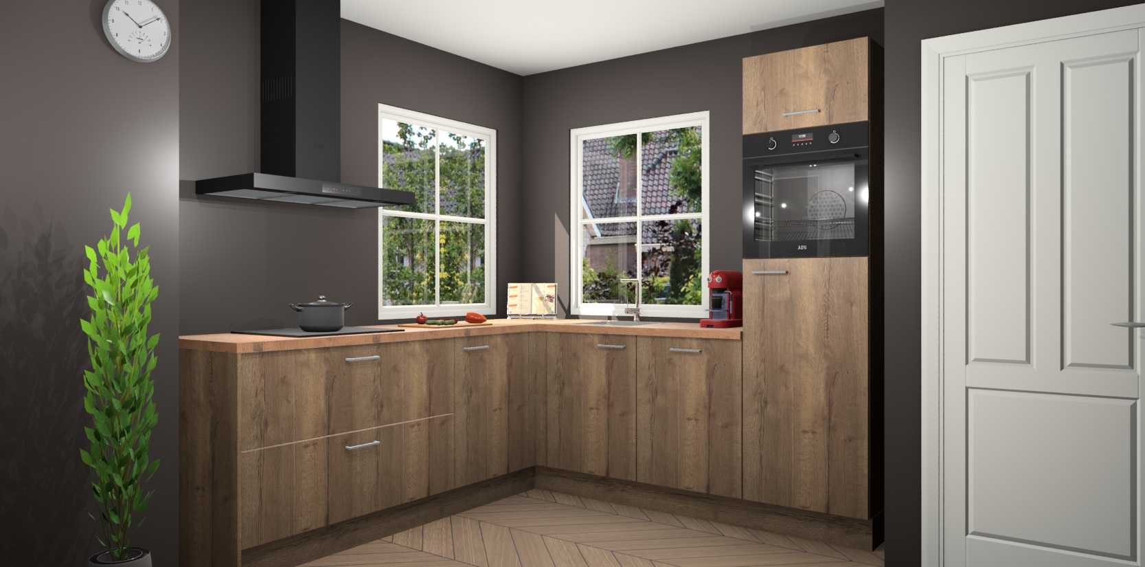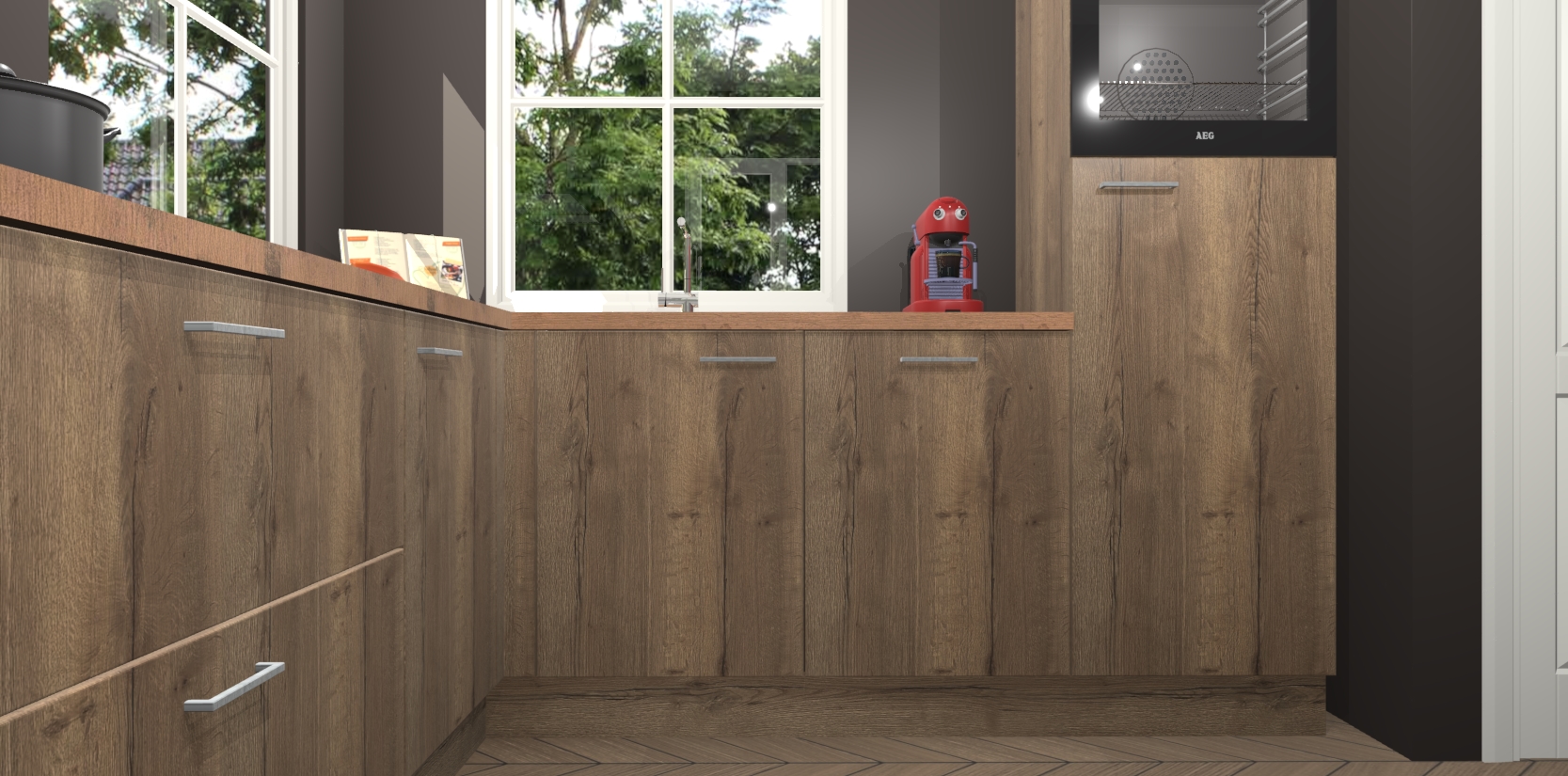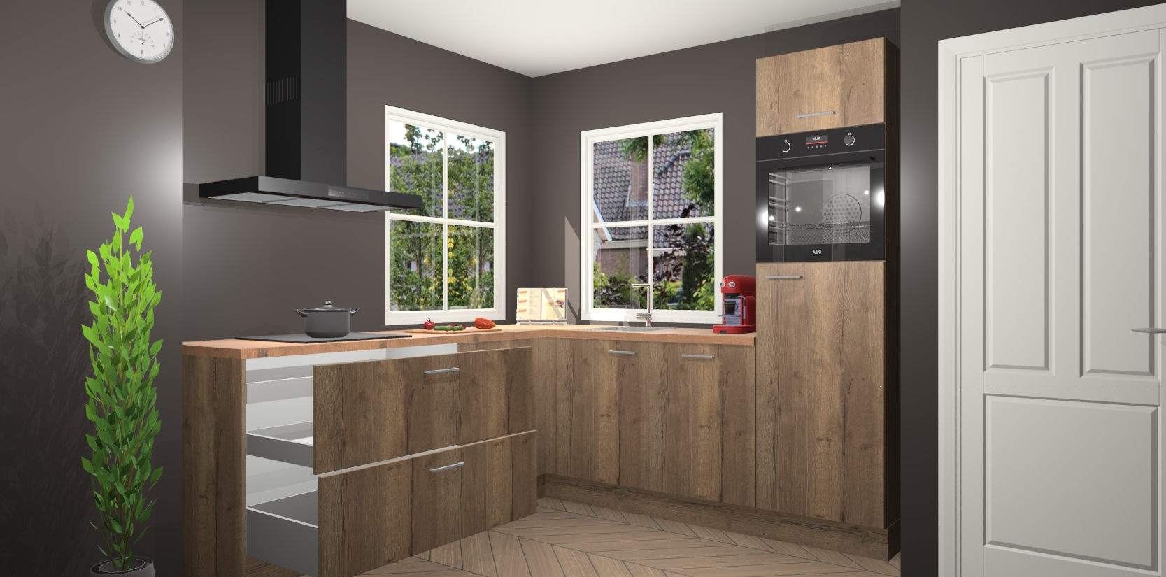 De Chocolade Eiken keuken Pai bevat vijf essentiële inbouwapparaten - een oven, inductiekookplaat, afzuigkap, vaatwasser en koelkast - zodat u er na levering meteen in kunt. Voor de slimme kopers die weten dat apparaten vaak het verschil kunnen maken tussen functioneel en luxueus, bieden we eenvoudige upgradeopties naar AEG, van oven naar combimagnetron na bestelling of naar een kookplaat met geïntrigeerde afzuiging. En met onze vaste lage prijs en snelle levering binnen zeven weken vanaf de orderbevestiging hoeft u zich geen zorgen te maken over verborgen kosten of lange levertijden die uw droomkeuken kunnen vertragen.