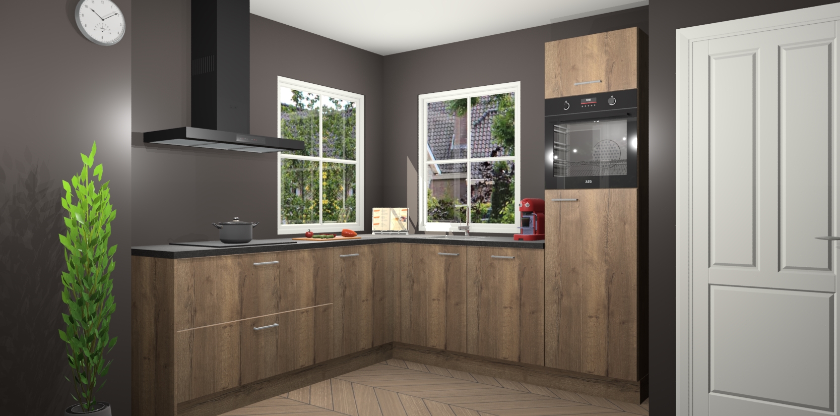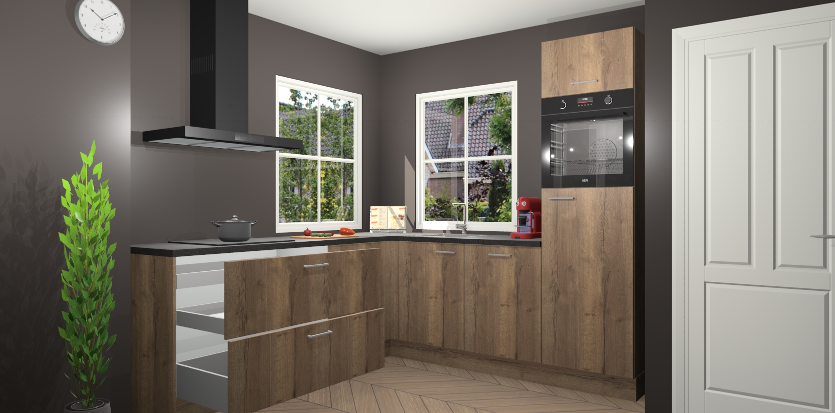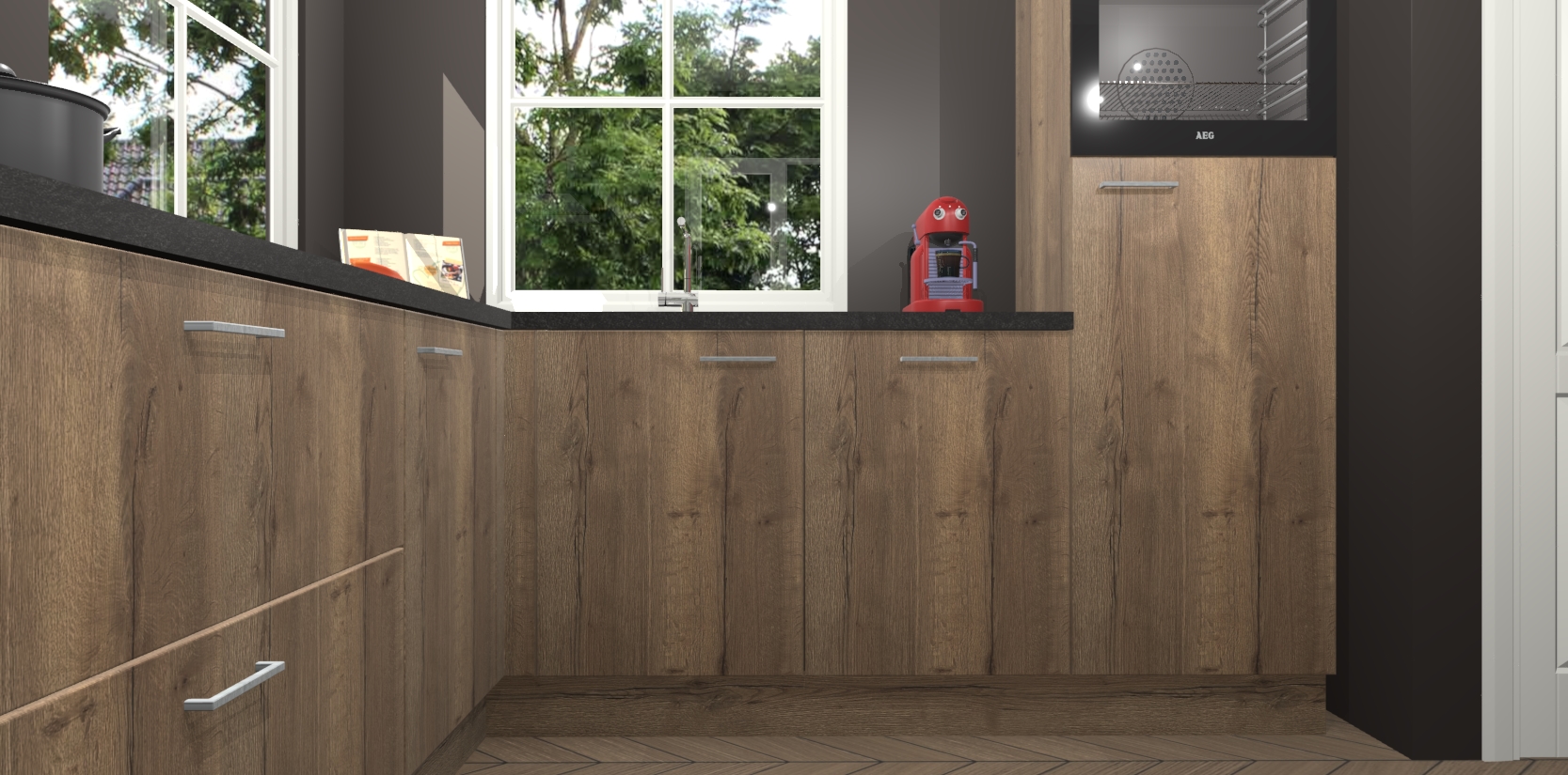 De Chocolade Eiken keuken Pai bevat vijf essentiële inbouwapparaten - een oven, inductiekookplaat, afzuigkap, vaatwasser en koelkast - zodat u er na levering meteen in kunt. Voor de slimme kopers die weten dat apparaten vaak het verschil kunnen maken tussen functioneel en luxueus, bieden we eenvoudige upgradeopties naar AEG, van oven naar combimagnetron na bestelling of naar een kookplaat met geïntrigeerde afzuiging. En met onze vaste lage prijs en snelle levering binnen zeven weken vanaf de orderbevestiging hoeft u zich geen zorgen te maken over verborgen kosten of lange levertijden die uw droomkeuken kunnen vertragen.