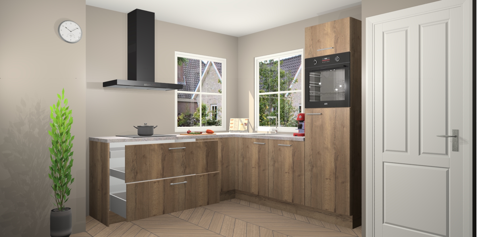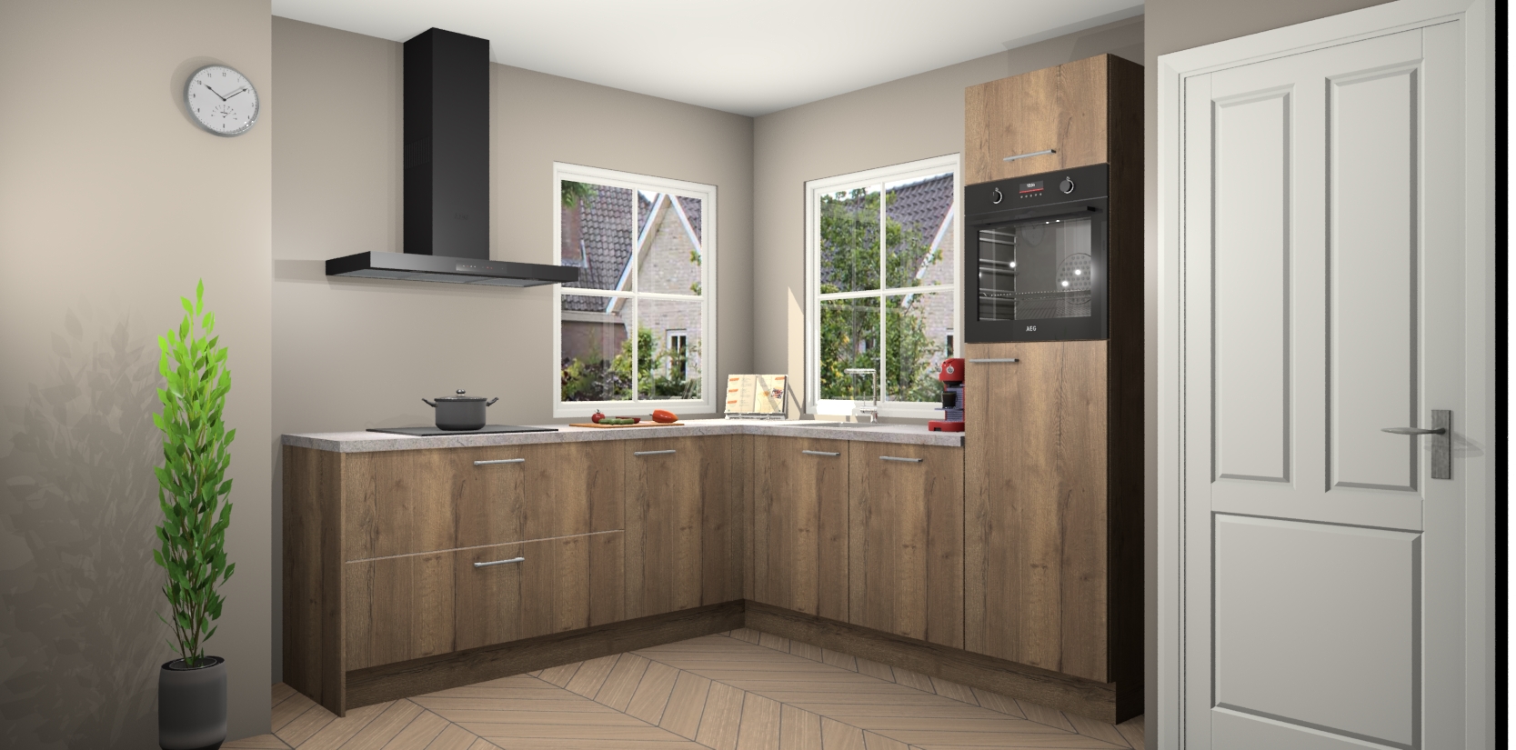 De Chocolade Eiken keuken Pai bevat vijf essentiële inbouwapparaten - een oven, inductiekookplaat, afzuigkap, vaatwasser en koelkast - zodat u er na levering meteen in kunt. Voor de slimme kopers die weten dat apparaten vaak het verschil kunnen maken tussen functioneel en luxueus, bieden we eenvoudige upgradeopties naar AEG, van oven naar combimagnetron na bestelling of naar een kookplaat met geïntrigeerde afzuiging. En met onze vaste lage prijs en snelle levering binnen zeven weken vanaf de orderbevestiging hoeft u zich geen zorgen te maken over verborgen kosten of lange levertijden die uw droomkeuken kunnen vertragen.