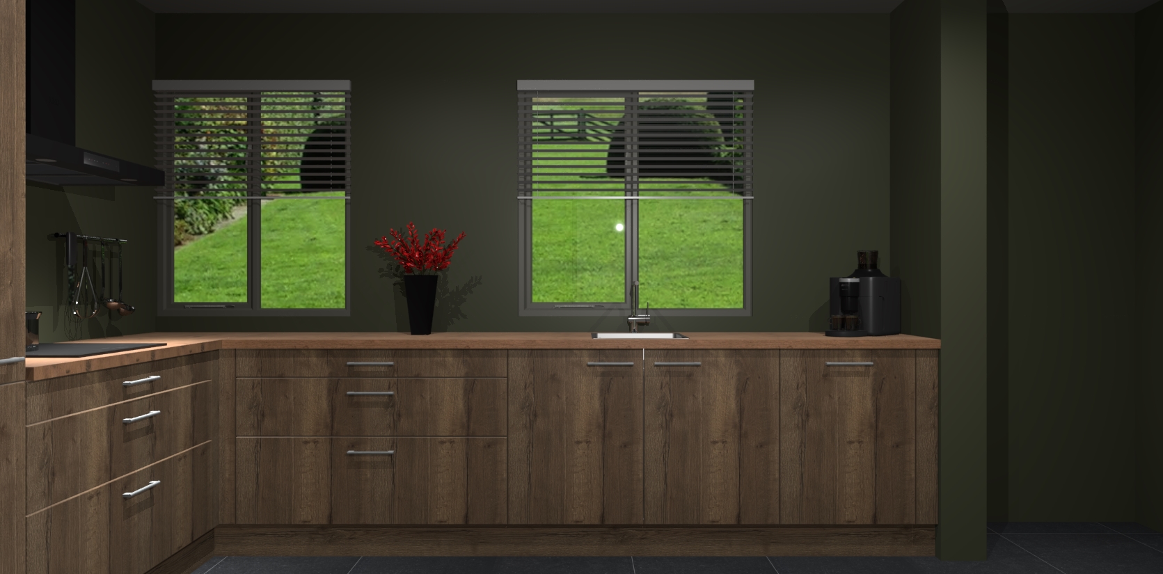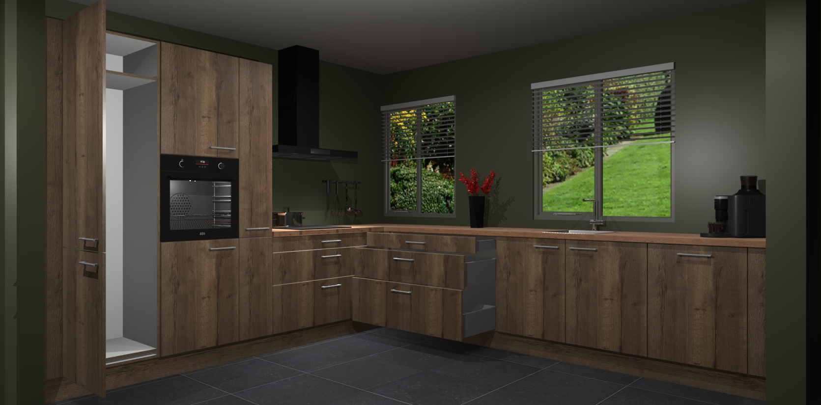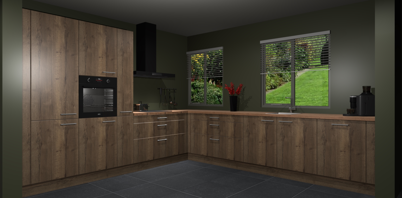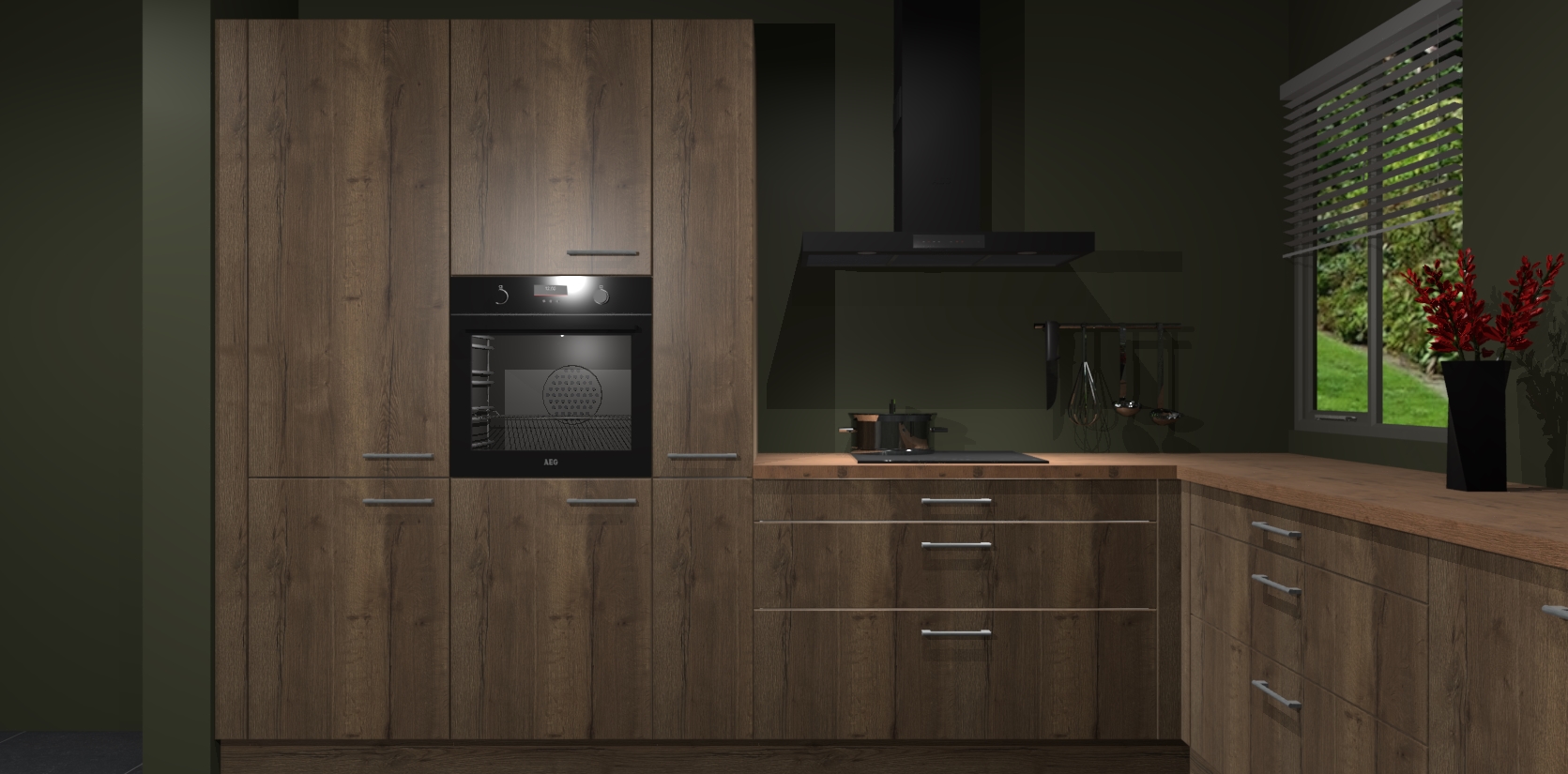 Welkom bij de Chocolade Eiken keuken Palermo. Deze prachtige keuken zal de komende jaren het middelpunt van de belangstelling in uw huis zijn. Uitgerust met vijf inbouwapparaten komt u nooit kookgereedschap tekort. Bovendien geeft de warme houtlook elke ruimte een uitnodigende en tijdloze uitstraling.