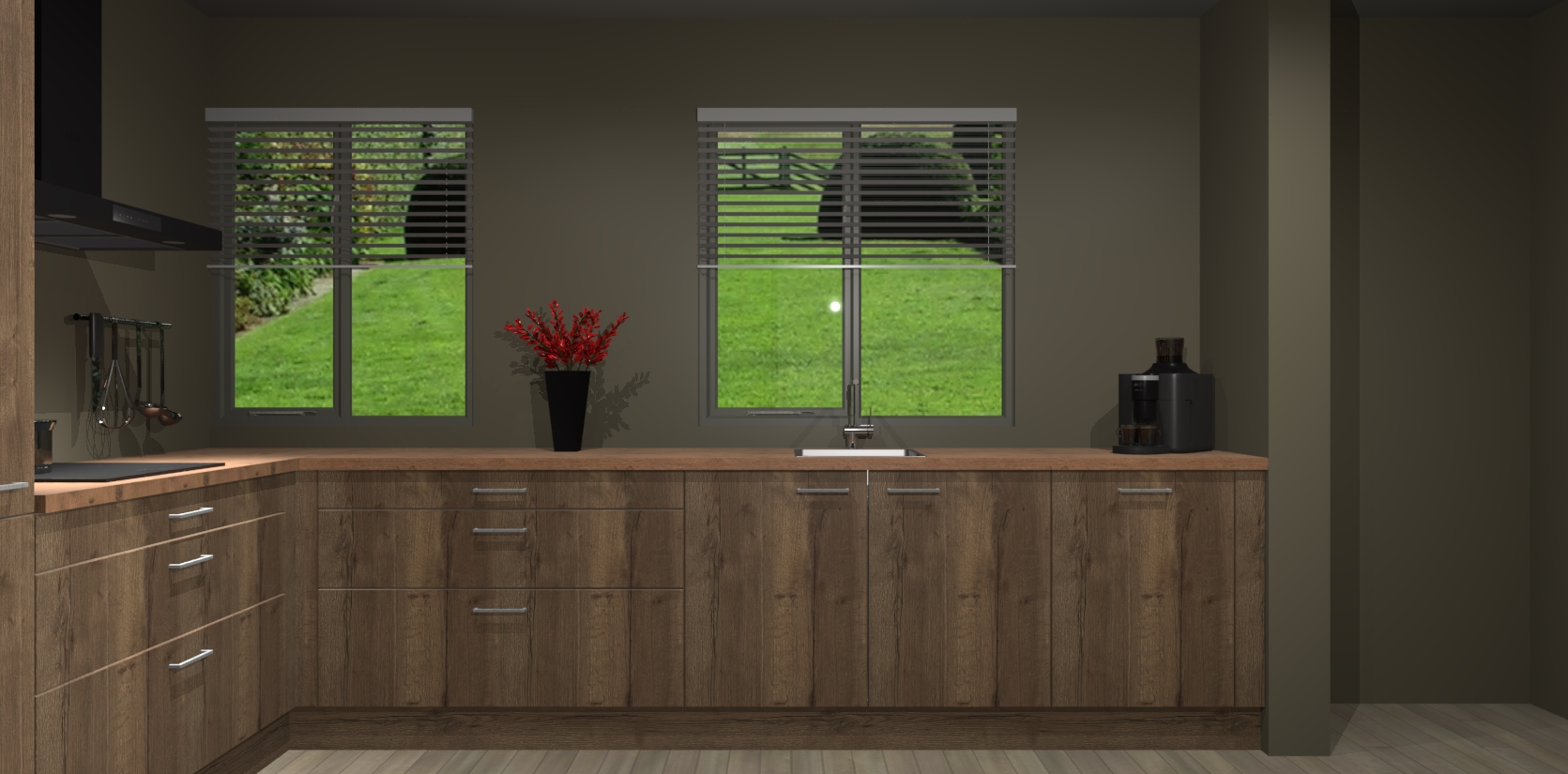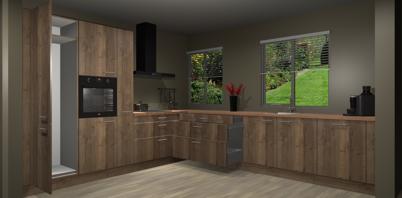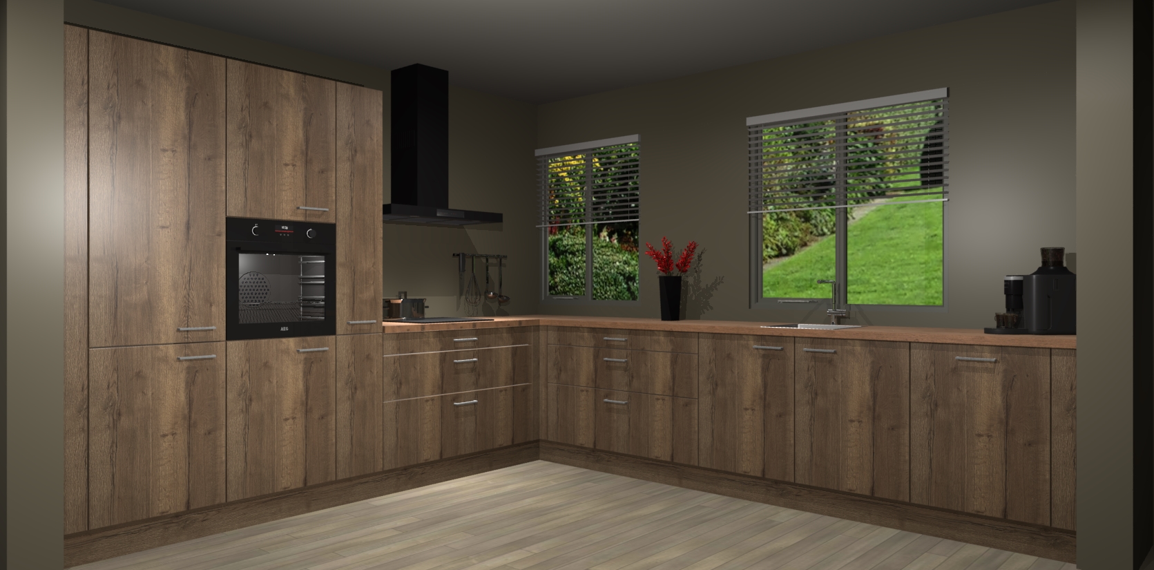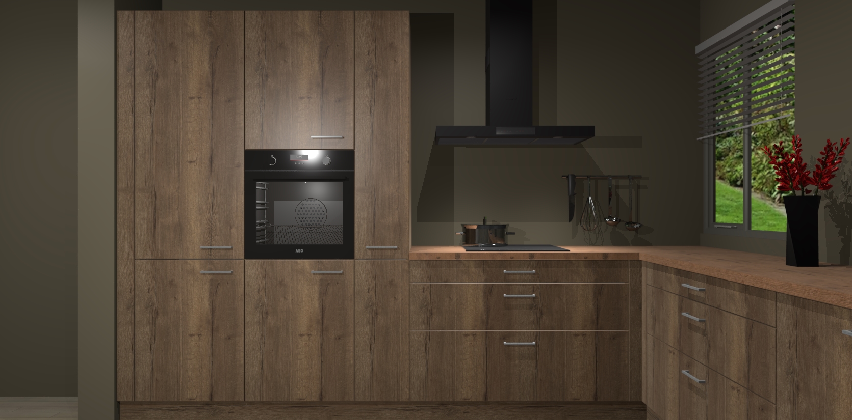 Welkom bij de Chocolade Eiken keuken Palermo. Deze prachtige keuken zal de komende jaren het middelpunt van de belangstelling in uw huis zijn. Uitgerust met vijf inbouwapparaten komt u nooit kookgereedschap tekort. Bovendien geeft de warme houtlook elke ruimte een uitnodigende en tijdloze uitstraling.
