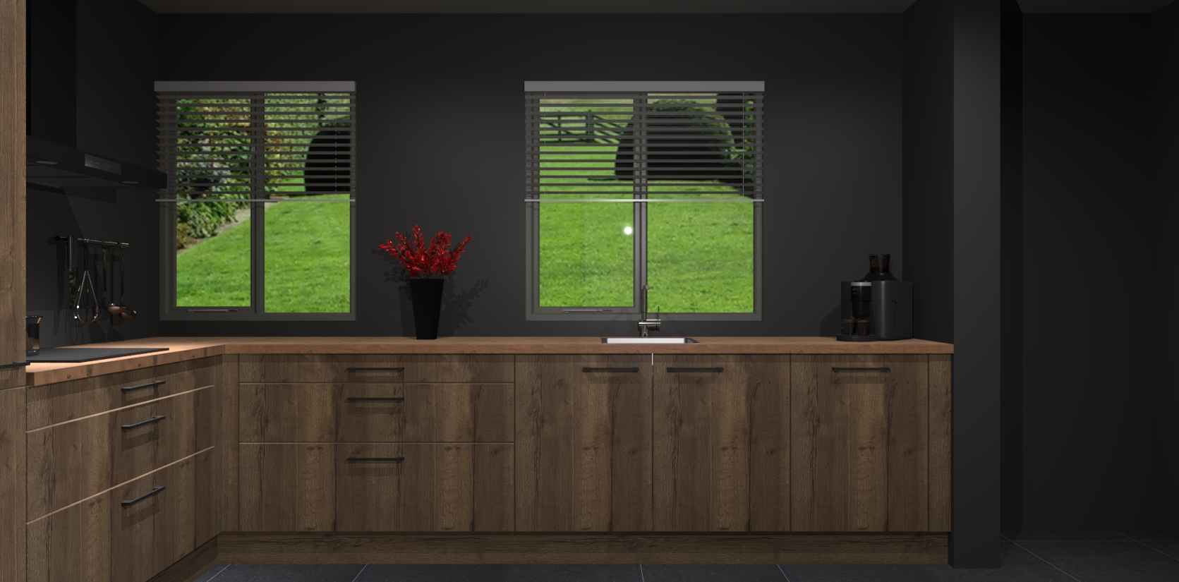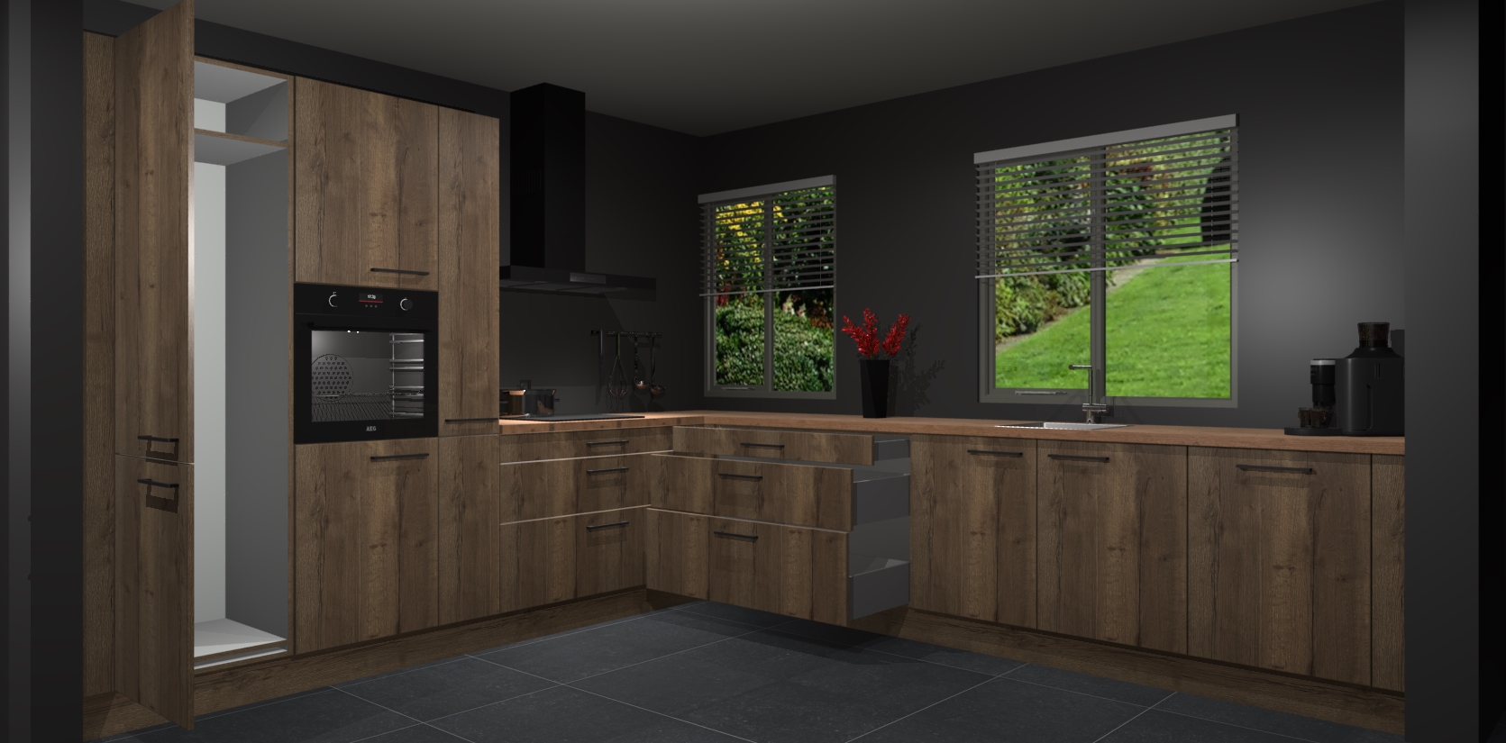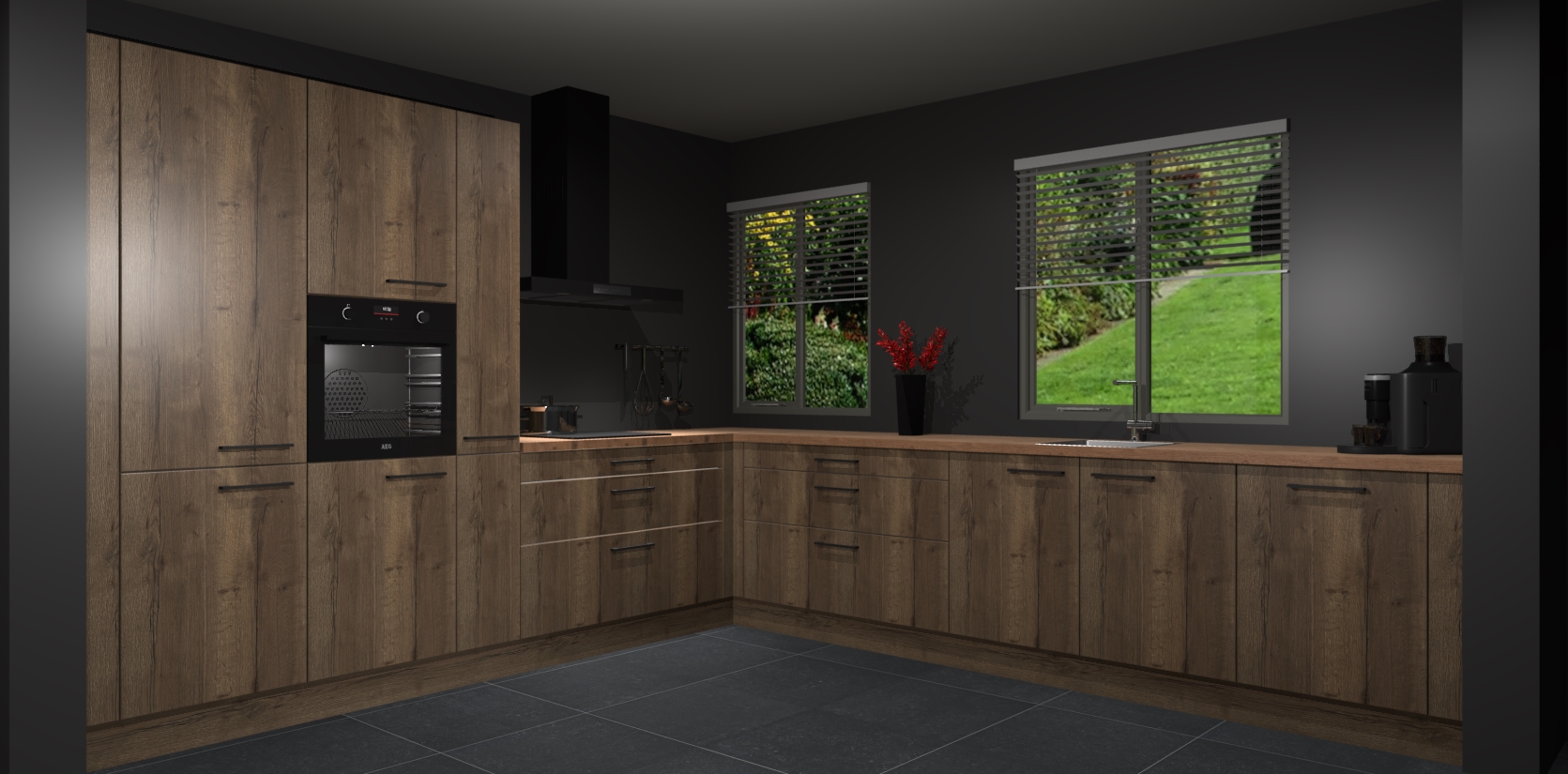 Welkom bij de Chocolade Eiken keuken Palermo. Deze prachtige keuken zal de komende jaren het middelpunt van de belangstelling in uw huis zijn. Uitgerust met vijf inbouwapparaten komt u nooit kookgereedschap tekort. Bovendien geeft de warme houtlook elke ruimte een uitnodigende en tijdloze uitstraling.