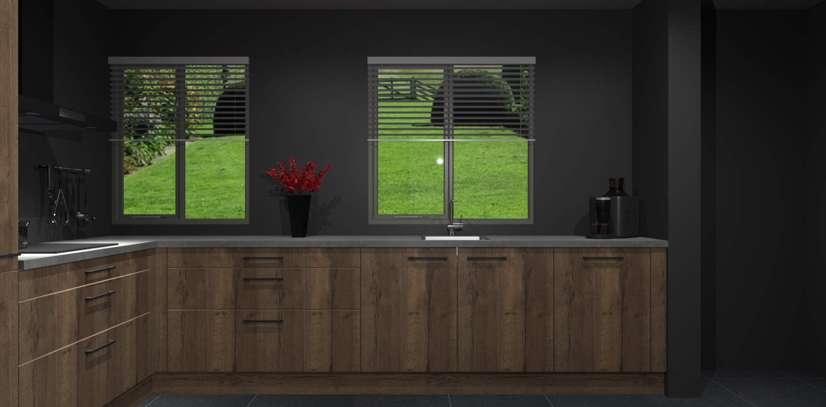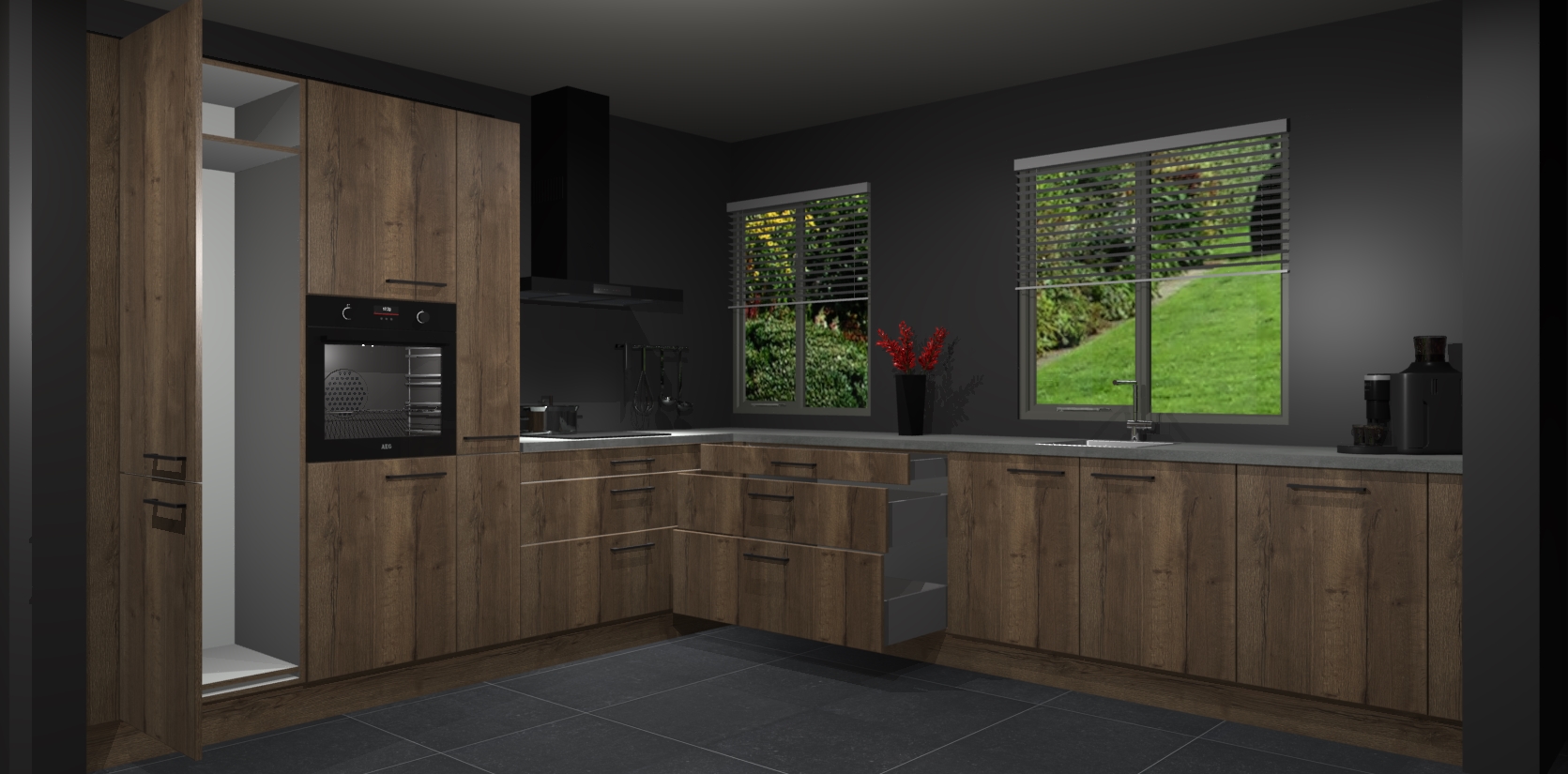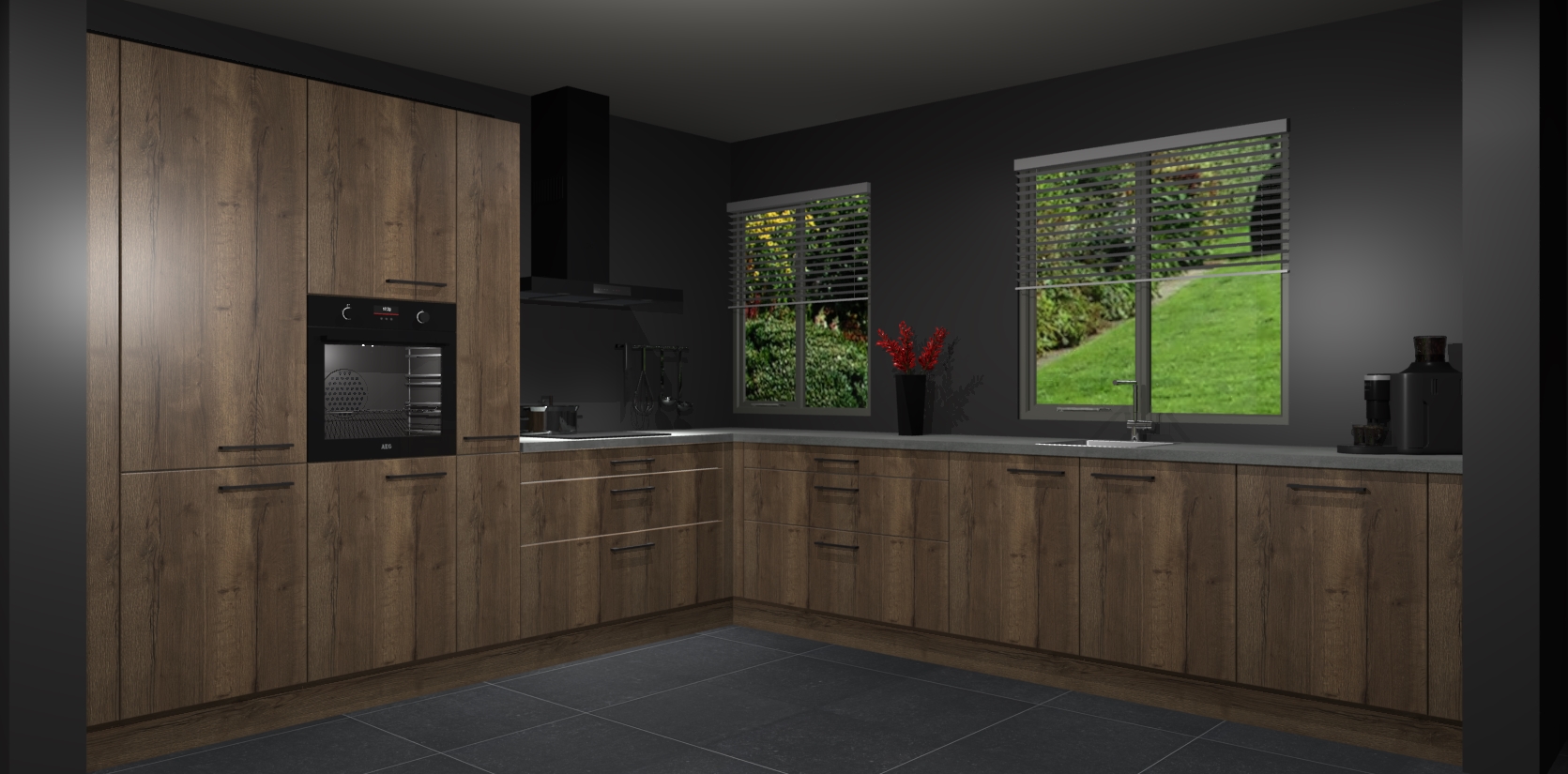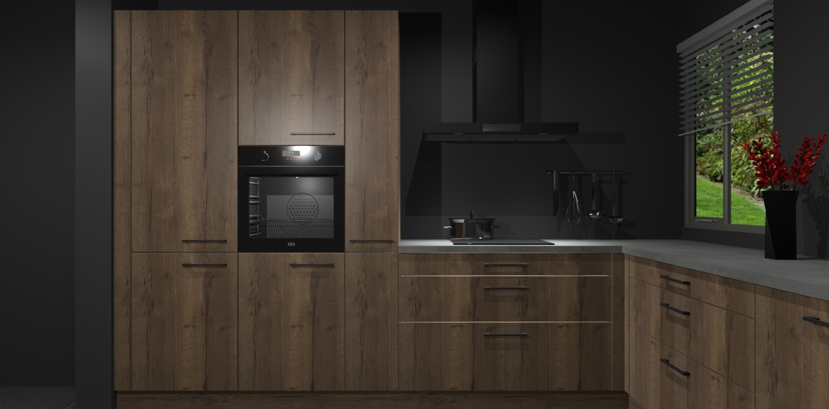 Welkom bij de Chocolade Eiken keuken Palermo. Deze prachtige keuken zal de komende jaren het middelpunt van de belangstelling in uw huis zijn. Uitgerust met vijf inbouwapparaten komt u nooit kookgereedschap tekort. Bovendien geeft de warme houtlook elke ruimte een uitnodigende en tijdloze uitstraling.