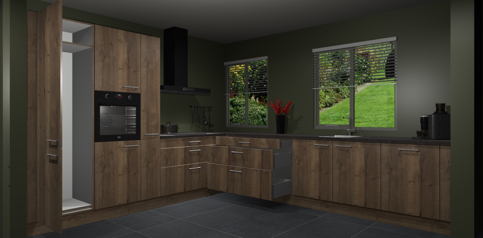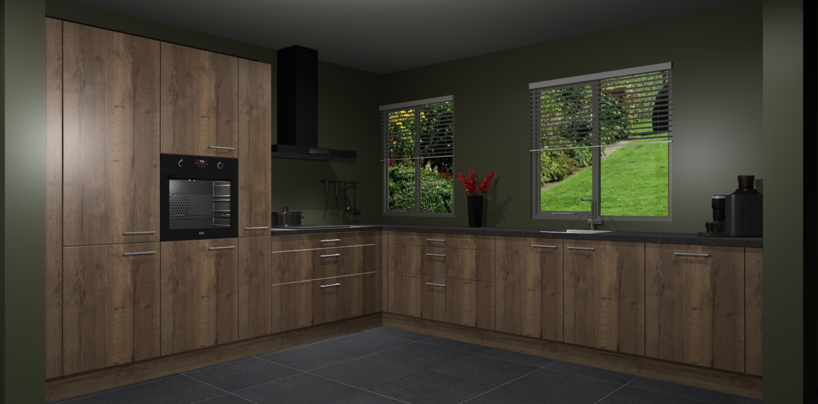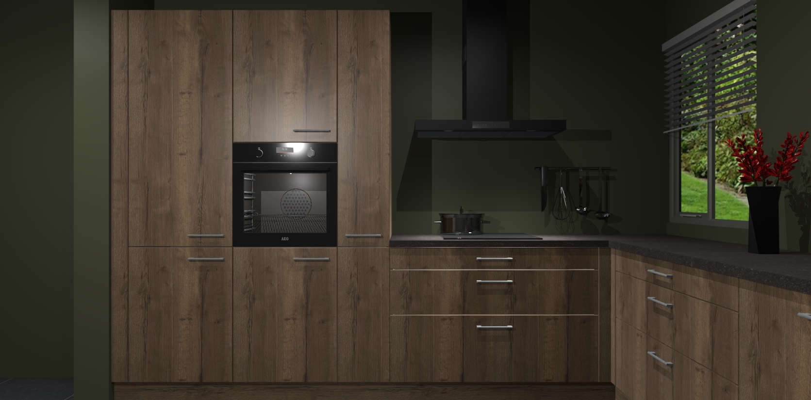 Welkom bij de Chocolade Eiken keuken Palermo. Deze prachtige keuken zal de komende jaren het middelpunt van de belangstelling in uw huis zijn. Uitgerust met vijf inbouwapparaten komt u nooit kookgereedschap tekort. Bovendien geeft de warme houtlook elke ruimte een uitnodigende en tijdloze uitstraling.
