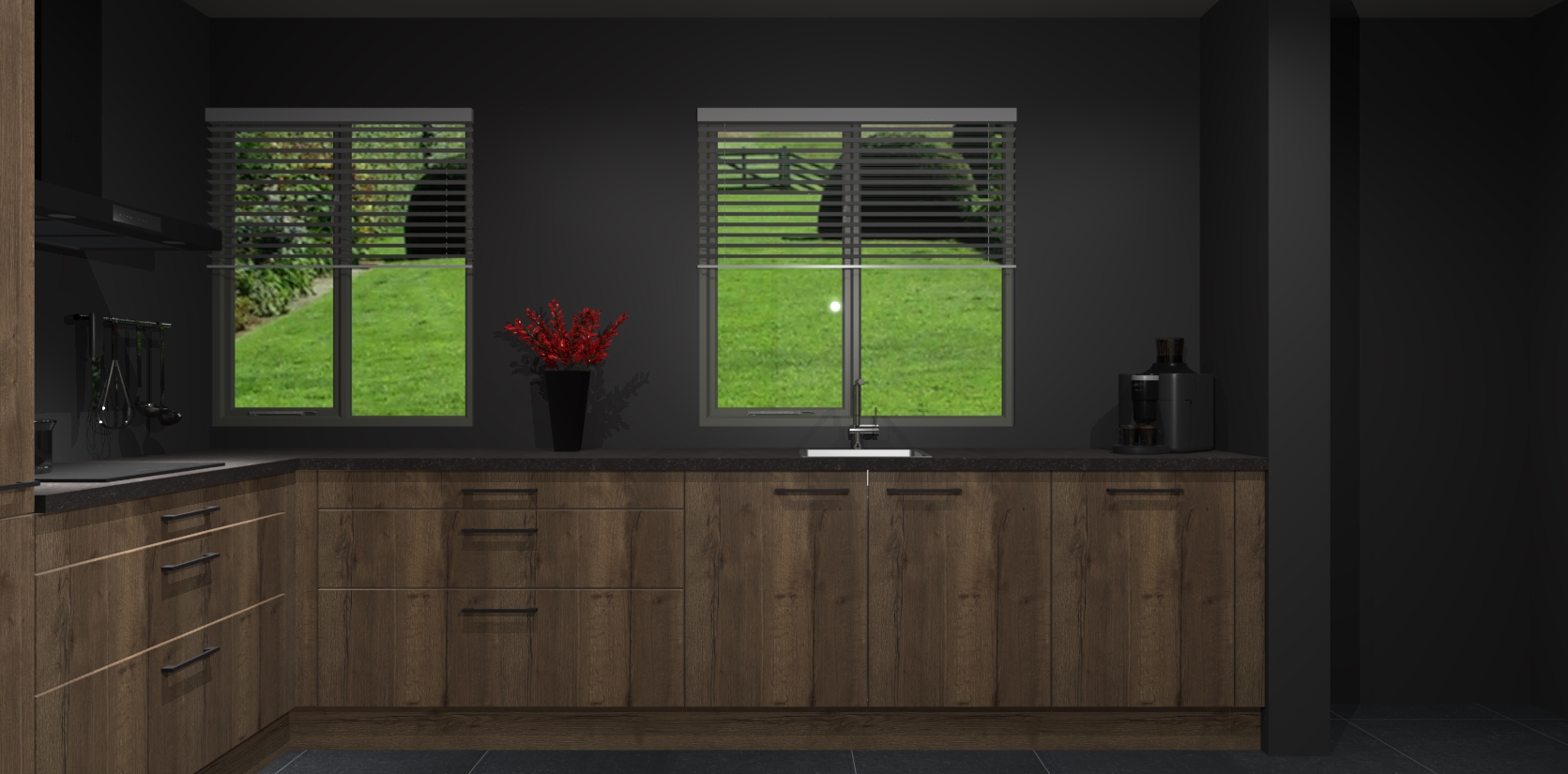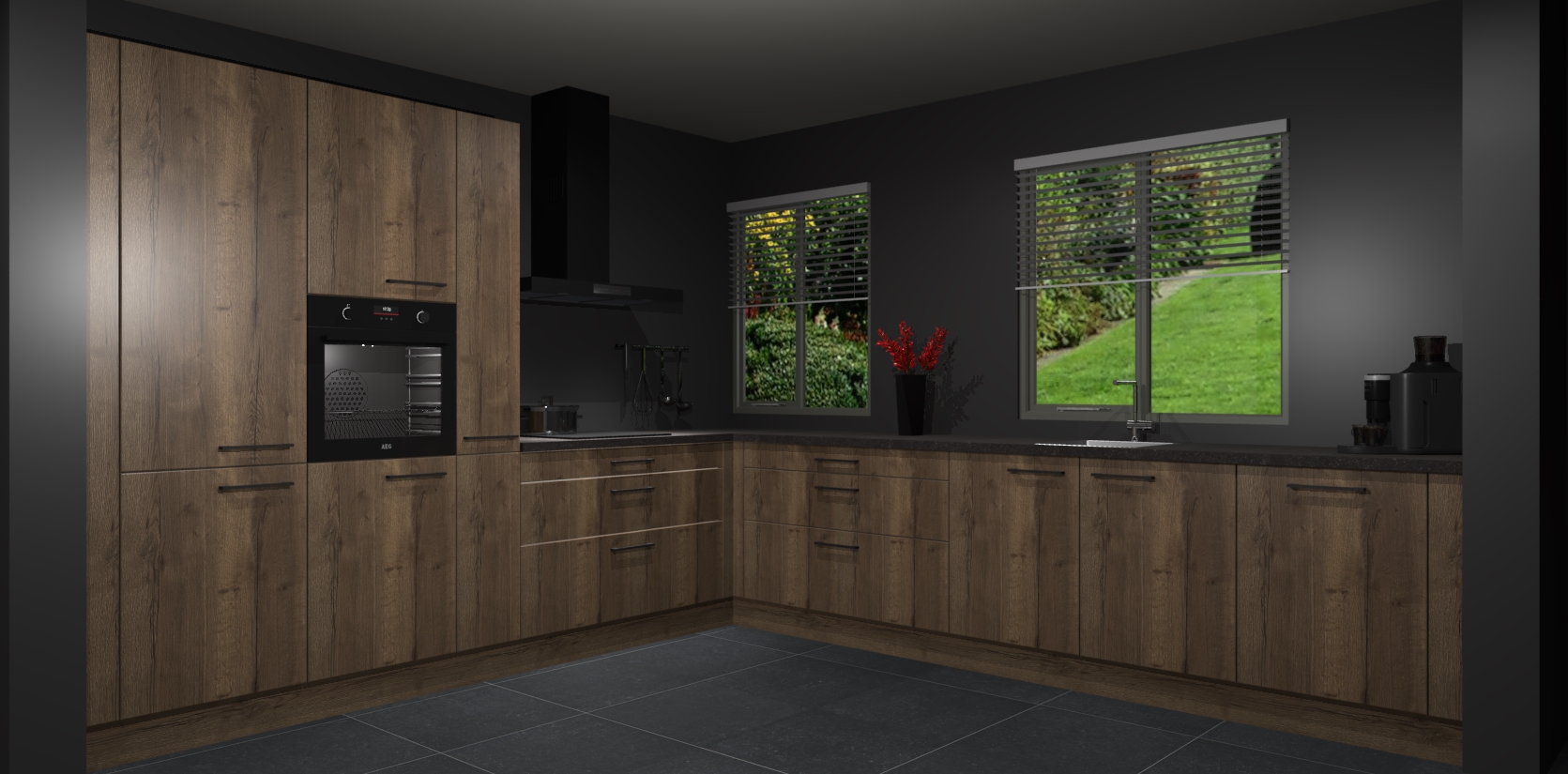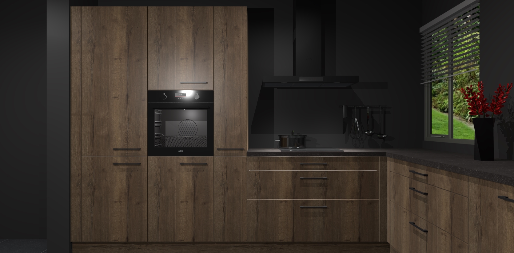 Welkom bij de Chocolade Eiken keuken Palermo. Deze prachtige keuken zal de komende jaren het middelpunt van de belangstelling in uw huis zijn. Uitgerust met vijf inbouwapparaten komt u nooit kookgereedschap tekort. Bovendien geeft de warme houtlook elke ruimte een uitnodigende en tijdloze uitstraling.