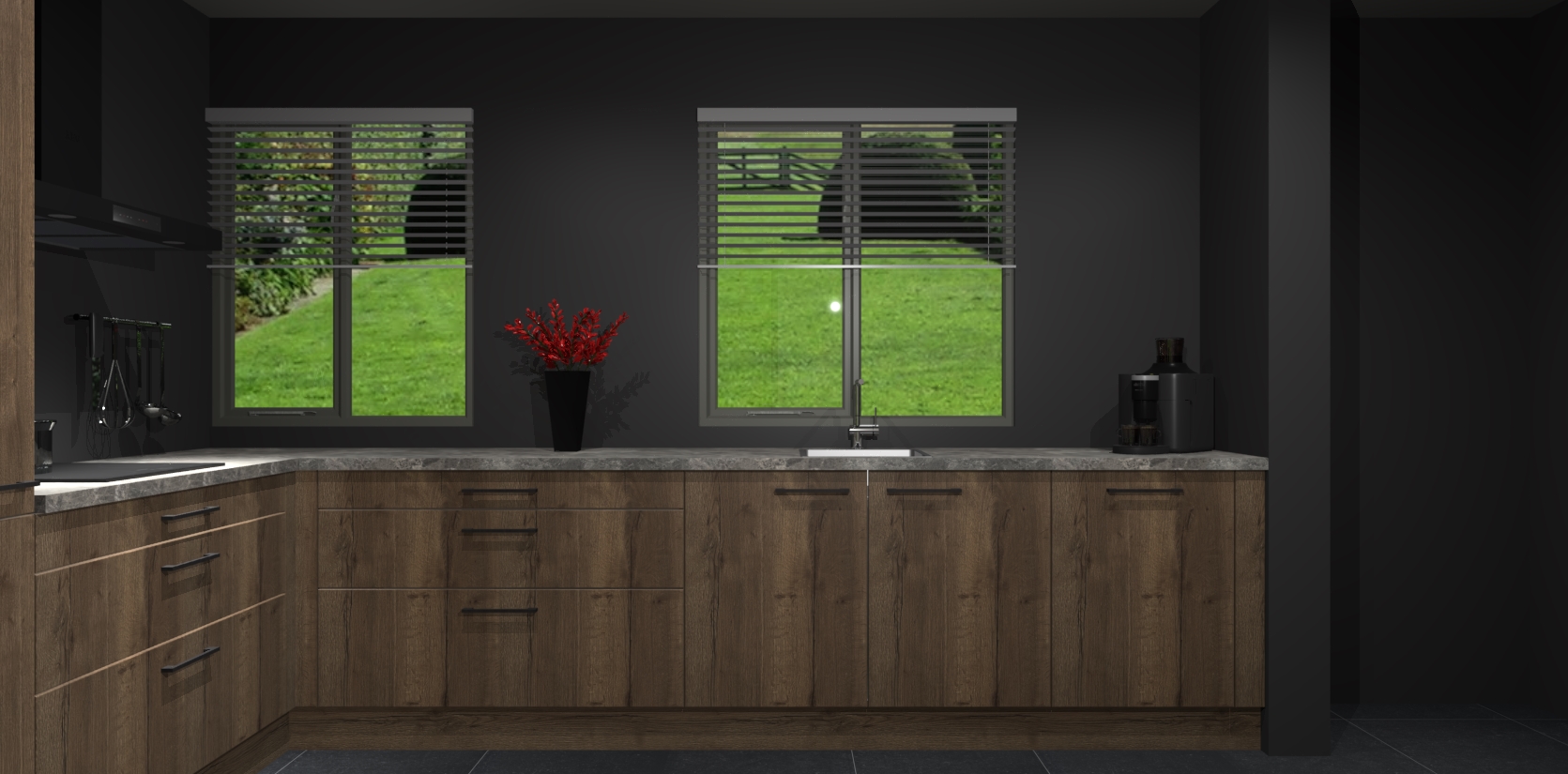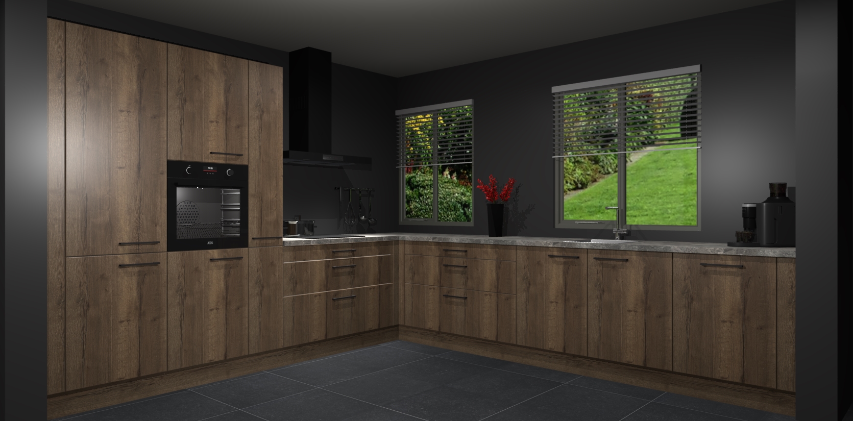Welkom bij de Chocolade Eiken keuken Palermo. Deze prachtige keuken zal de komende jaren het middelpunt van de belangstelling in uw huis zijn. Uitgerust met vijf inbouwapparaten komt u nooit kookgereedschap tekort. Bovendien geeft de warme houtlook elke ruimte een uitnodigende en tijdloze uitstraling.