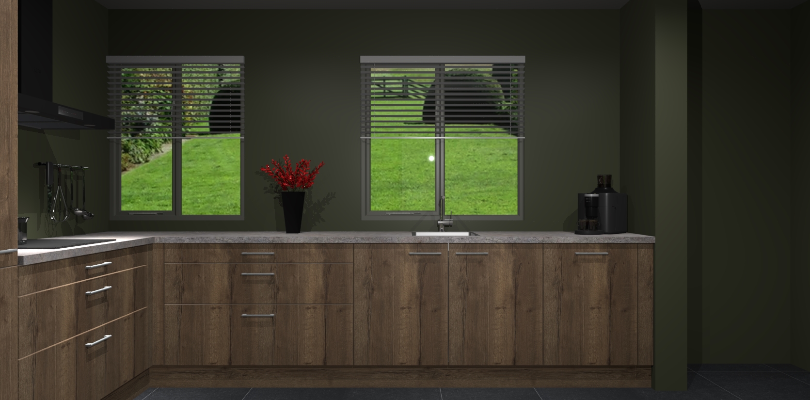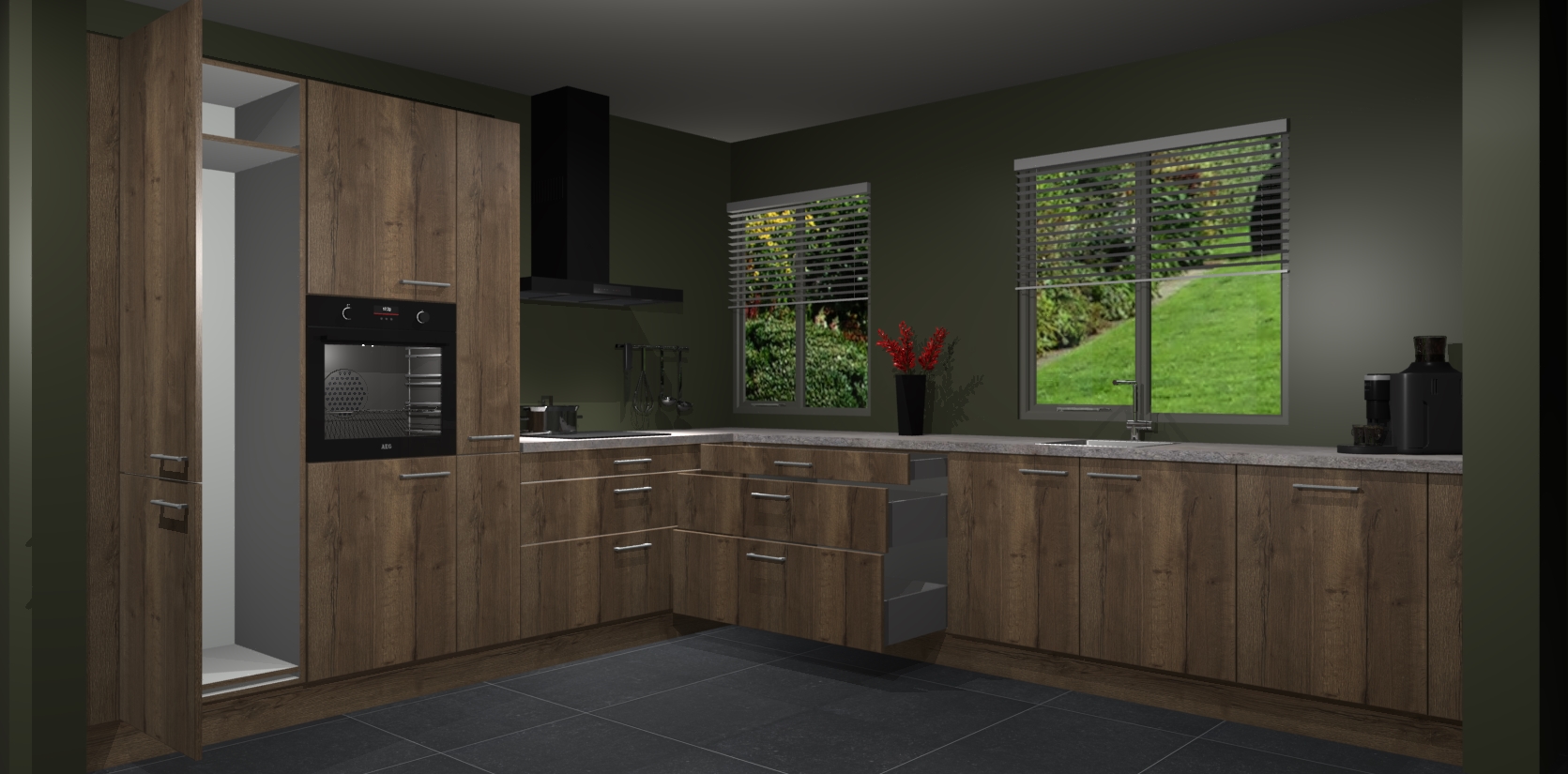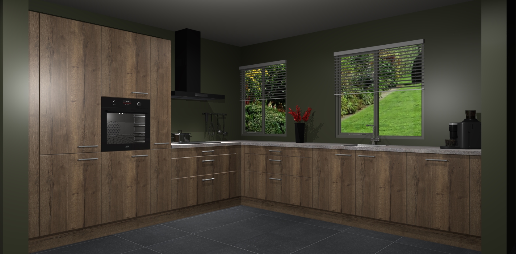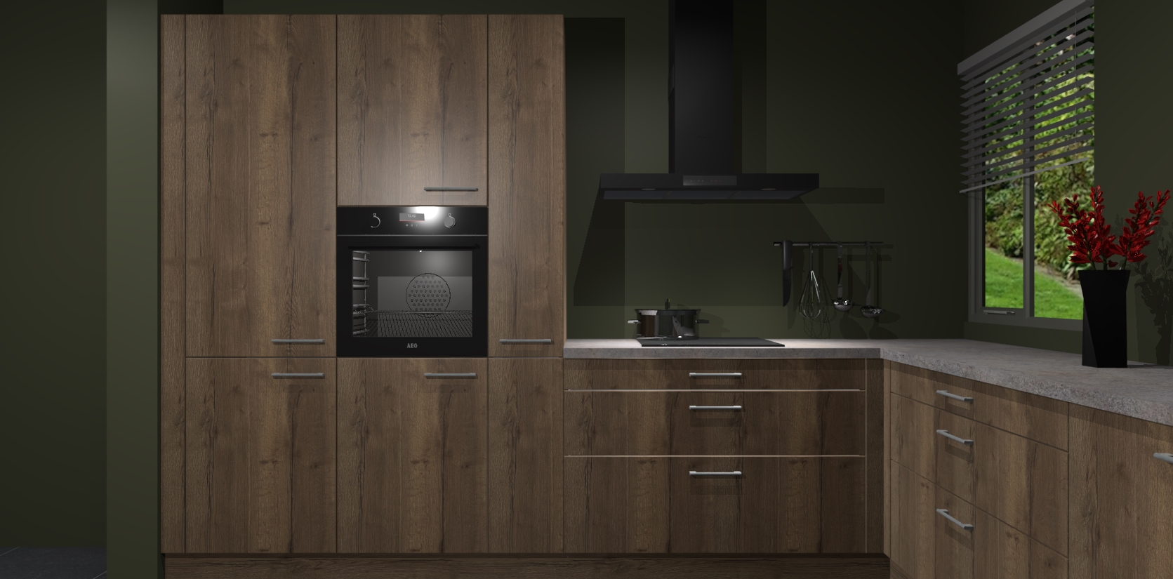 Welkom bij de Chocolade Eiken keuken Palermo. Deze prachtige keuken zal de komende jaren het middelpunt van de belangstelling in uw huis zijn. Uitgerust met vijf inbouwapparaten komt u nooit kookgereedschap tekort. Bovendien geeft de warme houtlook elke ruimte een uitnodigende en tijdloze uitstraling.
