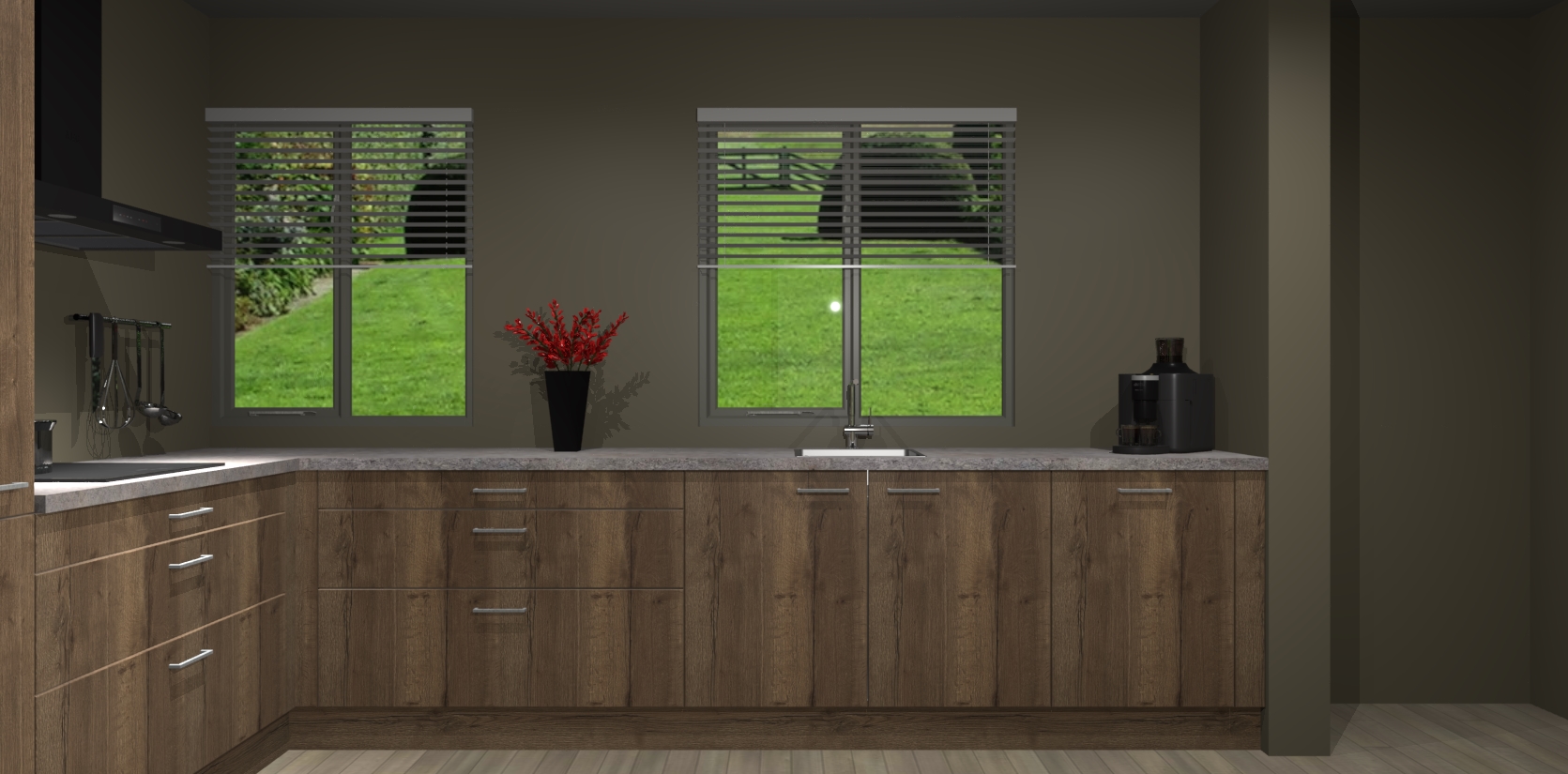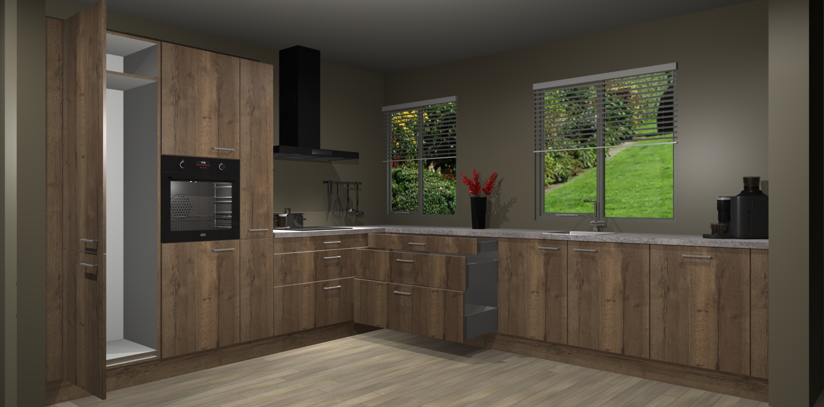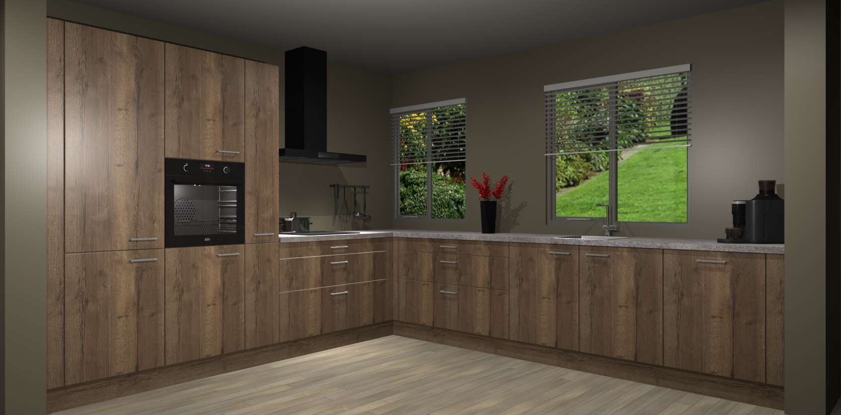 Welkom bij de Chocolade Eiken keuken Palermo. Deze prachtige keuken zal de komende jaren het middelpunt van de belangstelling in uw huis zijn. Uitgerust met vijf inbouwapparaten komt u nooit kookgereedschap tekort. Bovendien geeft de warme houtlook elke ruimte een uitnodigende en tijdloze uitstraling.