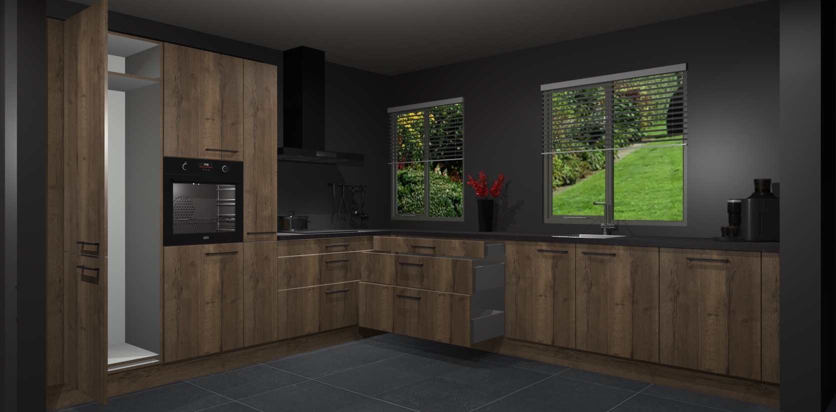 Welkom bij de Chocolade Eiken keuken Palermo. Deze prachtige keuken zal de komende jaren het middelpunt van de belangstelling in uw huis zijn. Uitgerust met vijf inbouwapparaten komt u nooit kookgereedschap tekort. Bovendien geeft de warme houtlook elke ruimte een uitnodigende en tijdloze uitstraling.