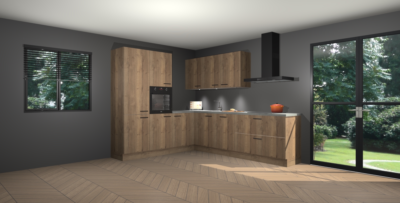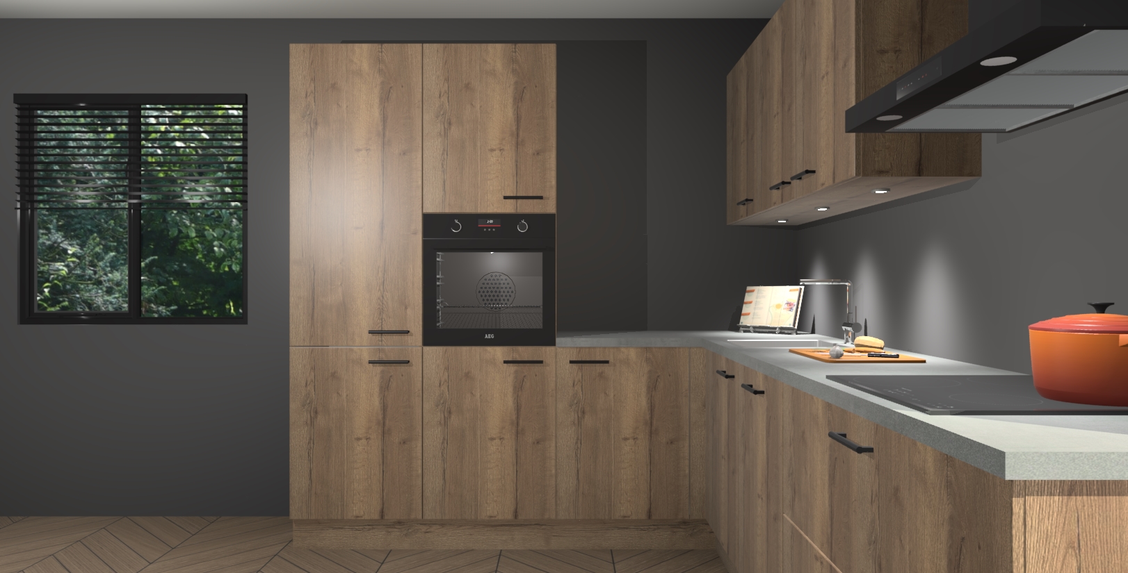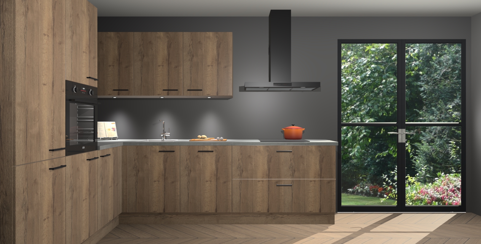 Maak kennis met de chocolade eiken keuken Parla - de perfecte aanvulling voor uw moderne keuken! Ervaar tijdloos design, elegantie en een chique uitstraling met onze zwarte handgrepen, soft-close deuren en veel opbergruimte. Dit alles wordt aangeboden tegen een vaste lage prijs voor ongeëvenaarde Duitse keukenkwaliteit!