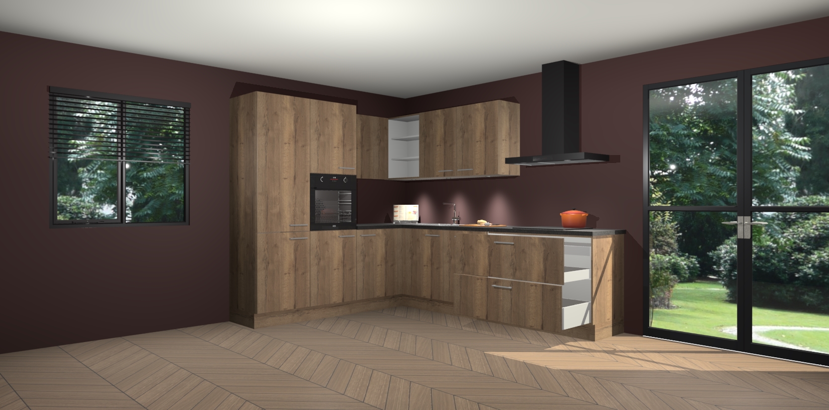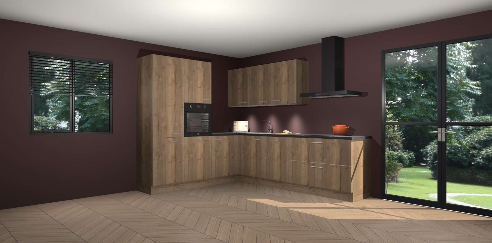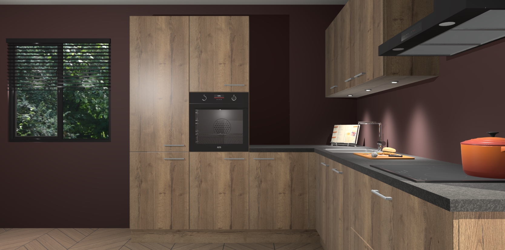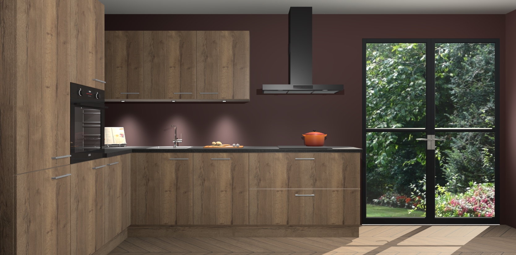 Maak kennis met de chocolade eiken keuken Parla - de perfecte aanvulling voor uw moderne keuken! Ervaar tijdloos design, elegantie en een chique uitstraling met onze zwarte handgrepen, soft-close deuren en veel opbergruimte. Dit alles wordt aangeboden tegen een vaste lage prijs voor ongeëvenaarde Duitse keukenkwaliteit!