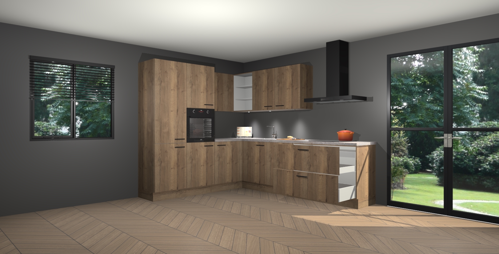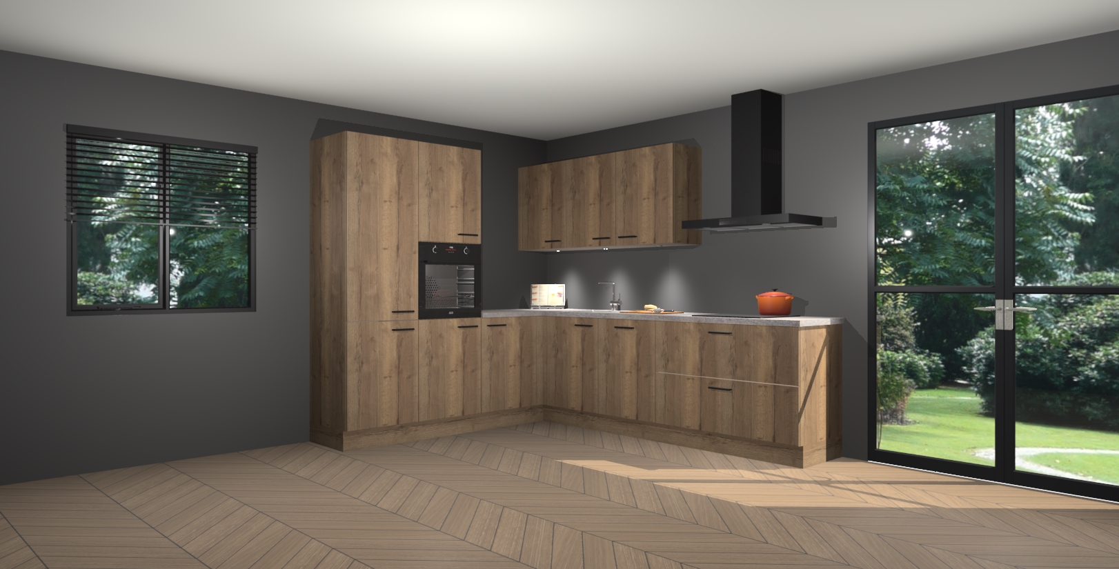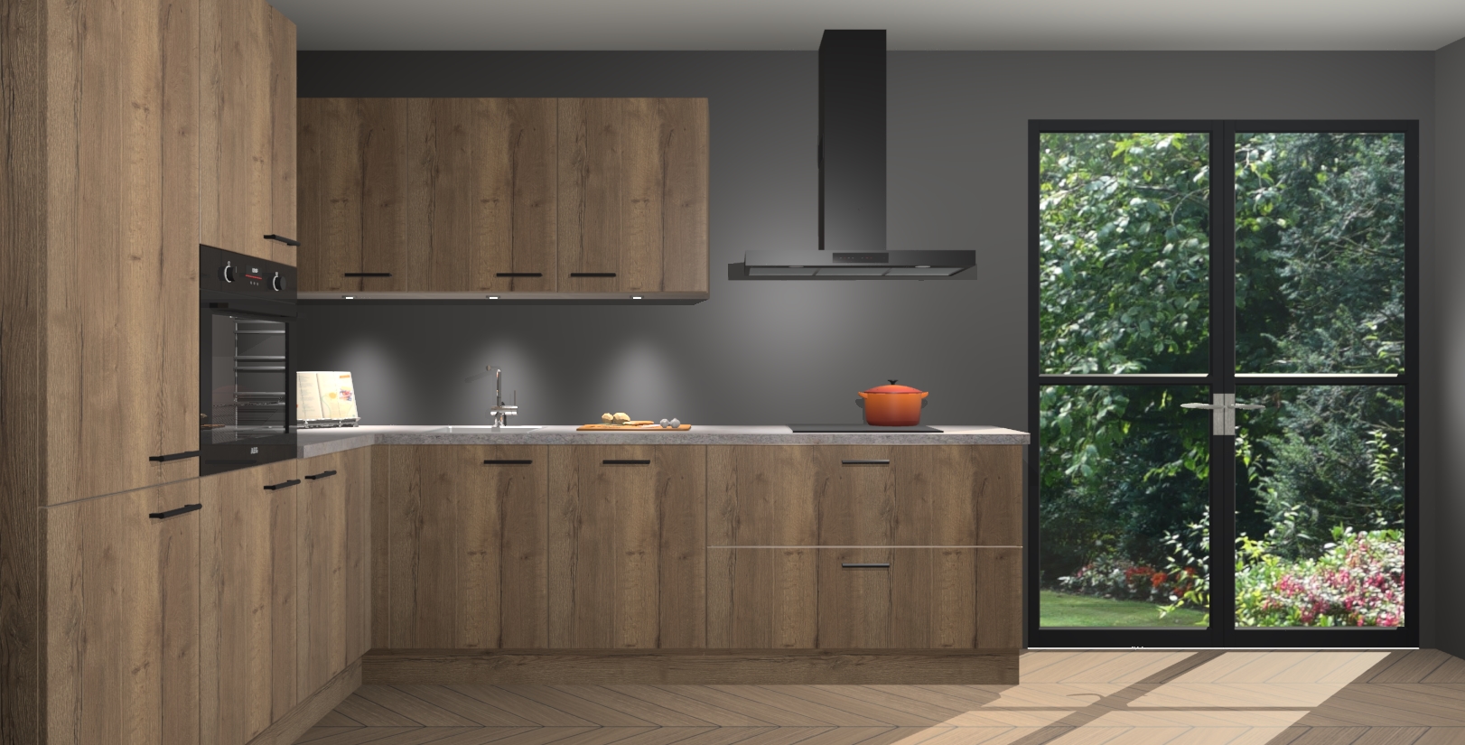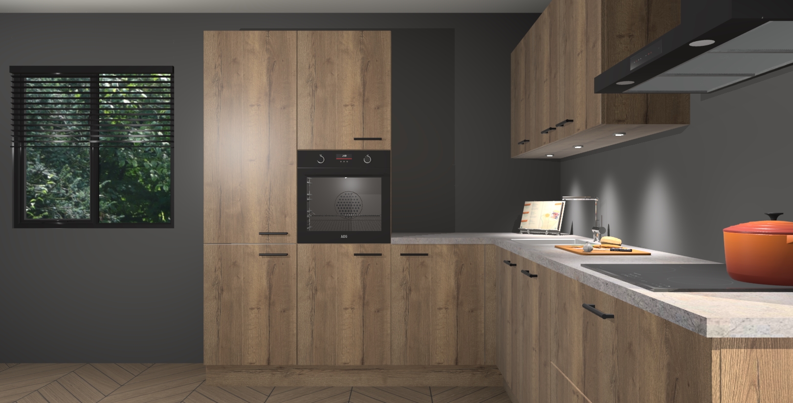 Maak kennis met de chocolade eiken keuken Parla - de perfecte aanvulling voor uw moderne keuken! Ervaar tijdloos design, elegantie en een chique uitstraling met onze zwarte handgrepen, soft-close deuren en veel opbergruimte. Dit alles wordt aangeboden tegen een vaste lage prijs voor ongeëvenaarde Duitse keukenkwaliteit!
