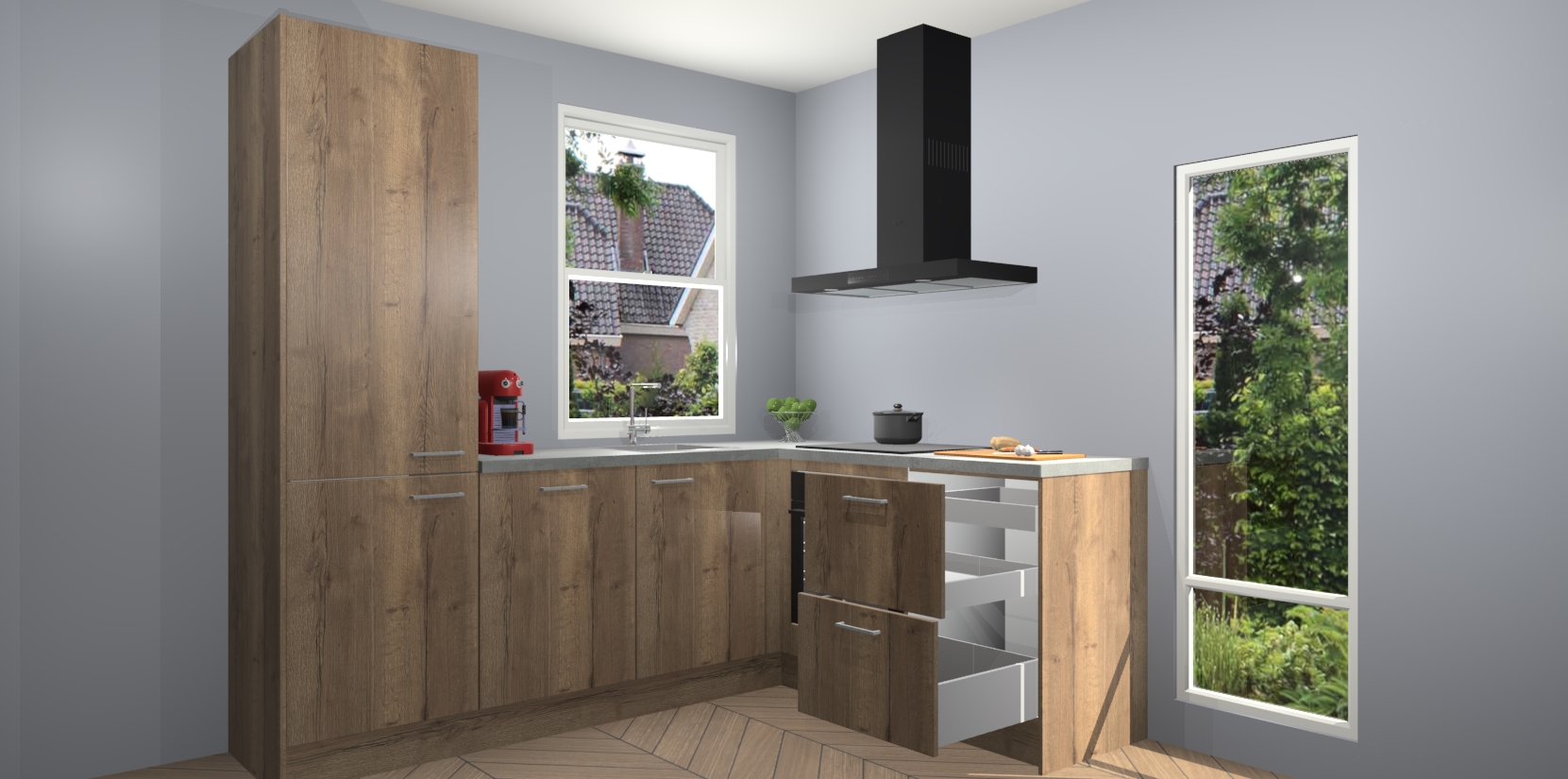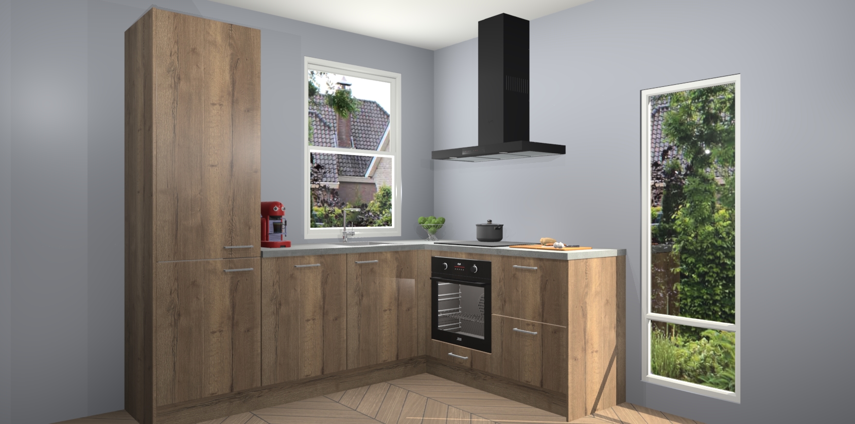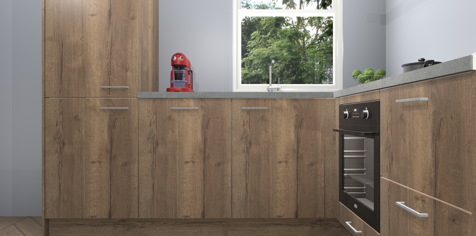 De prachtige Chocolade Eiken keuken Phuket is de perfecte keuze als u op zoek bent naar een moderne hoekkeuken met alle luxe en comfort die u kunt verwachten! De uitstraling in het houtlook-design draagt bij aan de warme sfeer die u nu al voelt wanneer u er naar kijkt. Heeft u genoeg van ouderwetse keukens? Probeer dan direct deze moderne, mooie hoekkeukens en laat iedereen verbluft achter!