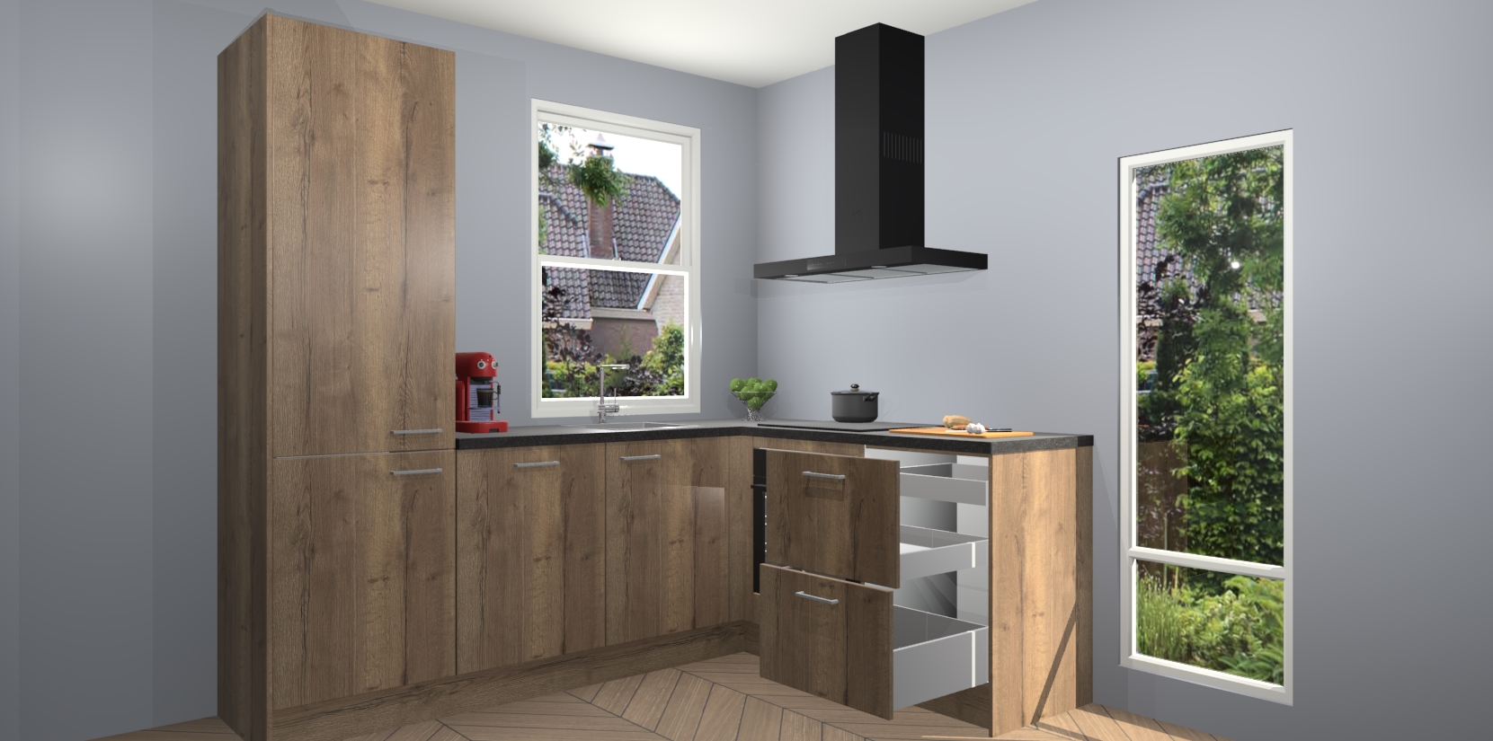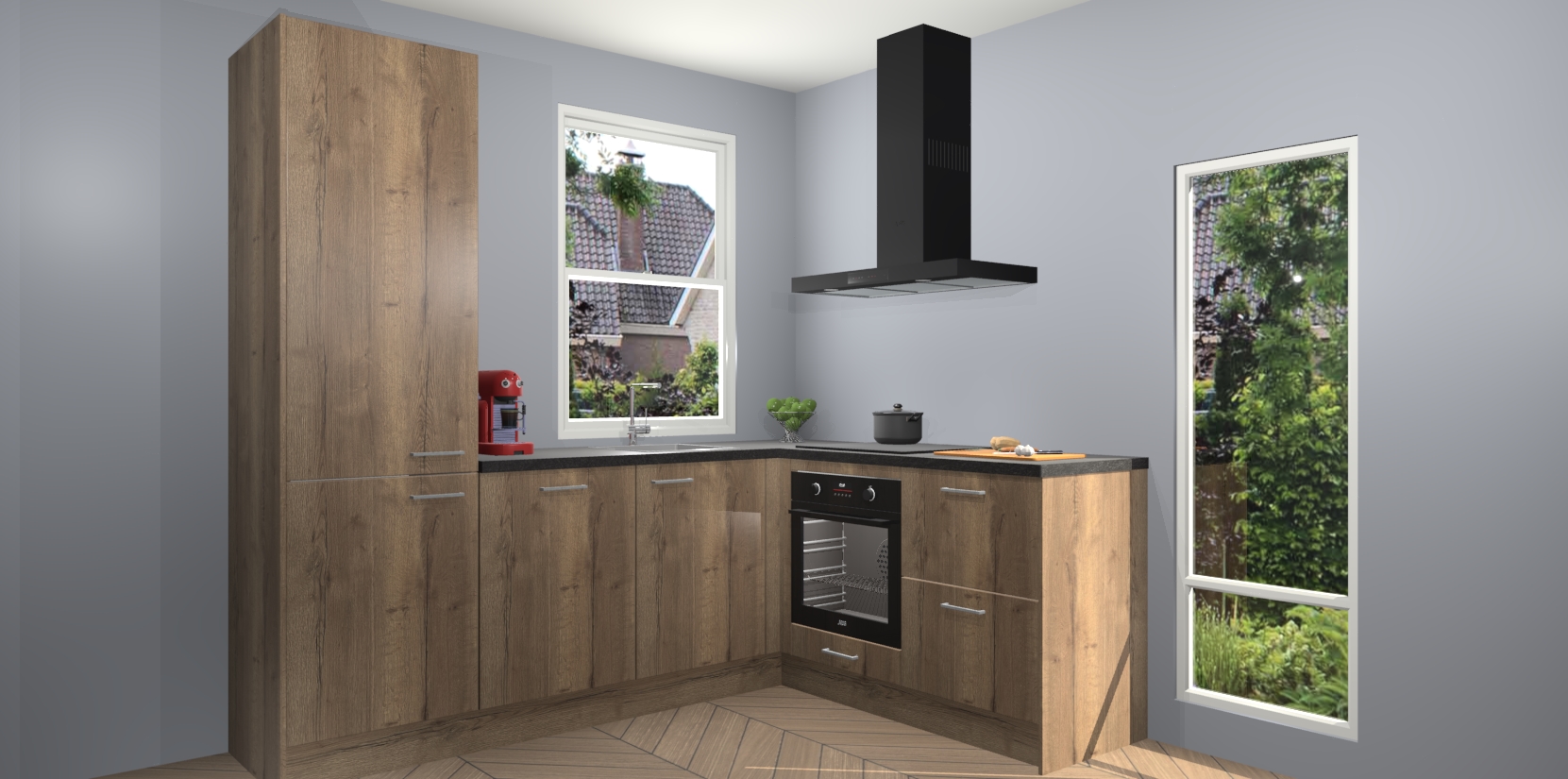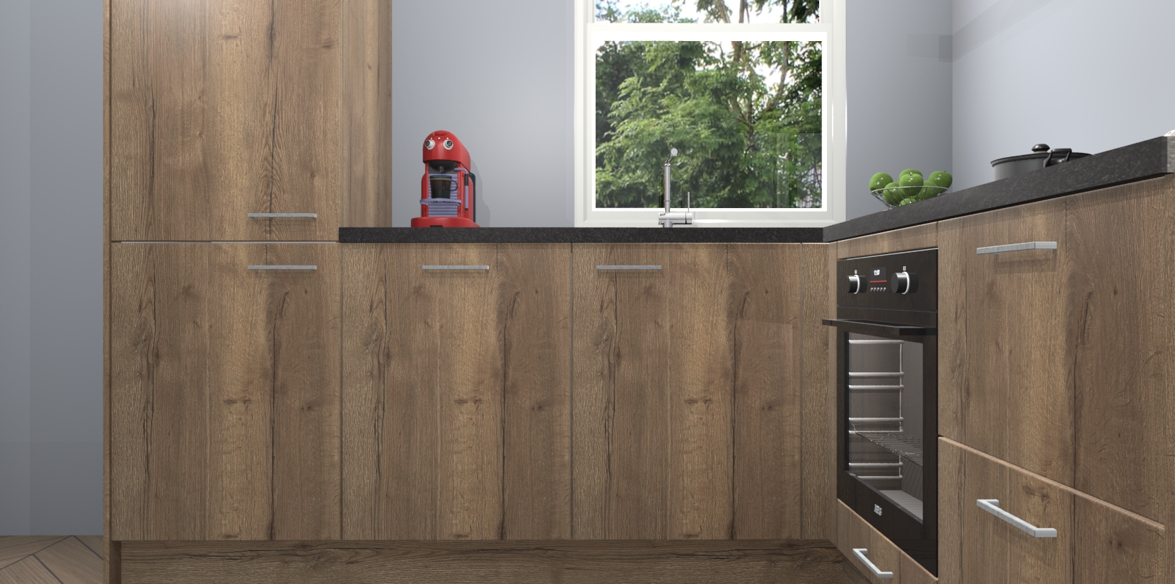 De prachtige Chocolade Eiken keuken Phuket is de perfecte keuze als u op zoek bent naar een moderne hoekkeuken met alle luxe en comfort die u kunt verwachten! De uitstraling in het houtlook-design draagt bij aan de warme sfeer die u nu al voelt wanneer u er naar kijkt. Heeft u genoeg van ouderwetse keukens? Probeer dan direct deze moderne, mooie hoekkeukens en laat iedereen verbluft achter!