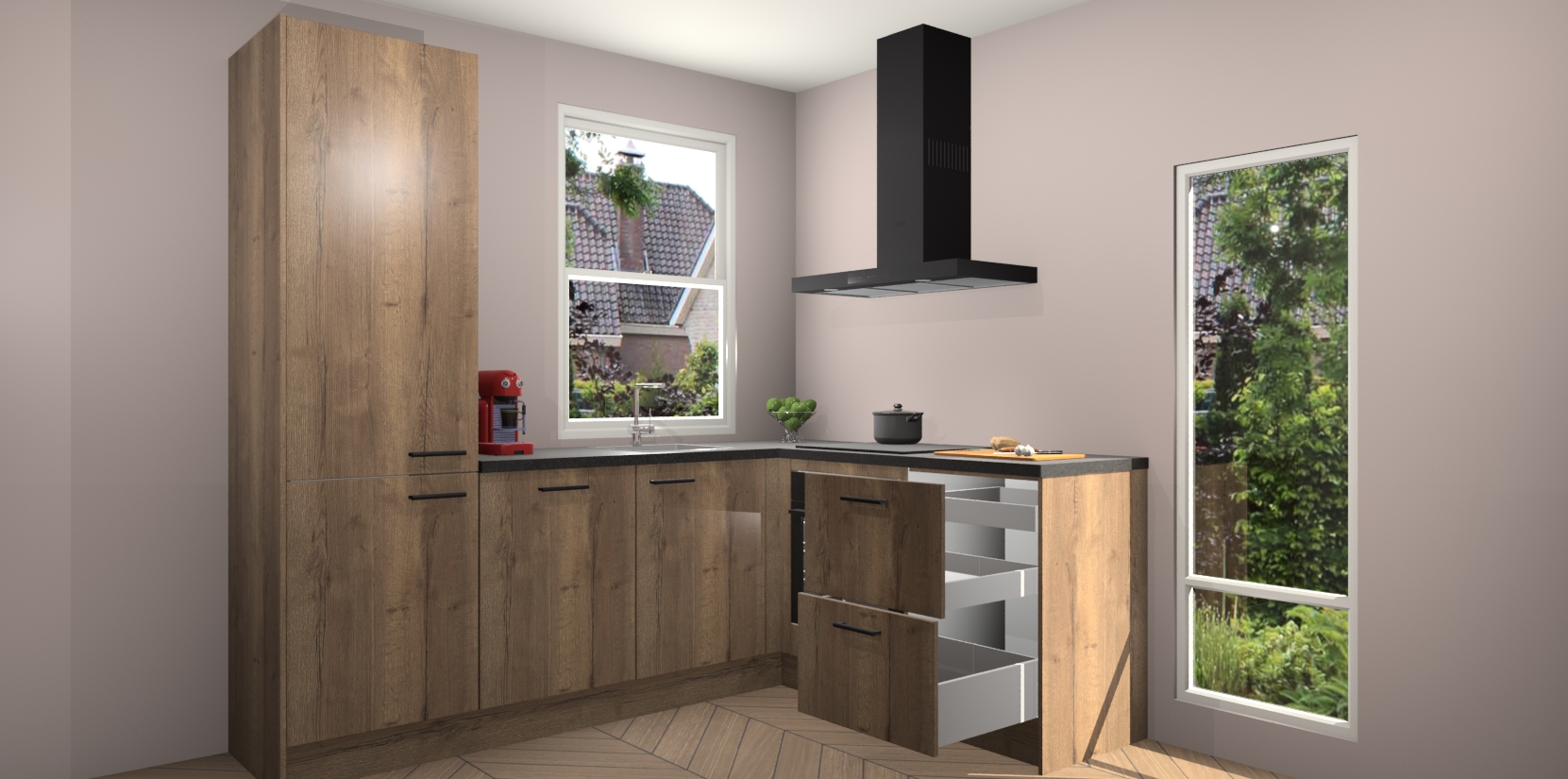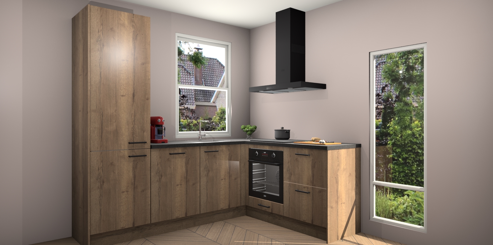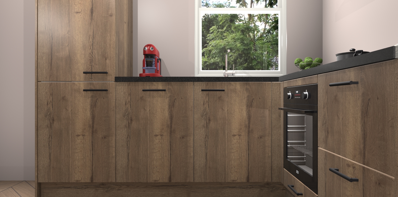 De prachtige Chocolade Eiken keuken Phuket is de perfecte keuze als u op zoek bent naar een moderne hoekkeuken met alle luxe en comfort die u kunt verwachten! De uitstraling in het houtlook-design draagt bij aan de warme sfeer die u nu al voelt wanneer u er naar kijkt. Heeft u genoeg van ouderwetse keukens? Probeer dan direct deze moderne, mooie hoekkeukens en laat iedereen verbluft achter!