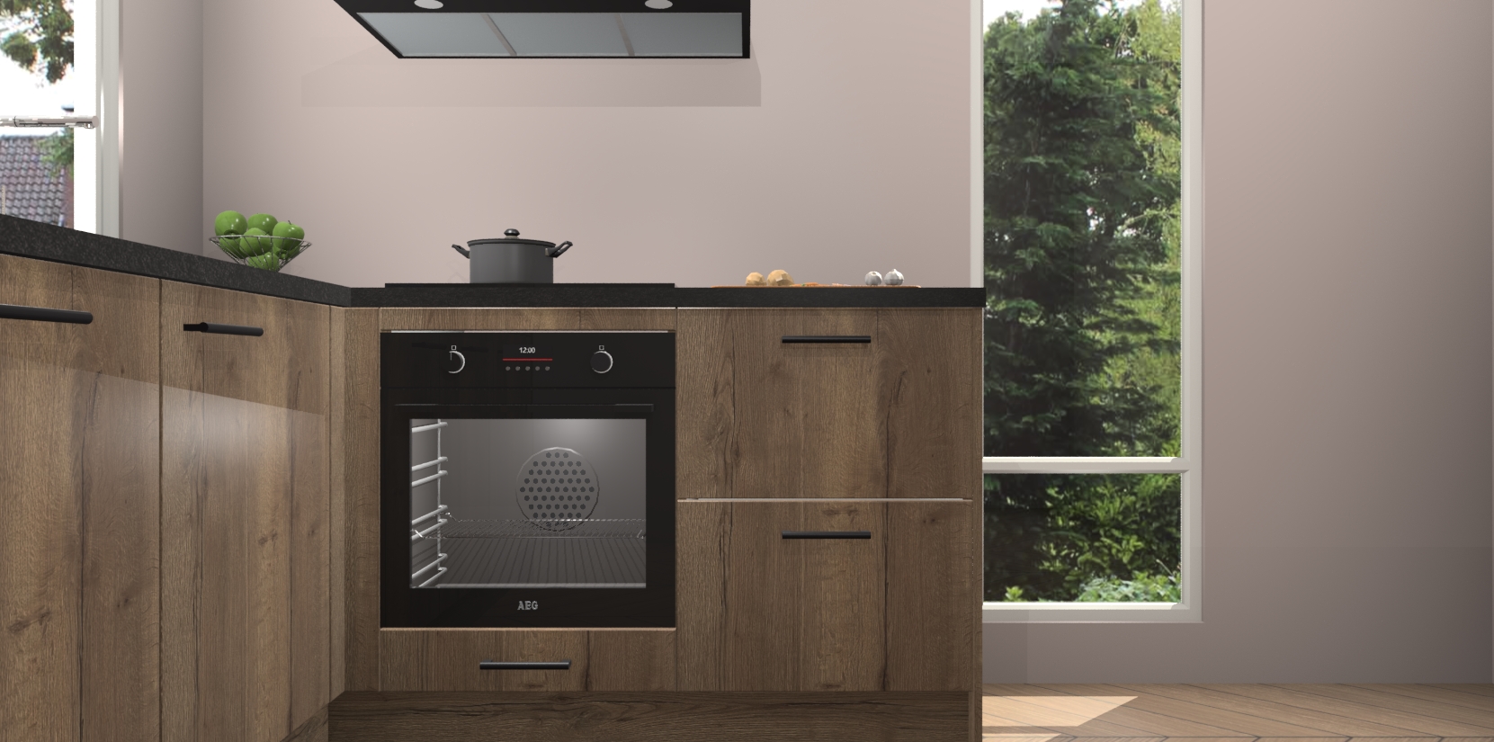 De Chocolade Eiken keuken Phuket heeft alles wat u maar kunt wensen. Niet alleen zijn er softclose deuren, maar ook 5 ingebouwde apparaten: een oven, inductiekookplaat, afzuigkap, vaatwasser en koelkast - waarbij u later gemakkelijk naar het AEG merk, van inductiekookplaat naar kookplaat met geïntegreerde afzuiging of van oven naar combimagnetron kunt upgraden. Dat alles tegen een vast laag tarief! Bovendien geeft de Chocolade Eiken keuken Phuket supersnelle levering van 7 weken. Echt iets voor u als u er niet op wilt wachten om het resultaat te zien in eigen keuken!