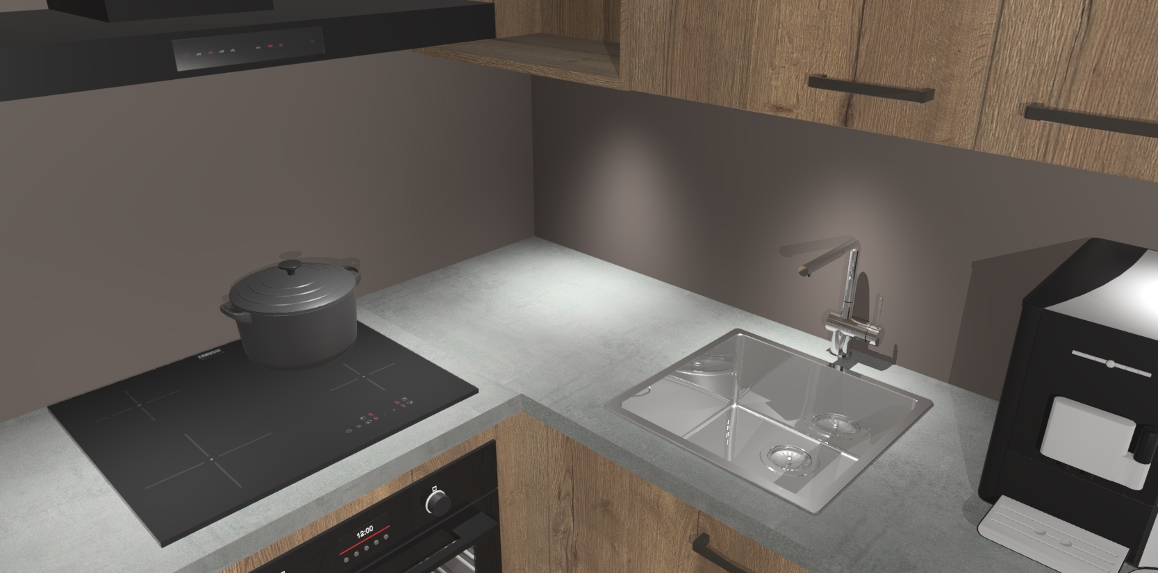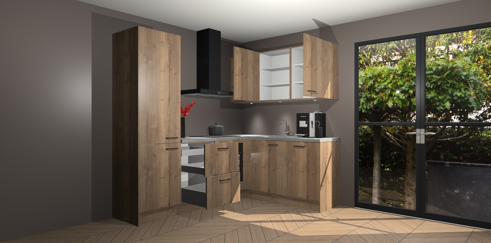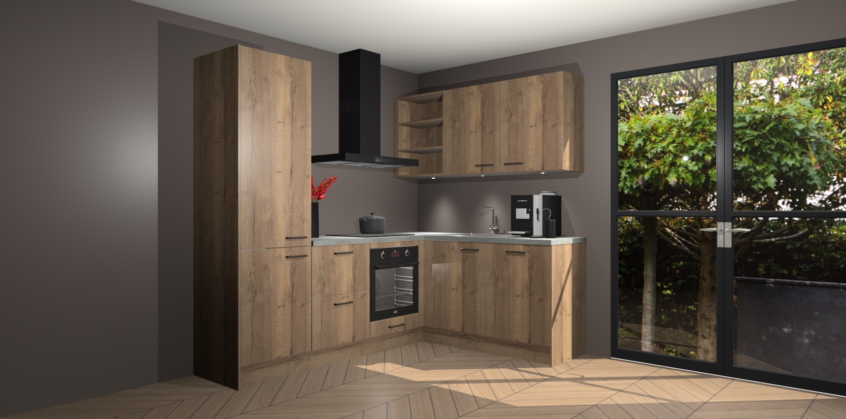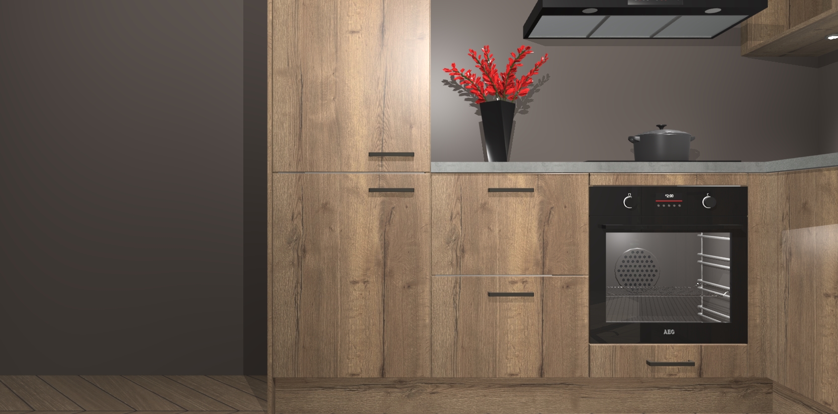 Wauw, dit is de Chocolade Eiken keuken Pilsen! U kunt gerust zeggen dat u elegantie combineert met functionaliteit met deze keuken. Met een modern en chique ontwerp is de keuken precies wat u nodig heeft om uw ruimte te verfraaien. De binnenzijde van de kasten is in dezelfde donkere kleur als de buitenzijde voor een uniforme look, compleet met softclose-kasten die stil sluiten.