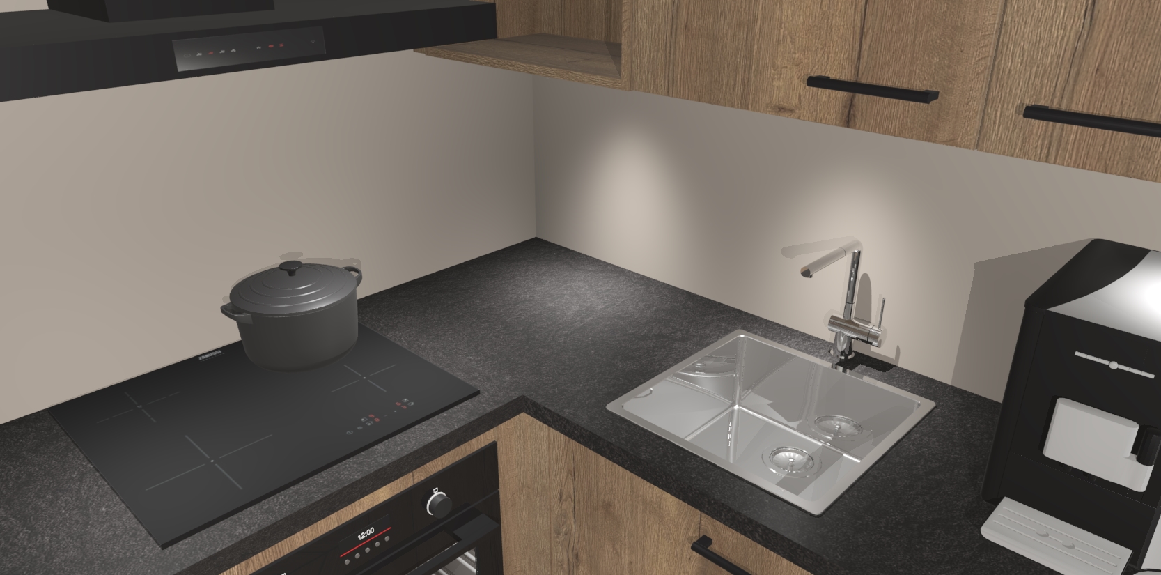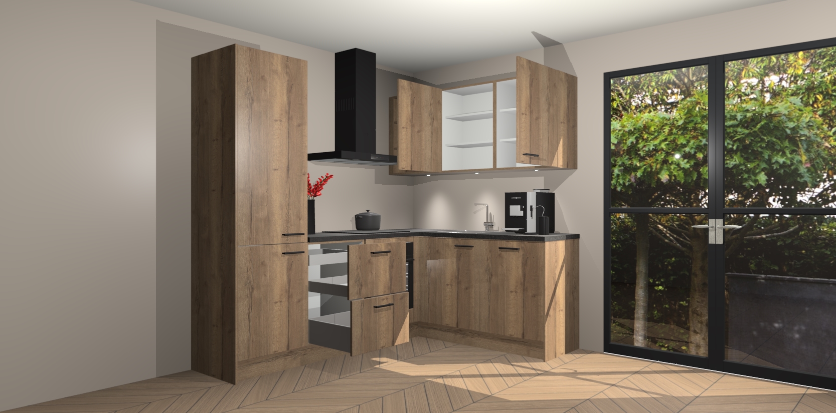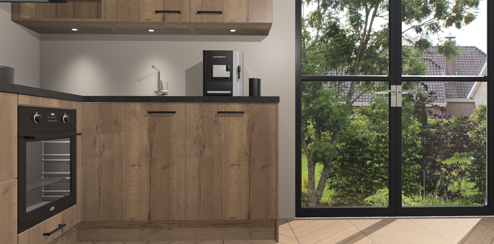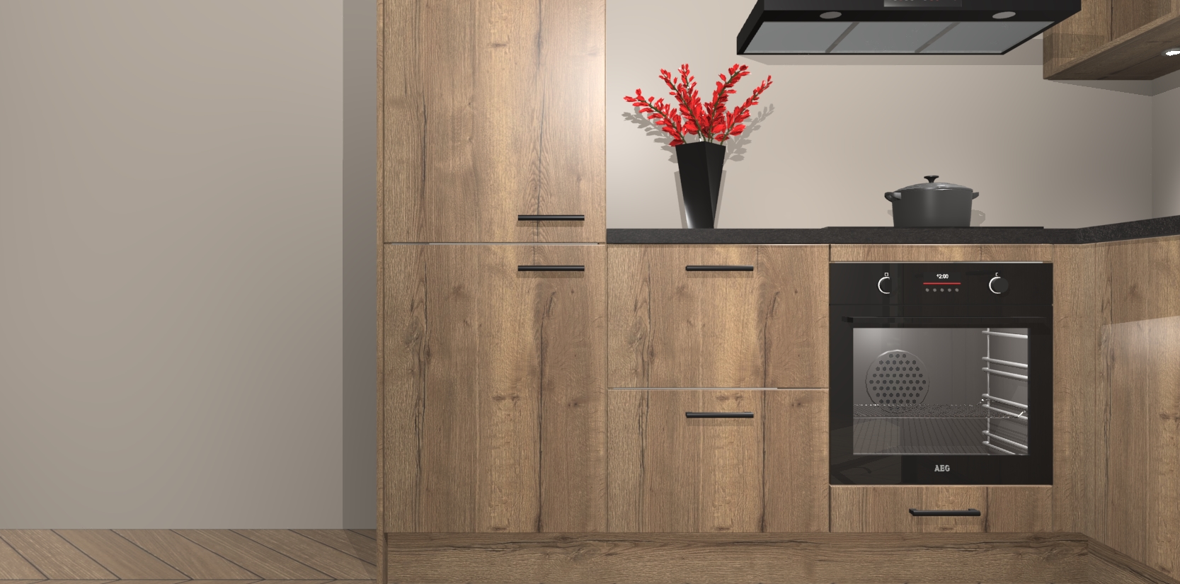 Wauw, dit is de Chocolade Eiken keuken Pilsen! U kunt gerust zeggen dat u elegantie combineert met functionaliteit met deze keuken. Met een modern en chique ontwerp is de keuken precies wat u nodig heeft om uw ruimte te verfraaien. De binnenzijde van de kasten is in dezelfde donkere kleur als de buitenzijde voor een uniforme look, compleet met softclose-kasten die stil sluiten.