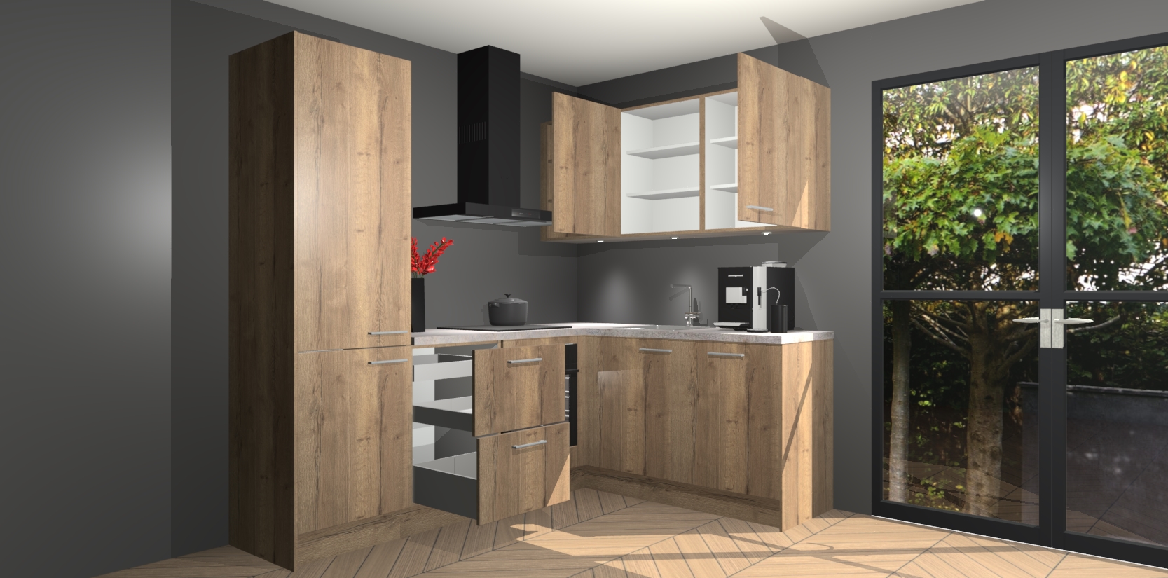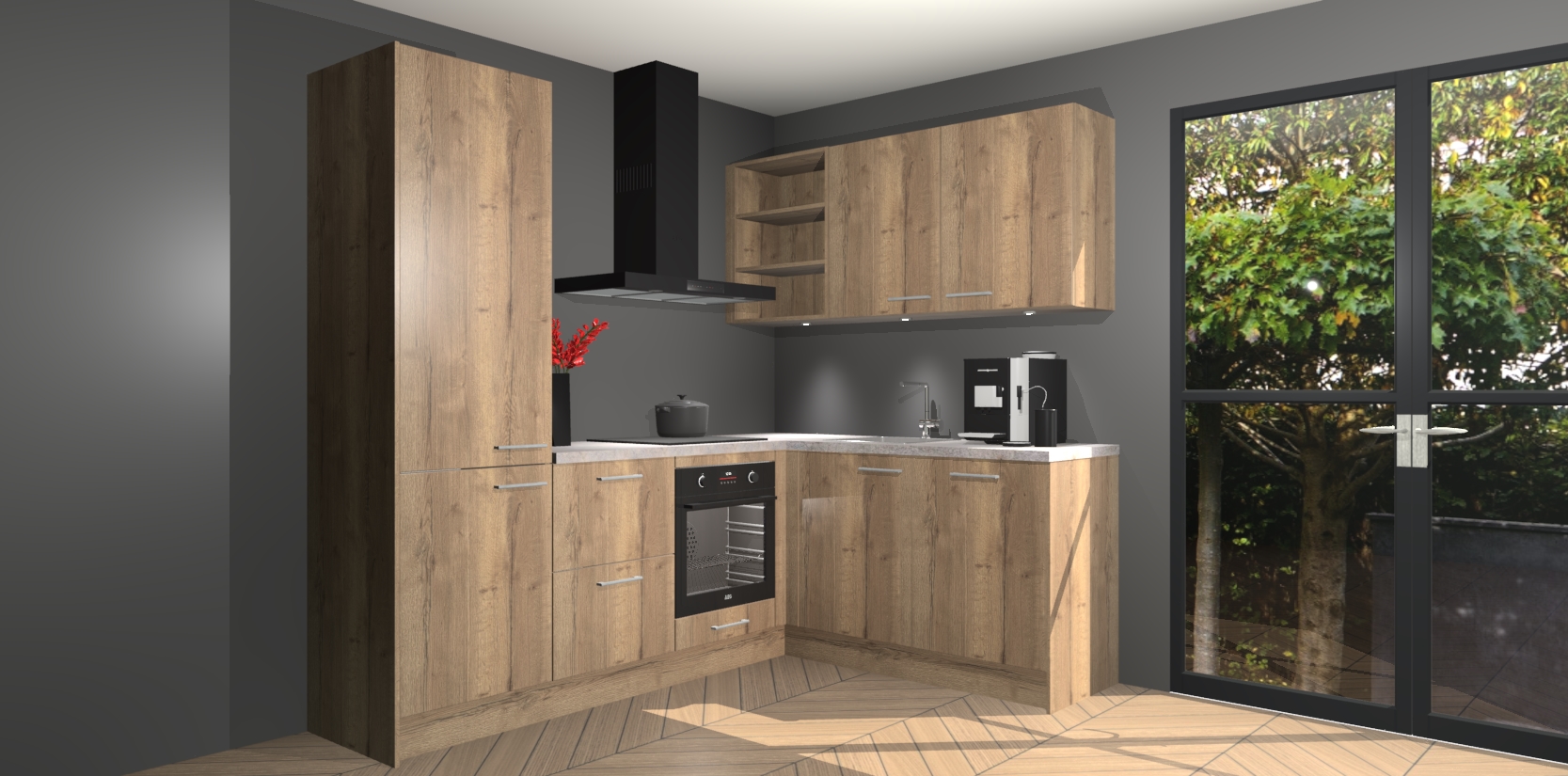 Wauw, dit is de Chocolade Eiken keuken Pilsen! U kunt gerust zeggen dat u elegantie combineert met functionaliteit met deze keuken. Met een modern en chique ontwerp is de keuken precies wat u nodig heeft om uw ruimte te verfraaien. De binnenzijde van de kasten is in dezelfde donkere kleur als de buitenzijde voor een uniforme look, compleet met softclose-kasten die stil sluiten.