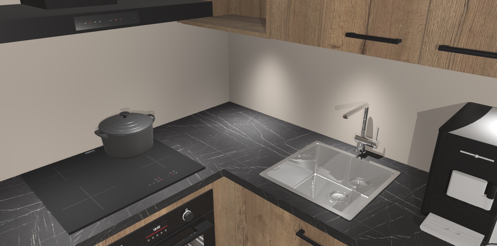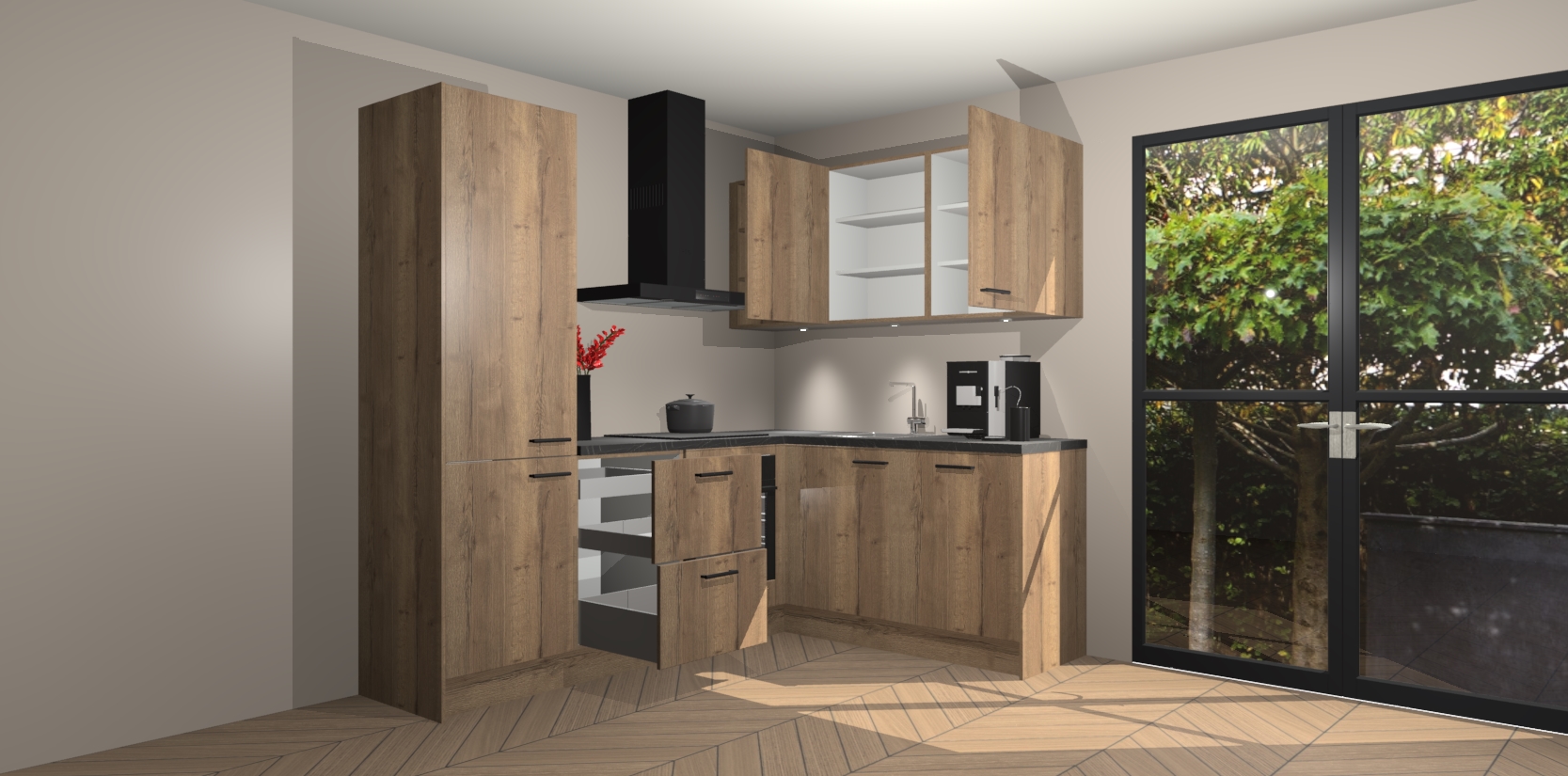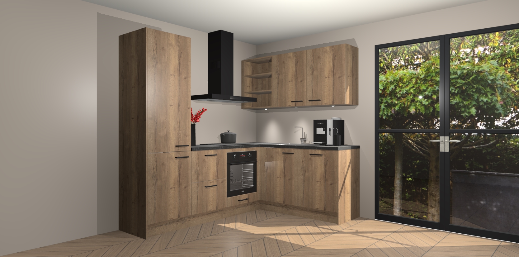Wauw, dit is de Chocolade Eiken keuken Pilsen! U kunt gerust zeggen dat u elegantie combineert met functionaliteit met deze keuken. Met een modern en chique ontwerp is de keuken precies wat u nodig heeft om uw ruimte te verfraaien. De binnenzijde van de kasten is in dezelfde donkere kleur als de buitenzijde voor een uniforme look, compleet met softclose-kasten die stil sluiten.