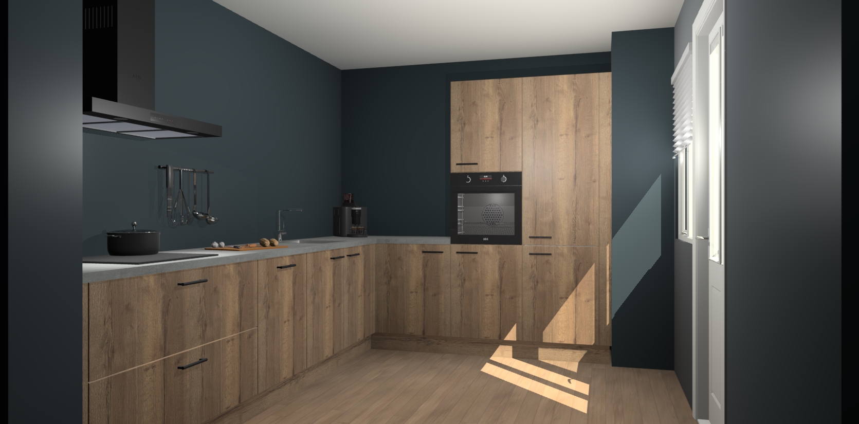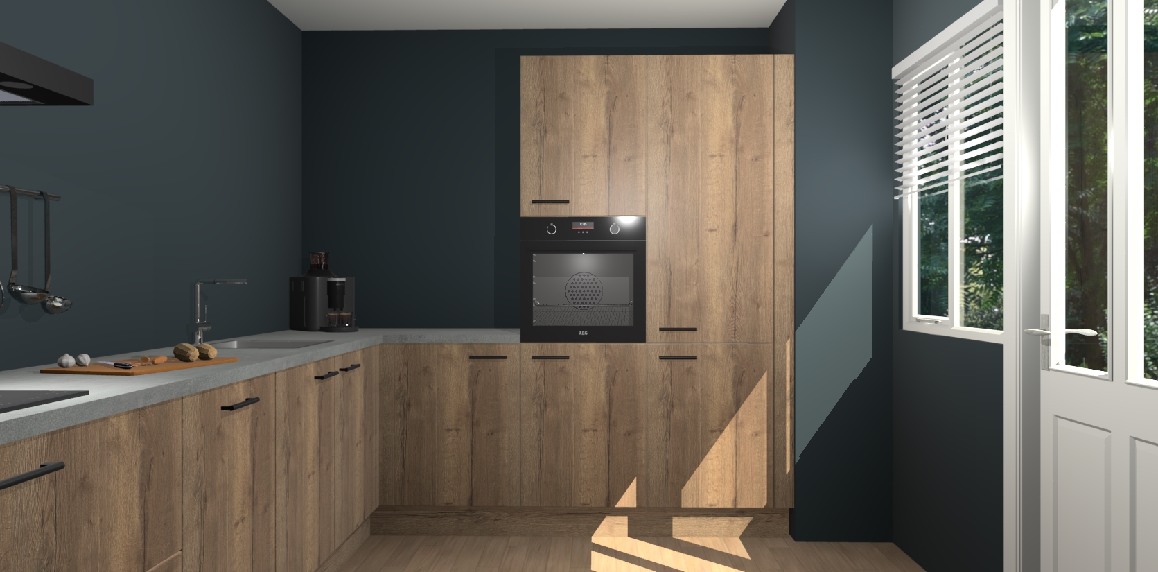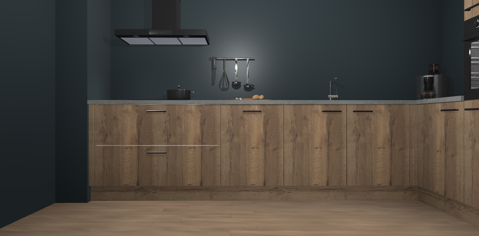 Welkom bij de Chocolade Eiken keuken Portland. Deze prachtige keuken zal de komende jaren het middelpunt van de belangstelling in uw huis zijn. Uitgerust met vijf inbouwapparaten komt u nooit kookgereedschap tekort. Bovendien geeft de warme houtlook elke ruimte een uitnodigende en tijdloze uitstraling.