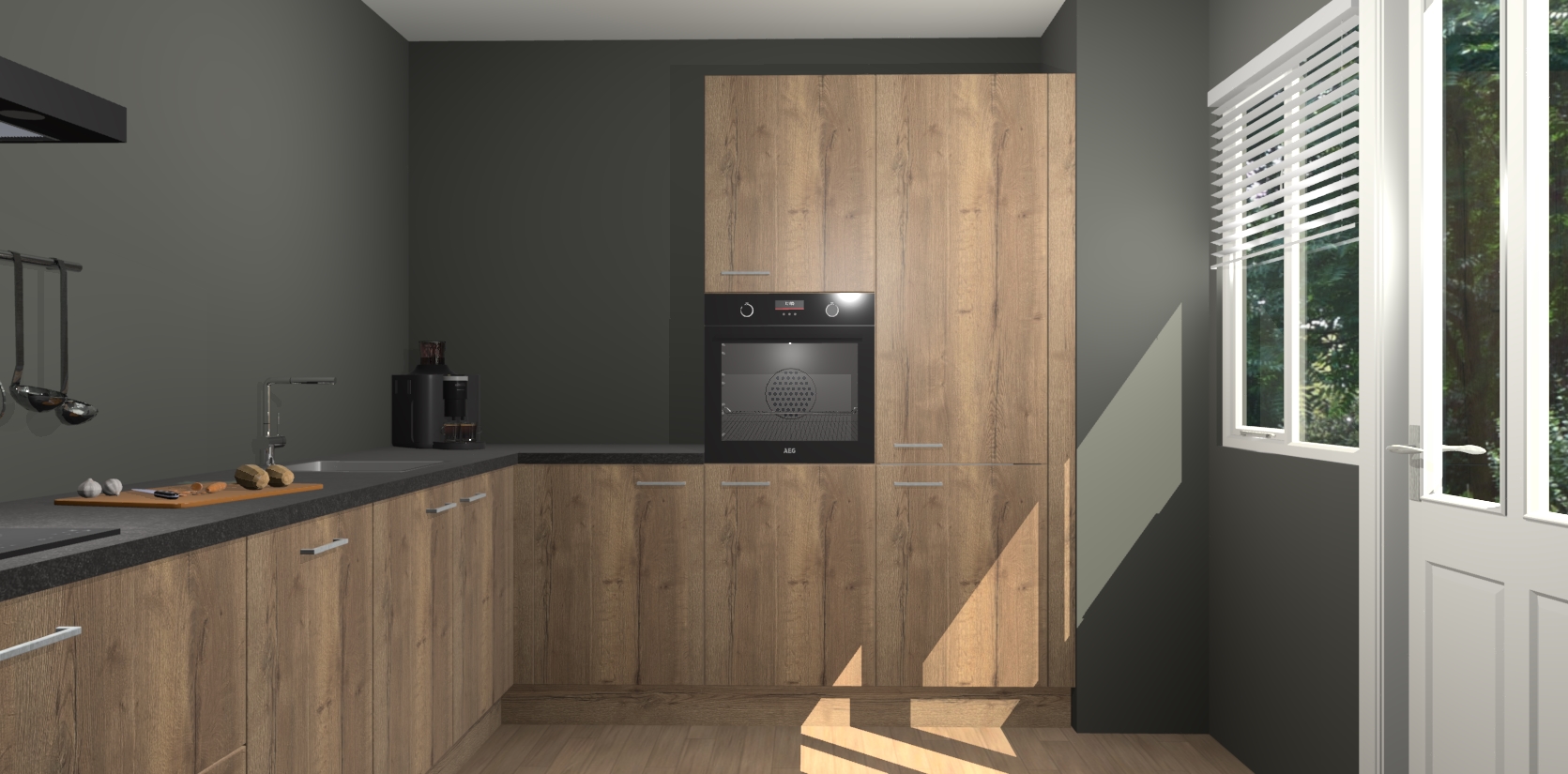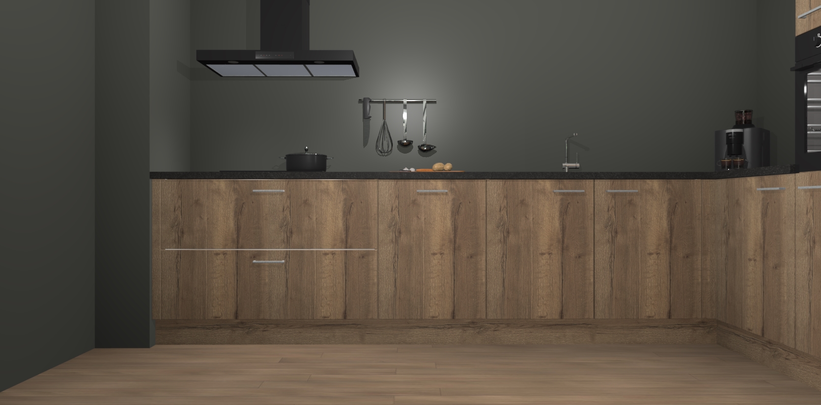 Welkom bij de Chocolade Eiken keuken Portland. Deze prachtige keuken zal de komende jaren het middelpunt van de belangstelling in uw huis zijn. Uitgerust met vijf inbouwapparaten komt u nooit kookgereedschap tekort. Bovendien geeft de warme houtlook elke ruimte een uitnodigende en tijdloze uitstraling.