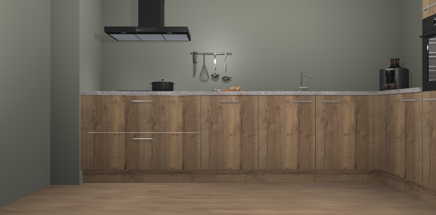 Welkom bij de Chocolade Eiken keuken Portland. Deze prachtige keuken zal de komende jaren het middelpunt van de belangstelling in uw huis zijn. Uitgerust met vijf inbouwapparaten komt u nooit kookgereedschap tekort. Bovendien geeft de warme houtlook elke ruimte een uitnodigende en tijdloze uitstraling.