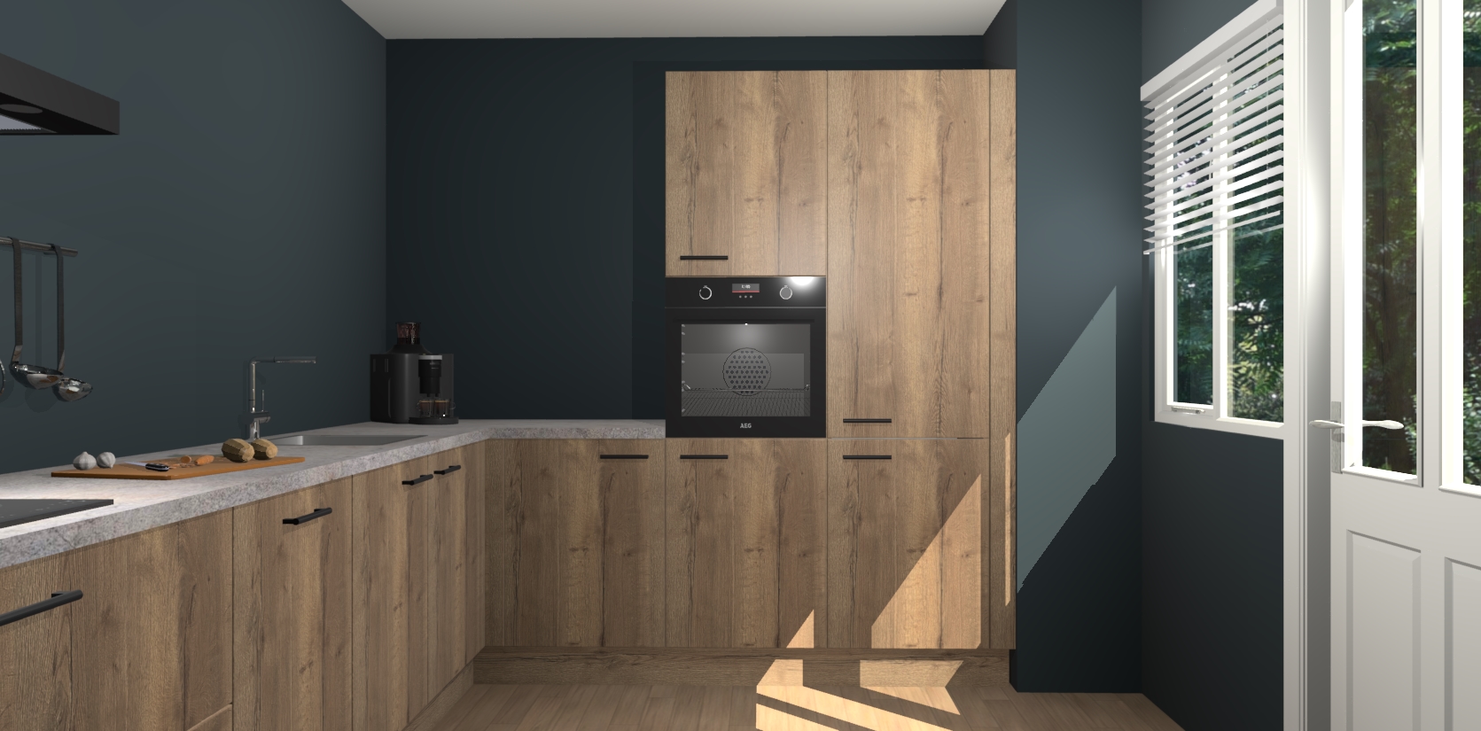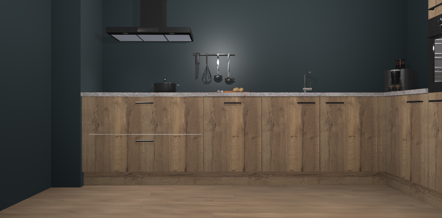 Welkom bij de Chocolade Eiken keuken Portland. Deze prachtige keuken zal de komende jaren het middelpunt van de belangstelling in uw huis zijn. Uitgerust met vijf inbouwapparaten komt u nooit kookgereedschap tekort. Bovendien geeft de warme houtlook elke ruimte een uitnodigende en tijdloze uitstraling.