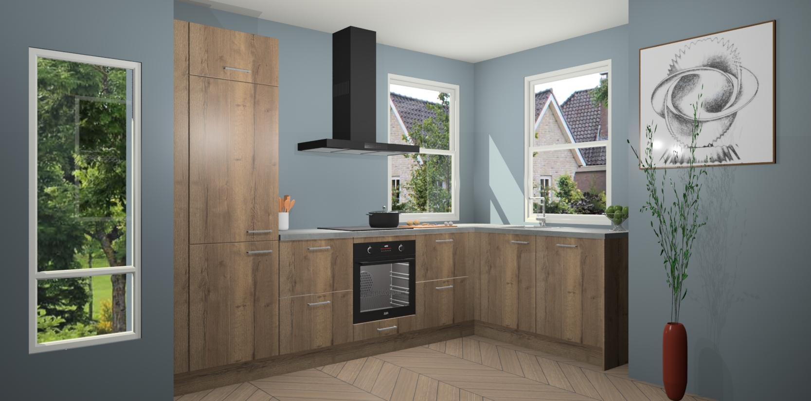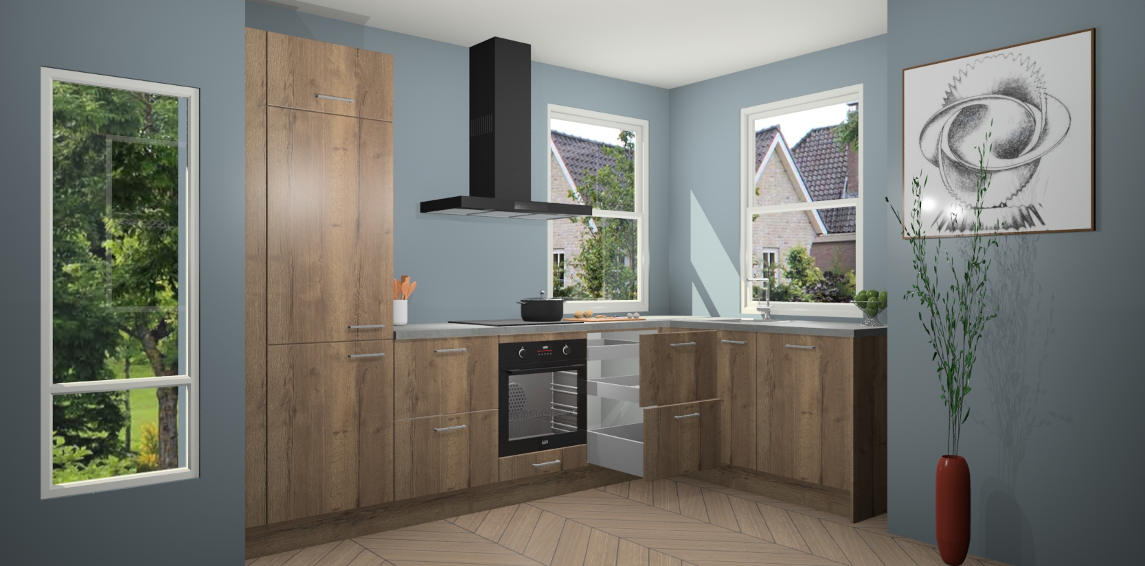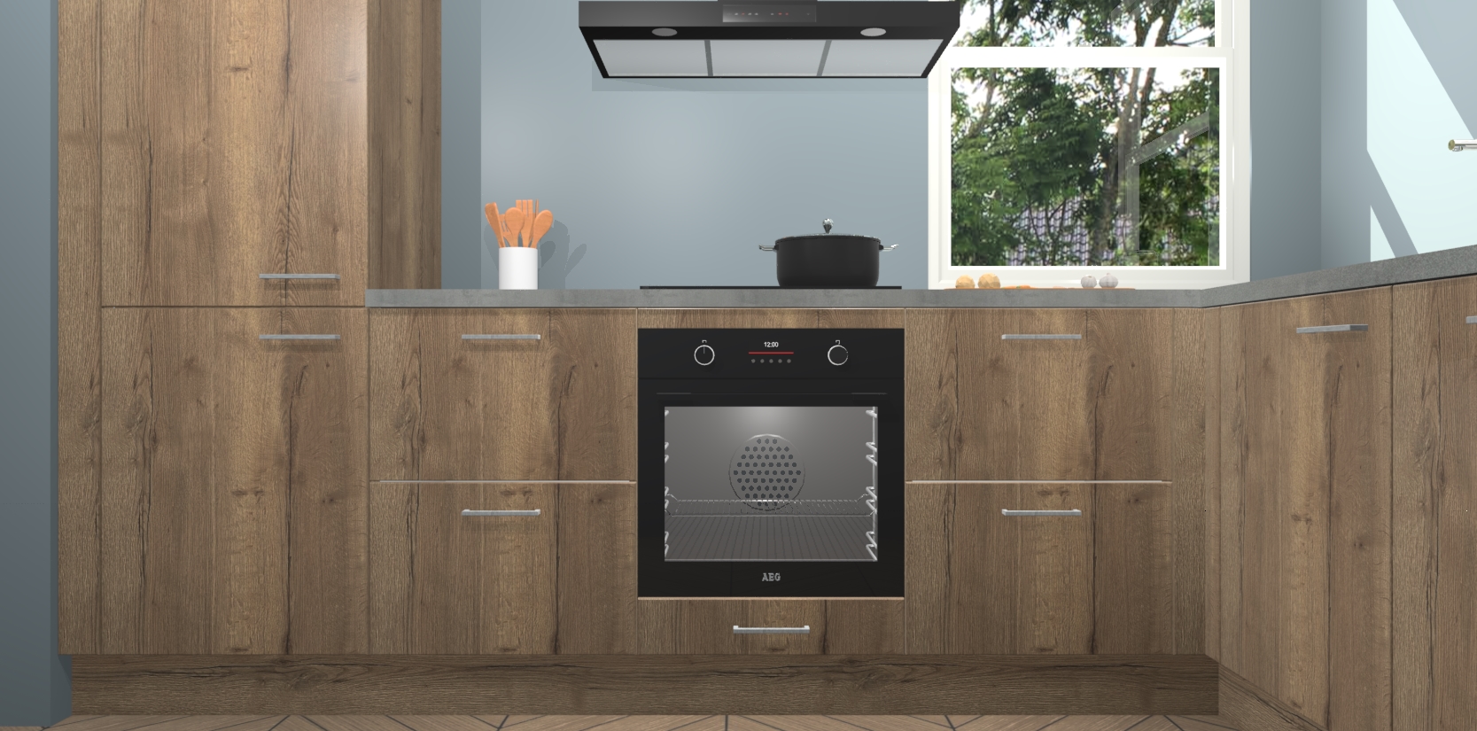 Wat maakt deze keuken zo bijzonder? Ten eerste geeft het houten werkblad uw ruimte een onmiskenbaar klassieke uitstraling. De natuurlijke afwerking roept warmte en elegantie op die nooit uit de mode zullen raken. Bovendien is het gemakkelijk schoon te houden en te onderhouden, zodat je er jarenlang plezier van kunt hebben. Als u op zoek bent naar extra gemak in uw keuken, dan heeft u bij het plaatsen van een bestelling bij ons ook de optie om uw toestellen te upgraden naar AEG-modellen - zo haalt u moderne innovatie van topmerken in apparatentechnologie rechtstreeks in huis.