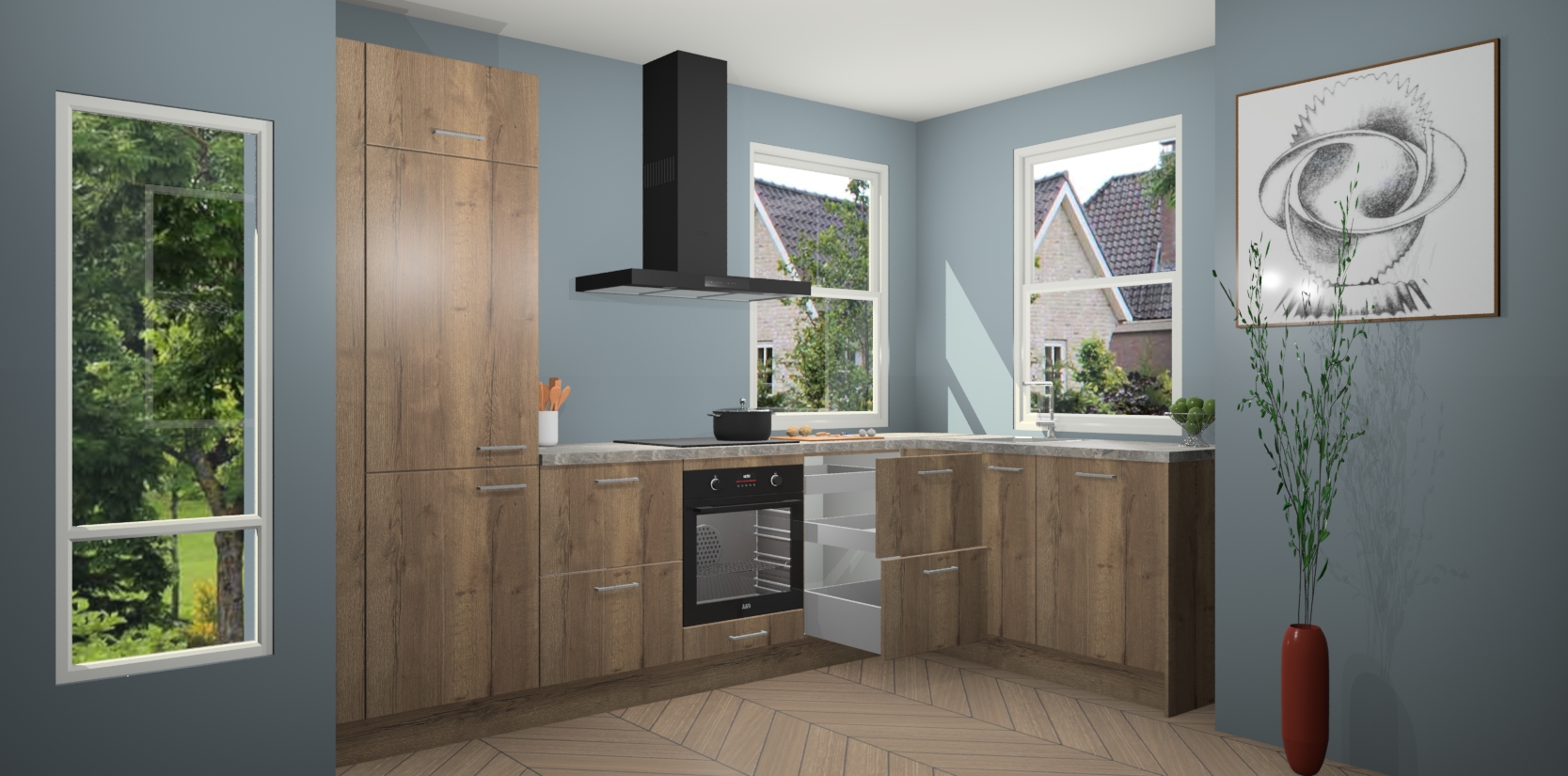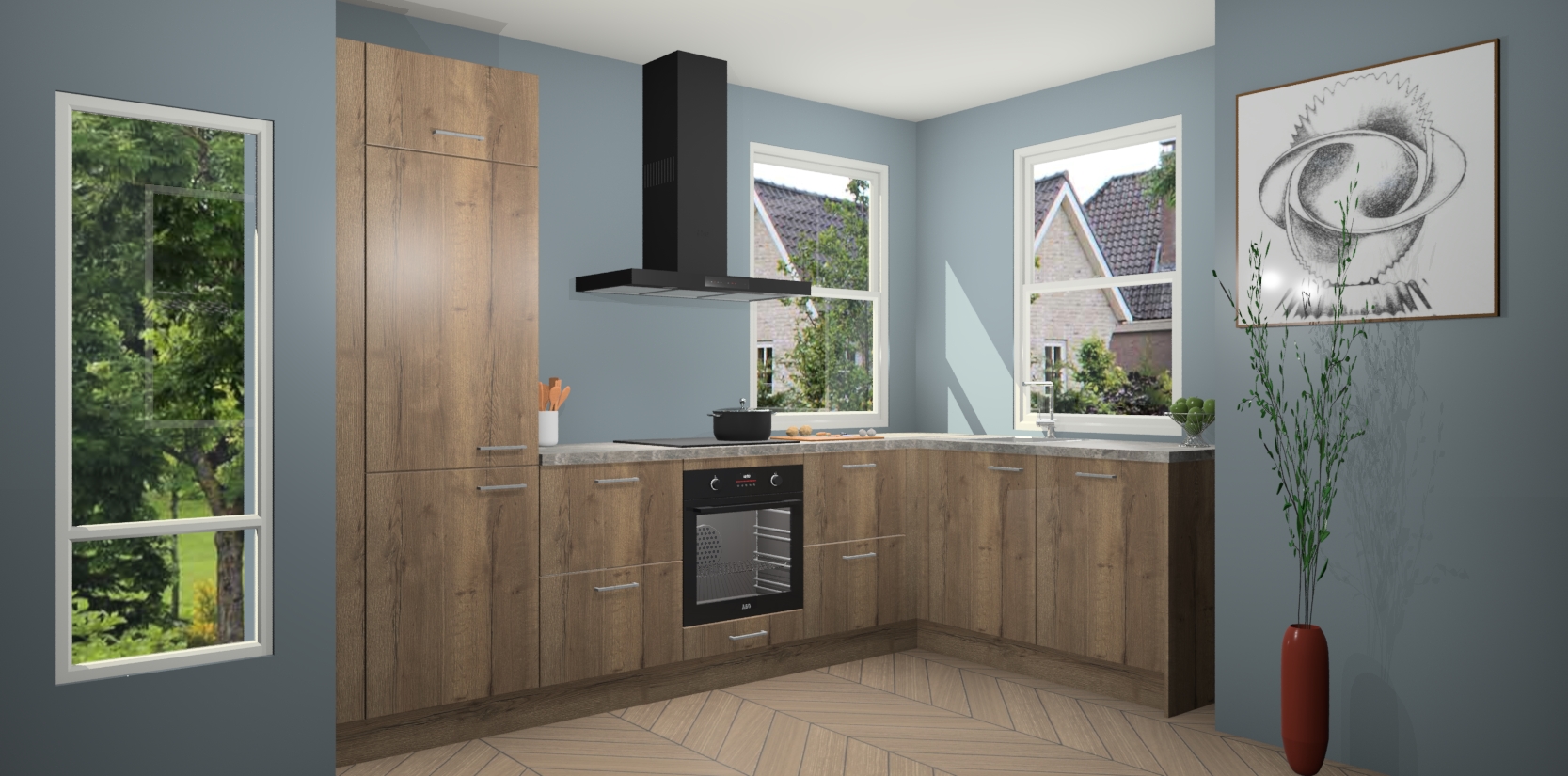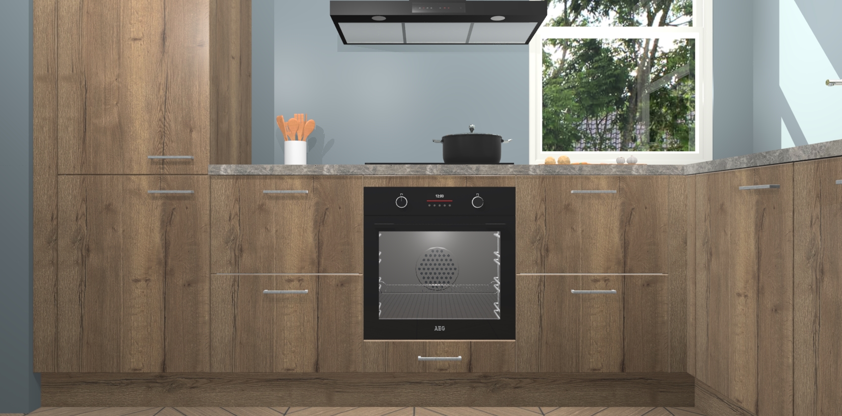 Wat maakt deze keuken zo bijzonder? Ten eerste geeft het houten werkblad uw ruimte een onmiskenbaar klassieke uitstraling. De natuurlijke afwerking roept warmte en elegantie op die nooit uit de mode zullen raken. Bovendien is het gemakkelijk schoon te houden en te onderhouden, zodat je er jarenlang plezier van kunt hebben. Als u op zoek bent naar extra gemak in uw keuken, dan heeft u bij het plaatsen van een bestelling bij ons ook de optie om uw toestellen te upgraden naar AEG-modellen - zo haalt u moderne innovatie van topmerken in apparatentechnologie rechtstreeks in huis.