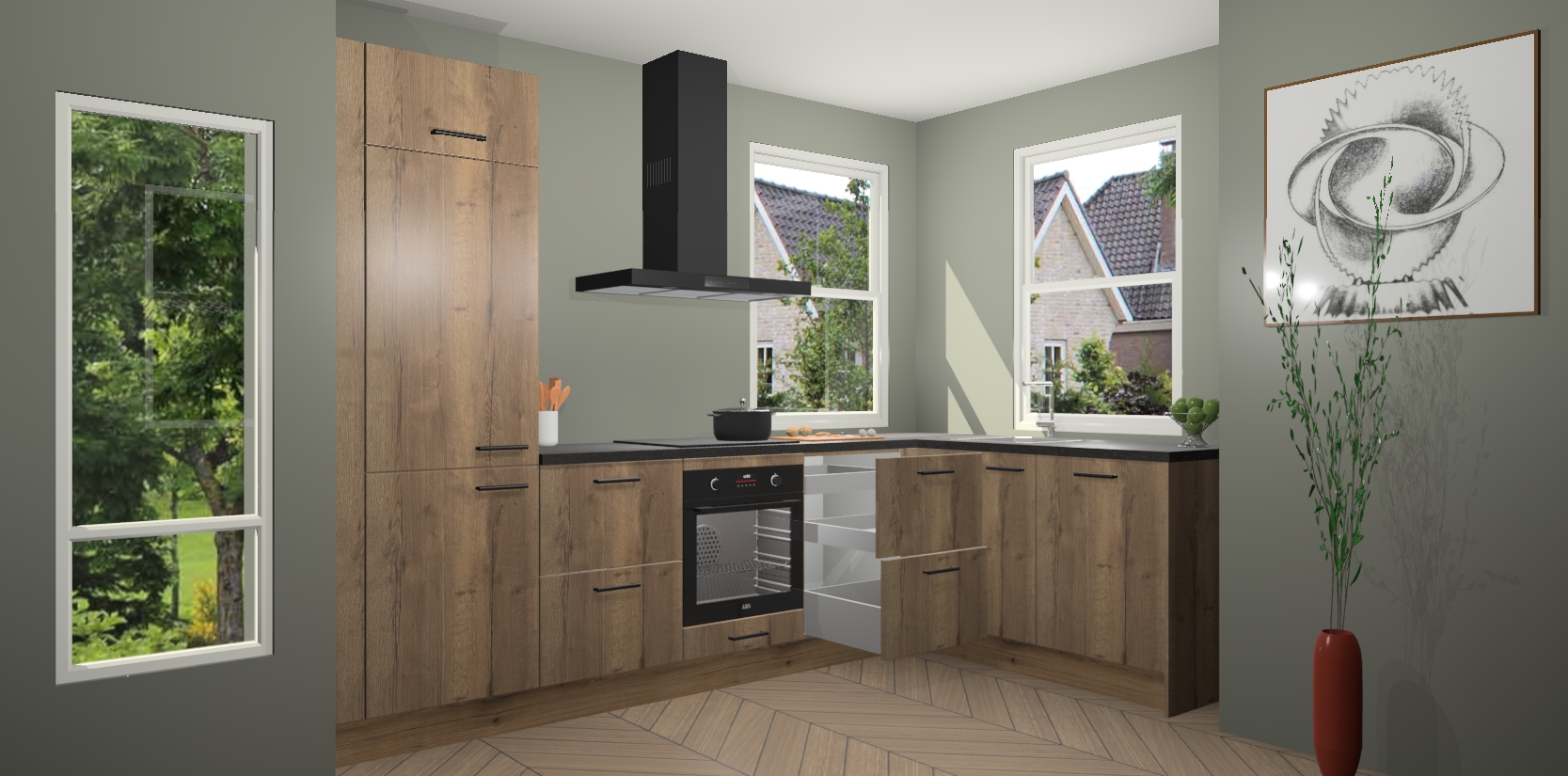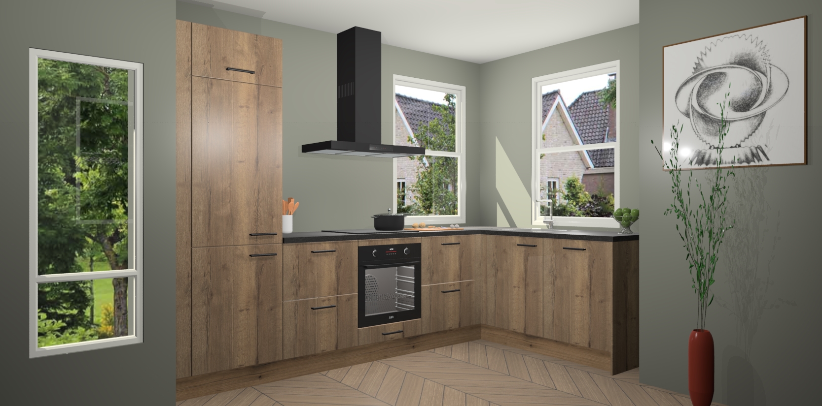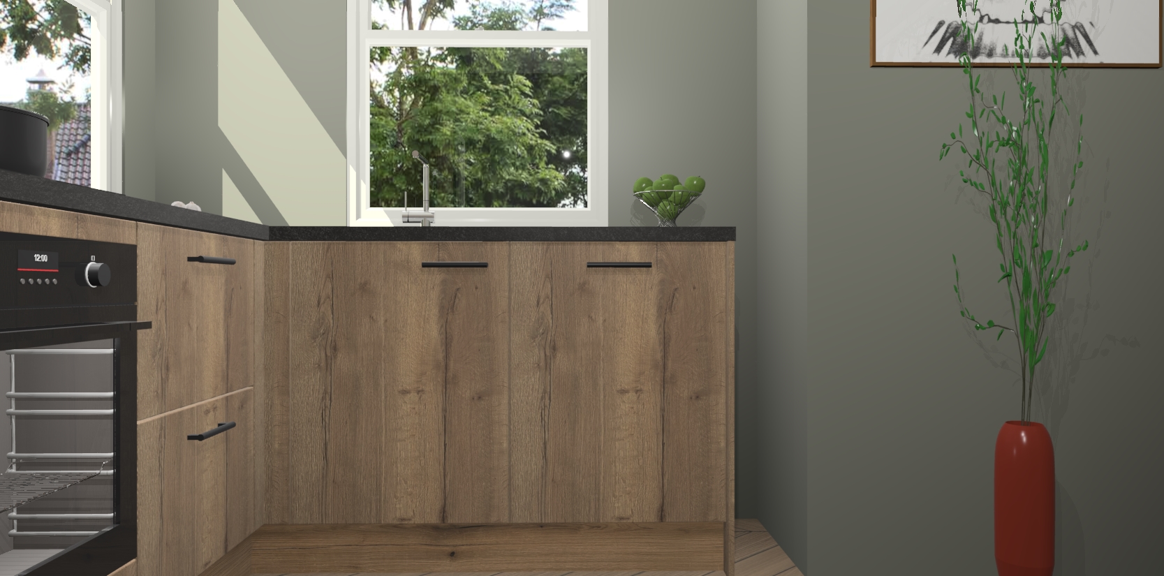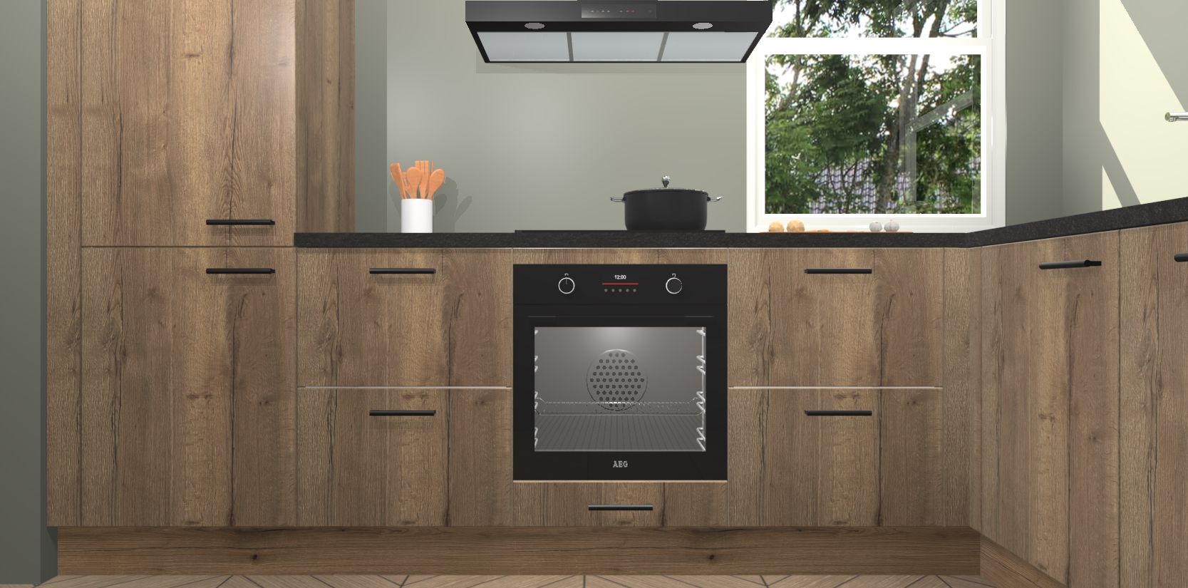 Wat maakt deze keuken zo bijzonder? Ten eerste geeft het houten werkblad uw ruimte een onmiskenbaar klassieke uitstraling. De natuurlijke afwerking roept warmte en elegantie op die nooit uit de mode zullen raken. Bovendien is het gemakkelijk schoon te houden en te onderhouden, zodat je er jarenlang plezier van kunt hebben. Als u op zoek bent naar extra gemak in uw keuken, dan heeft u bij het plaatsen van een bestelling bij ons ook de optie om uw toestellen te upgraden naar AEG-modellen - zo haalt u moderne innovatie van topmerken in apparatentechnologie rechtstreeks in huis.