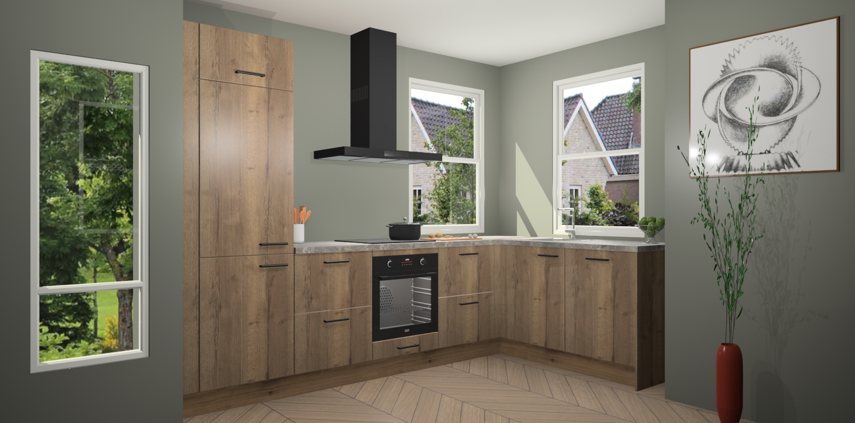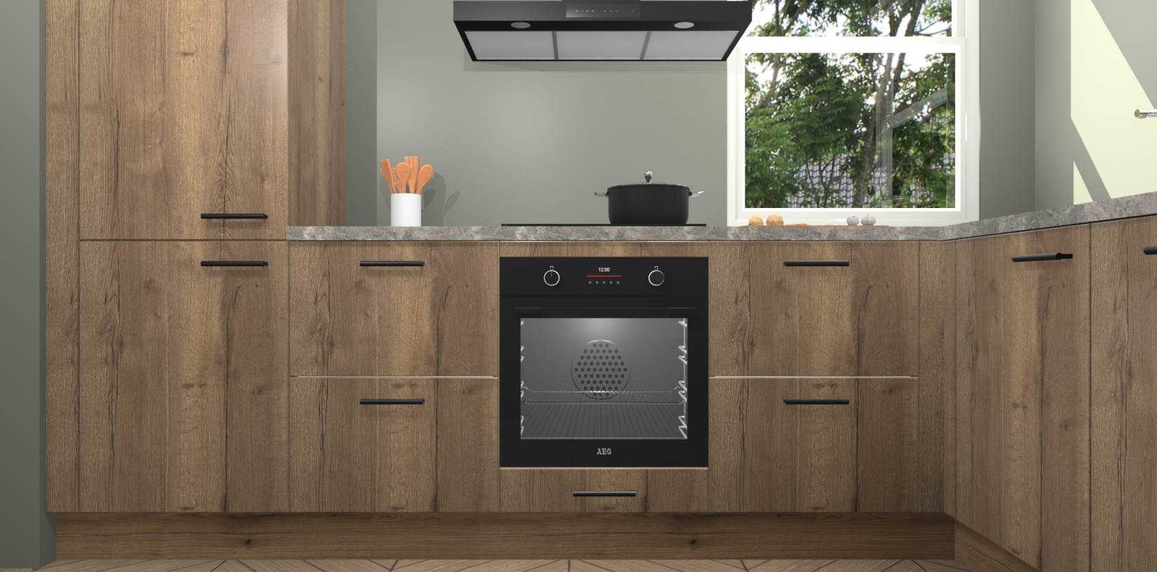 Wat maakt deze keuken zo bijzonder? Ten eerste geeft het houten werkblad uw ruimte een onmiskenbaar klassieke uitstraling. De natuurlijke afwerking roept warmte en elegantie op die nooit uit de mode zullen raken. Bovendien is het gemakkelijk schoon te houden en te onderhouden, zodat je er jarenlang plezier van kunt hebben. Als u op zoek bent naar extra gemak in uw keuken, dan heeft u bij het plaatsen van een bestelling bij ons ook de optie om uw toestellen te upgraden naar AEG-modellen - zo haalt u moderne innovatie van topmerken in apparatentechnologie rechtstreeks in huis.