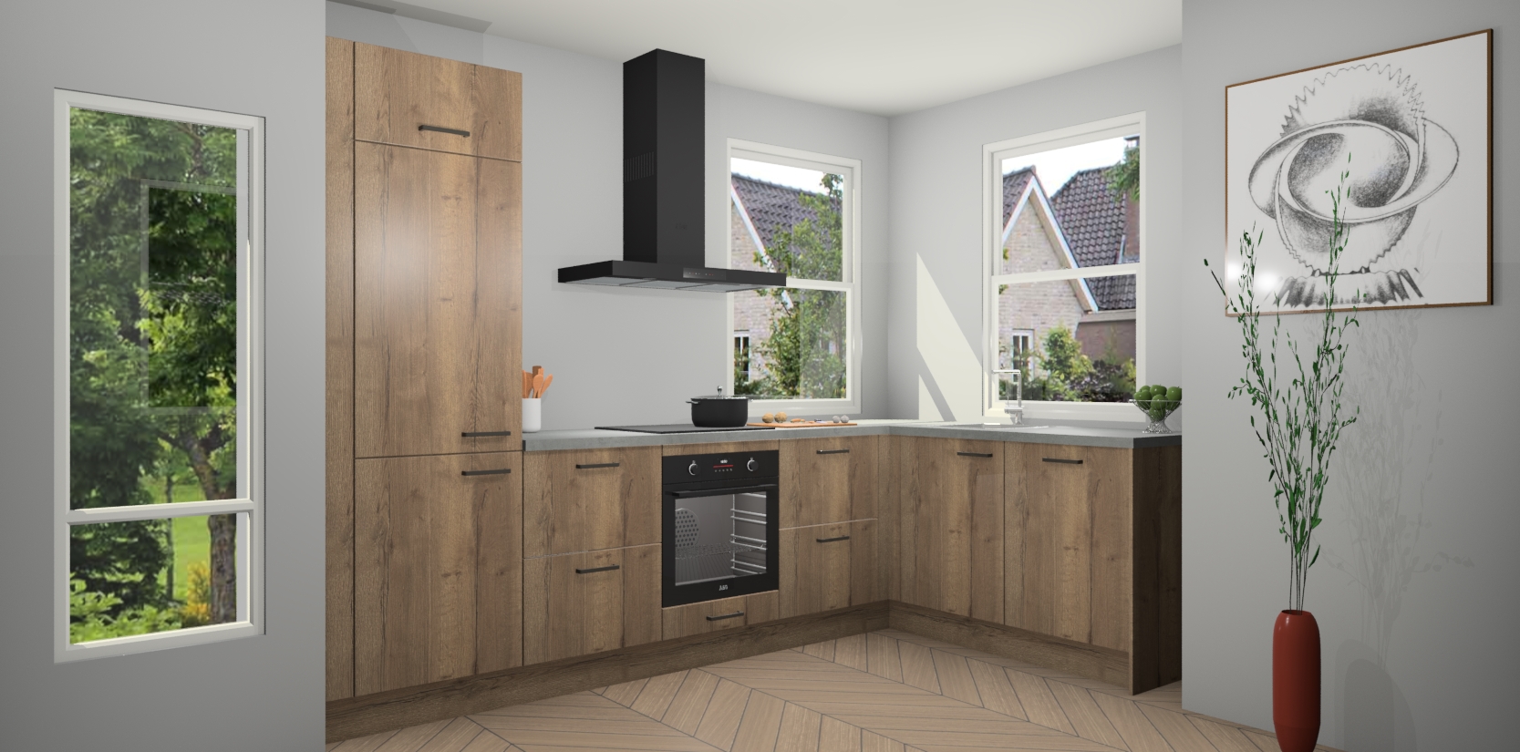 Wat maakt deze keuken zo bijzonder? Ten eerste geeft het houten werkblad uw ruimte een onmiskenbaar klassieke uitstraling. De natuurlijke afwerking roept warmte en elegantie op die nooit uit de mode zullen raken. Bovendien is het gemakkelijk schoon te houden en te onderhouden, zodat je er jarenlang plezier van kunt hebben. Als u op zoek bent naar extra gemak in uw keuken, dan heeft u bij het plaatsen van een bestelling bij ons ook de optie om uw toestellen te upgraden naar AEG-modellen - zo haalt u moderne innovatie van topmerken in apparatentechnologie rechtstreeks in huis.