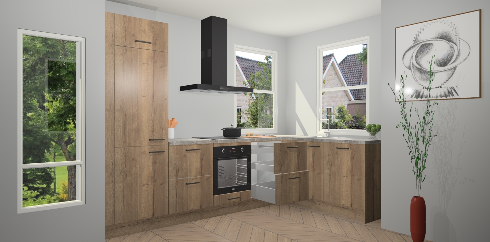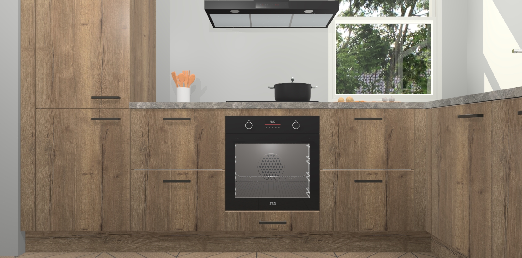 Wat maakt deze keuken zo bijzonder? Ten eerste geeft het houten werkblad uw ruimte een onmiskenbaar klassieke uitstraling. De natuurlijke afwerking roept warmte en elegantie op die nooit uit de mode zullen raken. Bovendien is het gemakkelijk schoon te houden en te onderhouden, zodat je er jarenlang plezier van kunt hebben. Als u op zoek bent naar extra gemak in uw keuken, dan heeft u bij het plaatsen van een bestelling bij ons ook de optie om uw toestellen te upgraden naar AEG-modellen - zo haalt u moderne innovatie van topmerken in apparatentechnologie rechtstreeks in huis.